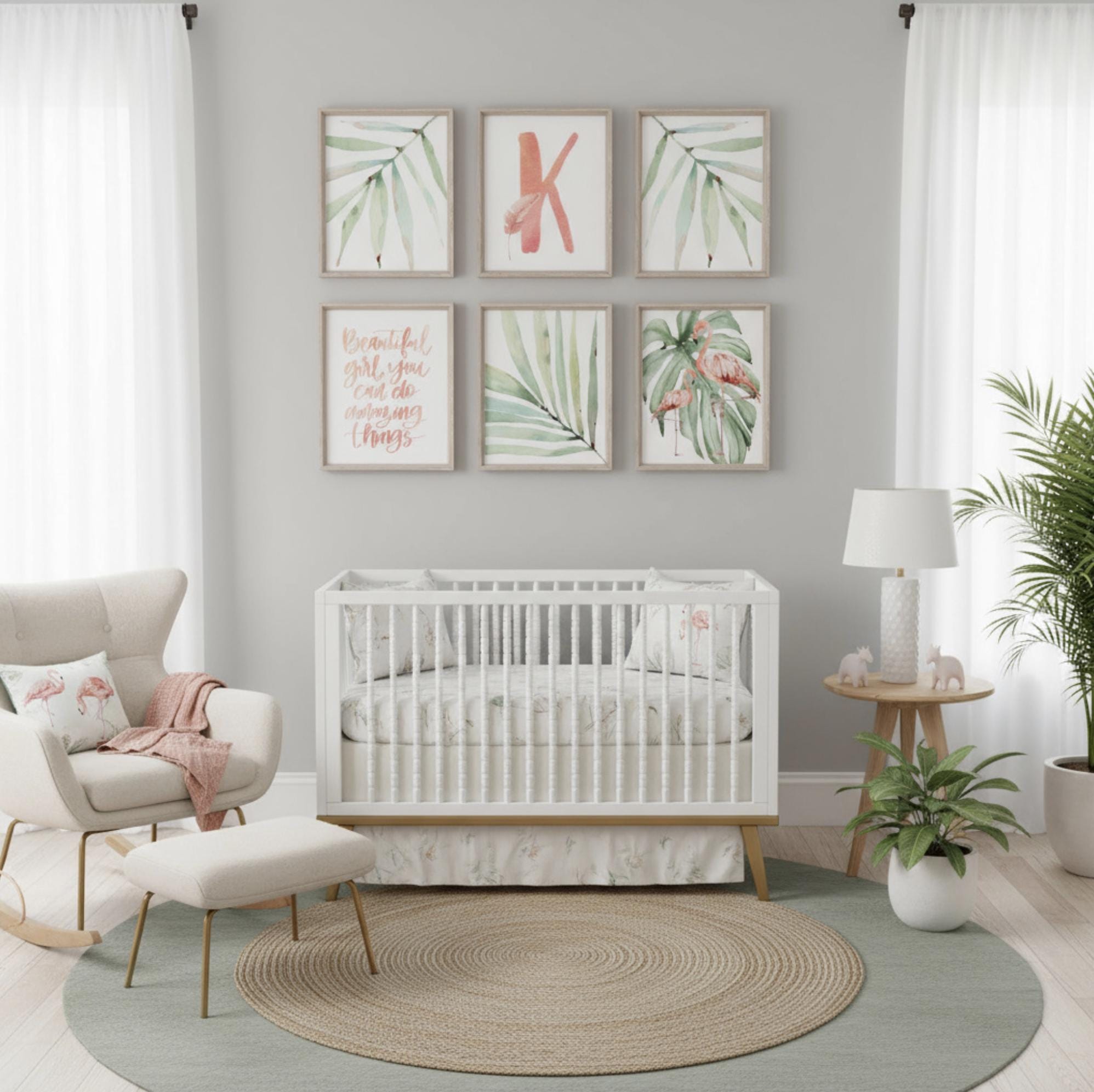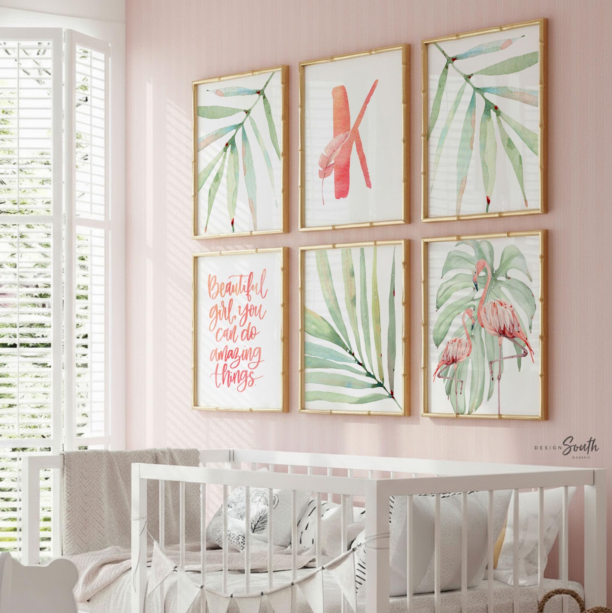 Product description: Tropical theme watercolor prints featuring flamingos, tropical plants, inspirational quote and a monogram to be customized with your child's initial. Other options are also available in my shop.
