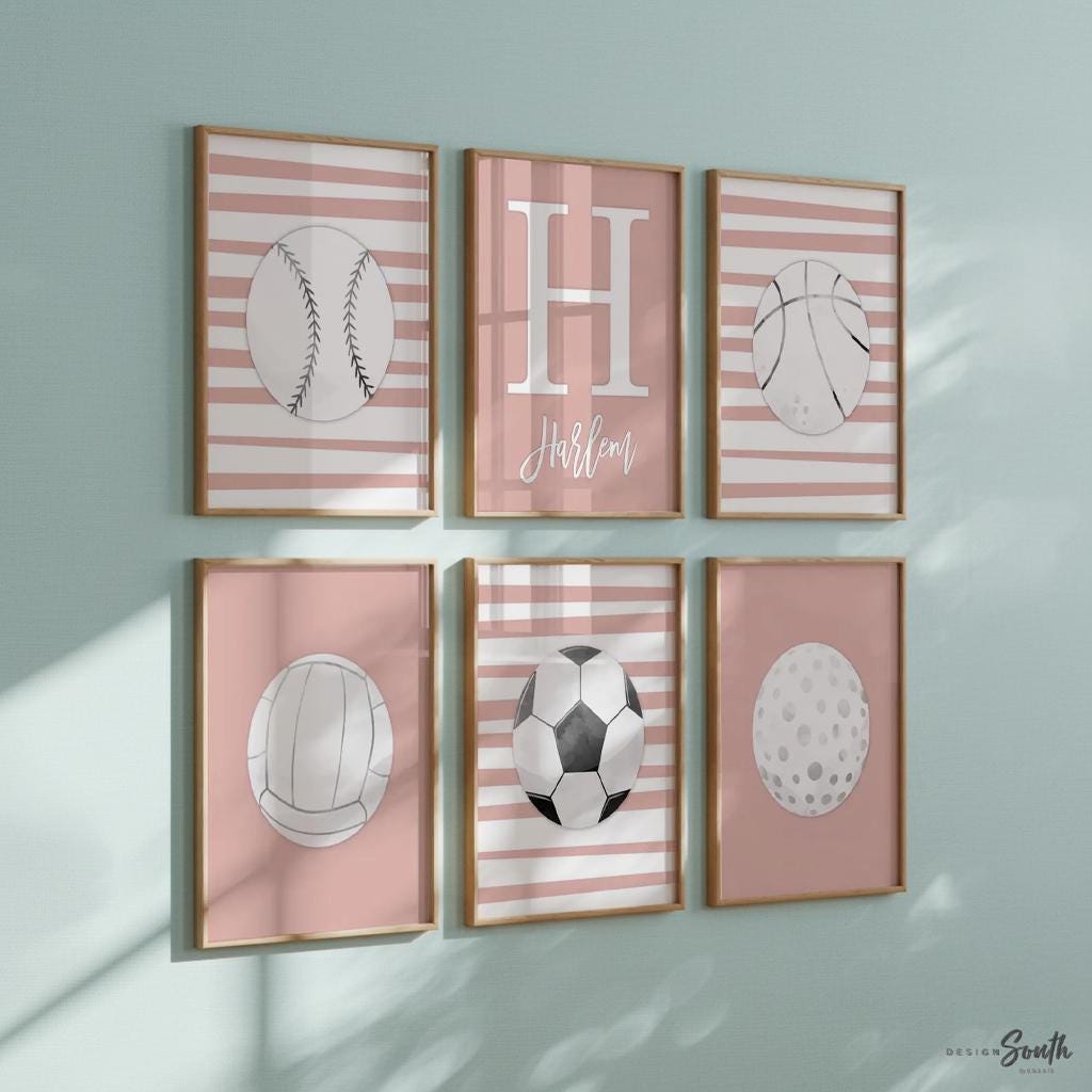 Product description: Sports watercolor themed prints including a basketball, soccer ball, volleyball, baseball and golf ball with 'giddy' pink colored backgrounds and personalized print to be customized with your child's name and initial. You can request to swap out any of the sports with softball, tennis, bowling or volleyball. Please specify in the 'notes to seller' section during checkout. Other options are also available in my shop.