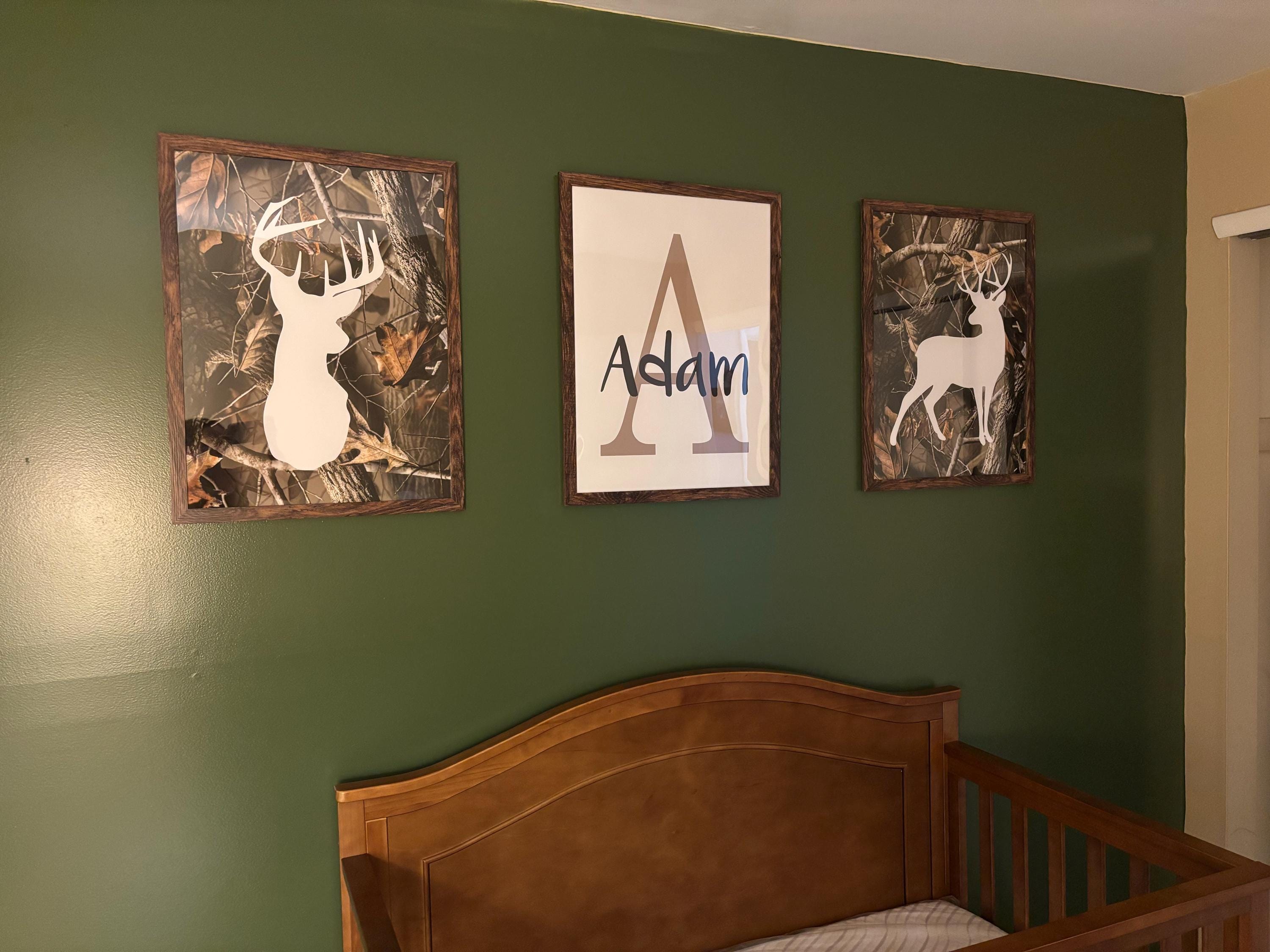 Product description: Deer art prints featuring camouflage, taupe and chocolate with matching monogram print personalized with your child's name and initial. Other options are also available in my shop.