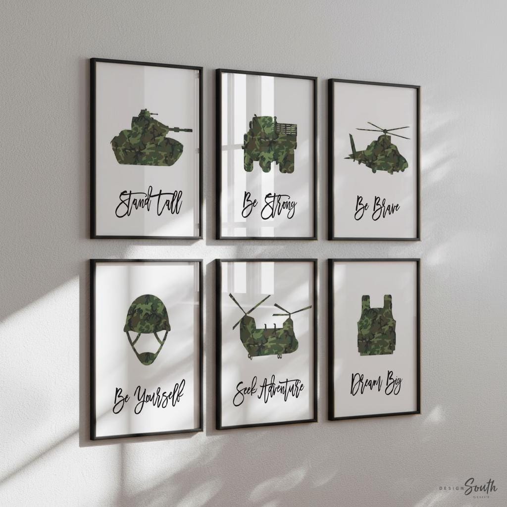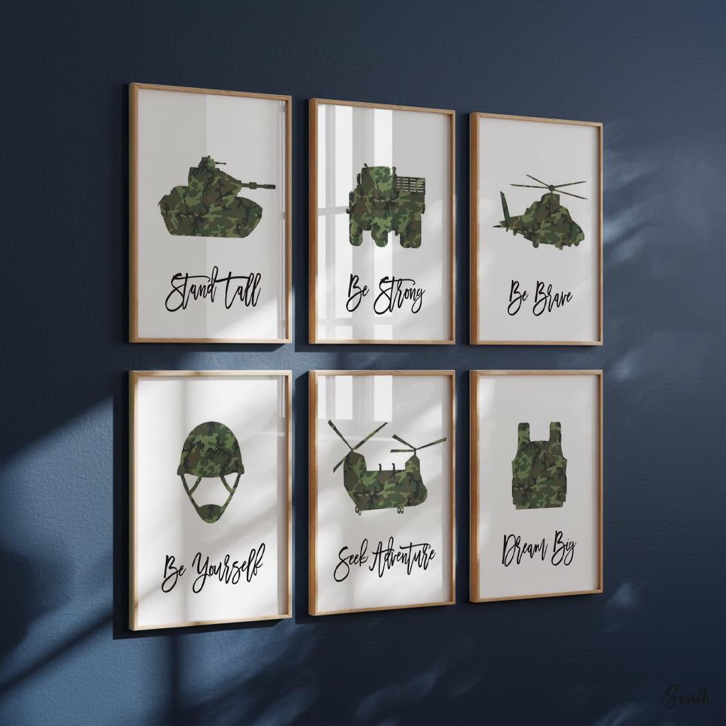 Product description: Military themed art prints with white backgrounds and inspirational sayings that read, "Be Strong. Be Brave. Dream Big. Be Yourself. Seek Adventure. Stand Tall." Other options are also available in my shop.