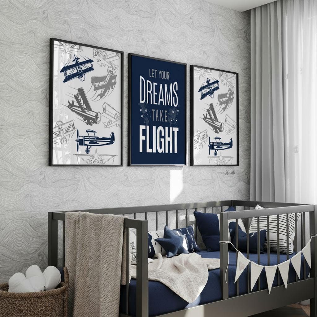 Product description: Airplane themed prints in navy blue, smoke and seagull with matching inspirational quote reading, "Let your dreams take flight." Other options are also available in my shop.