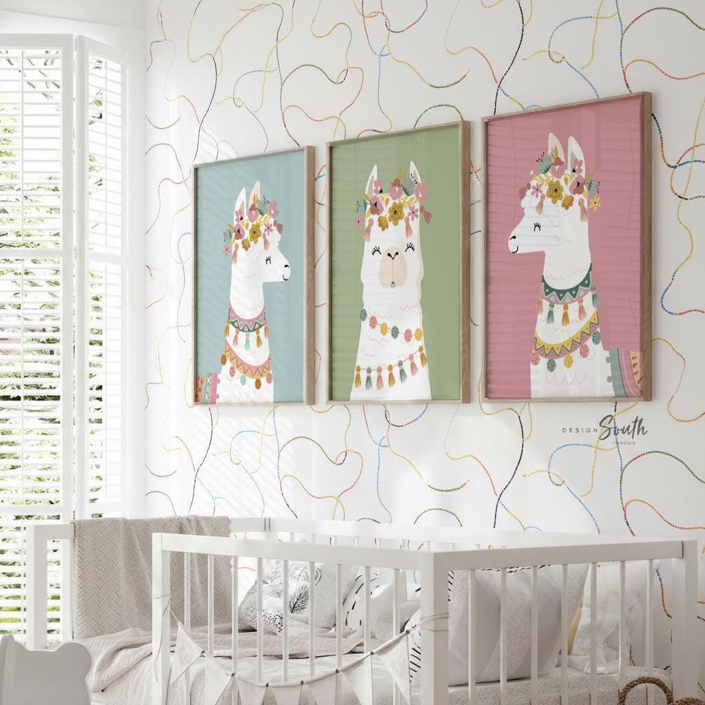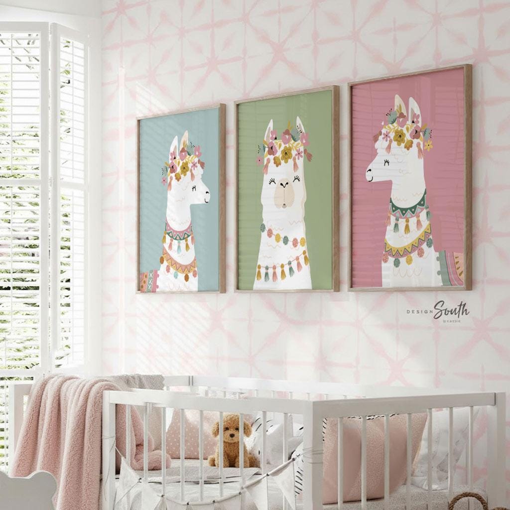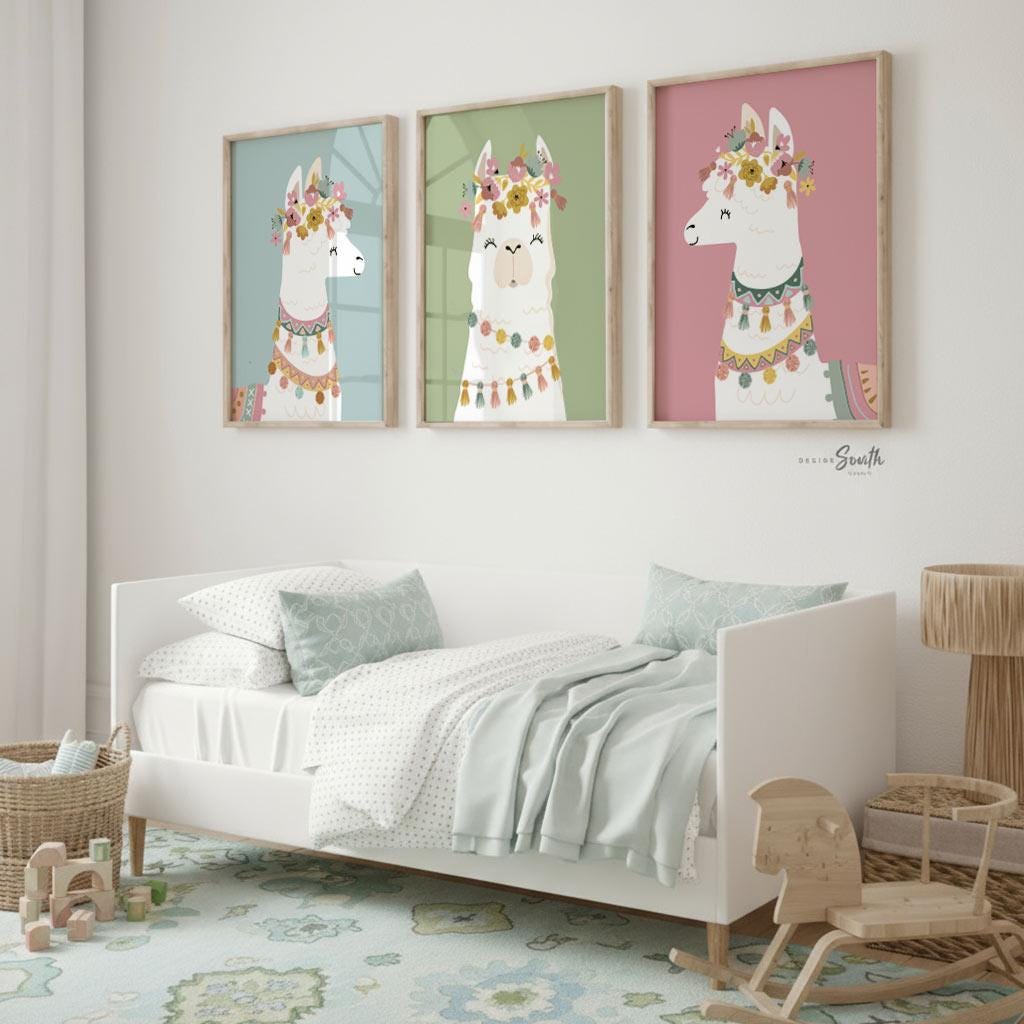 I take pride in creating all of my designs. These contemporary llama theme wall art prints will redefine the walls of a child's nursery, playroom or bedroom. Each design is curated with a passion and vision to create inspired spaces for you and your little ones.