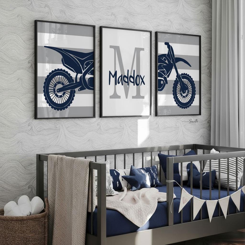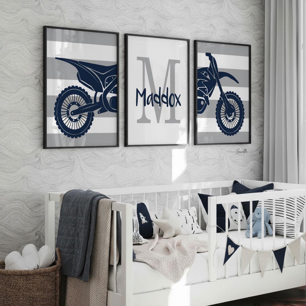 Product description: Dirt bike triptych prints in navy blue and smoke with thick striped backgrounds and matching personalized print to be customized with your child's name and initial. Other options are also available in my shop.