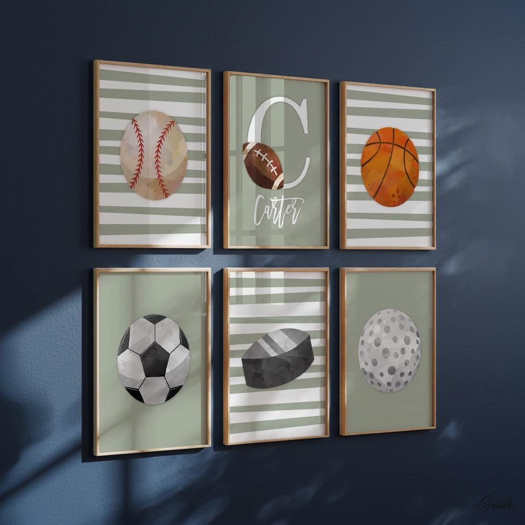 Product description: Sports theme watercolor prints including a basketball, football, soccer ball, hockey puck, baseball and a golf ball with 'sage' colored backgrounds and personalized print to be customized with your child's name and initial. You can request to swap out any of the sports with softball, tennis, bowling or volleyball. Please specify in the 'notes to seller' section during checkout. Other options are also available in my shop.
