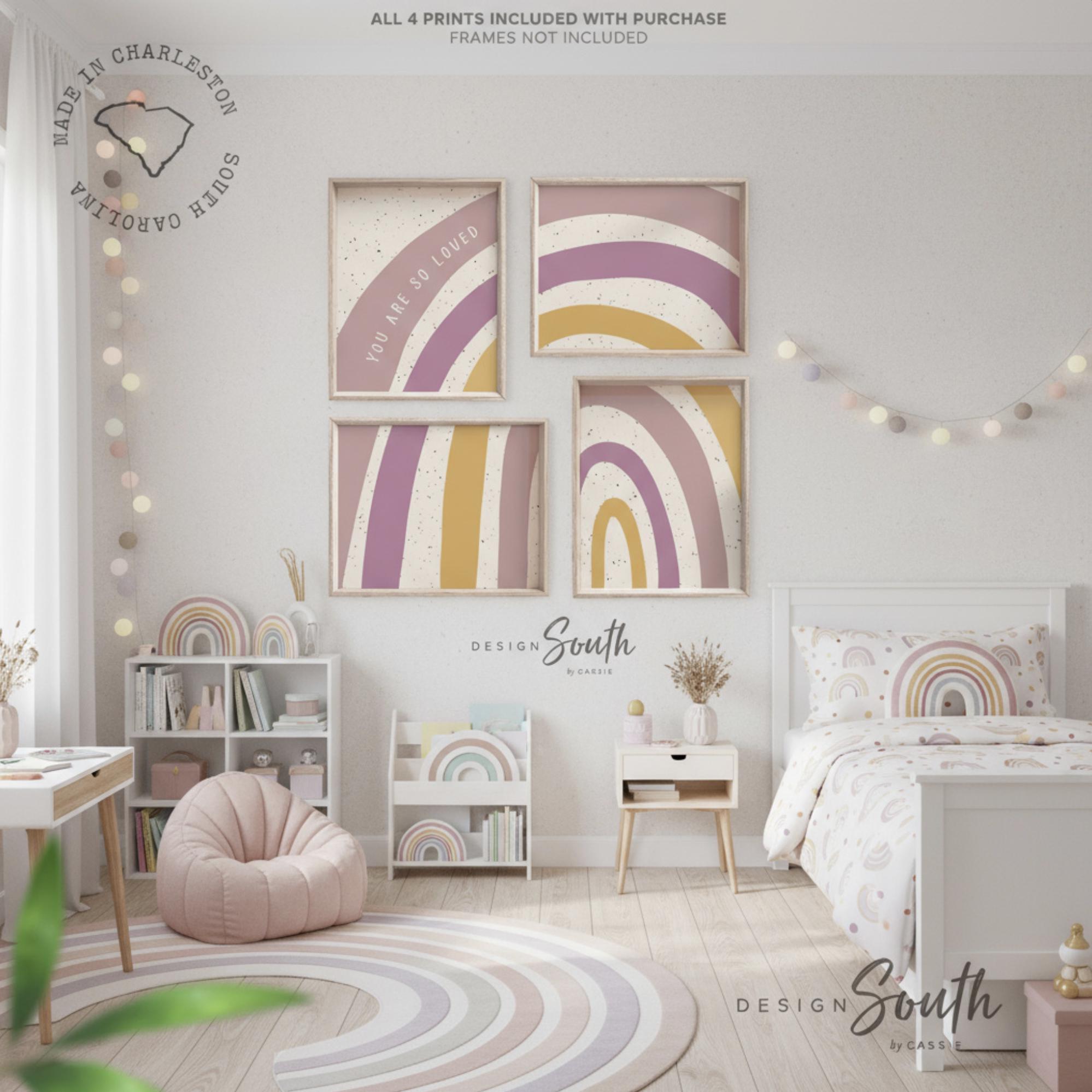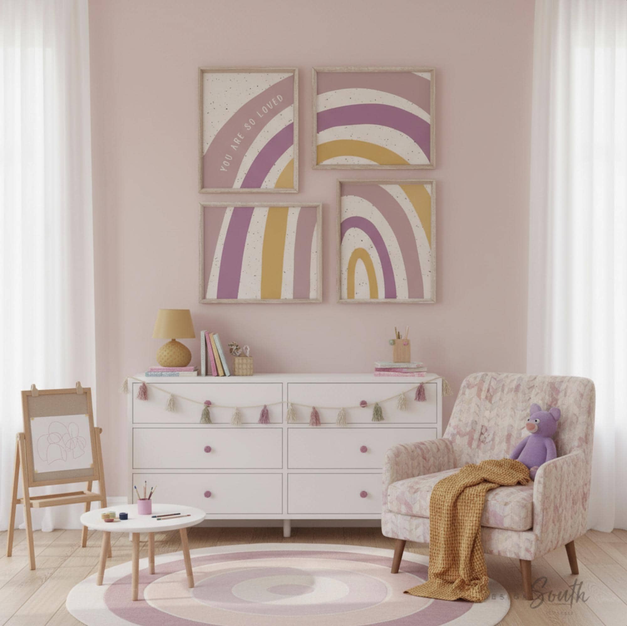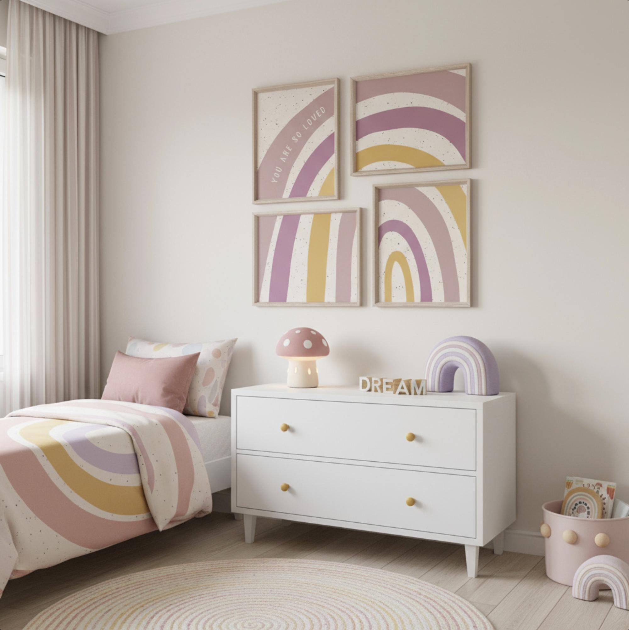 I take pride in creating all of my designs. These contemporary rainbow theme wall art prints will redefine the walls of a girl's nursery, playroom or bedroom. Each design is curated with a passion and vision to create inspired spaces for you and your little ones.