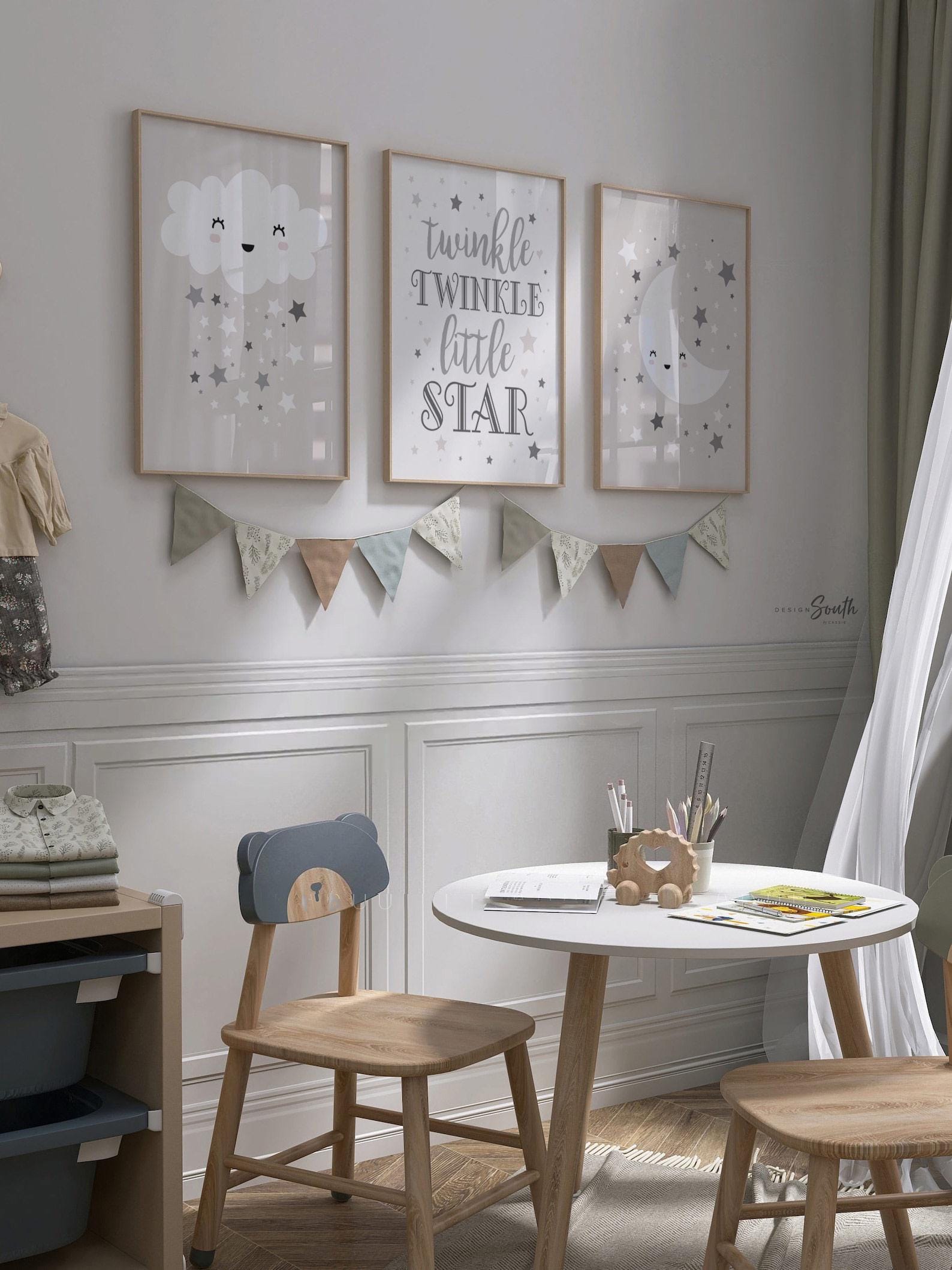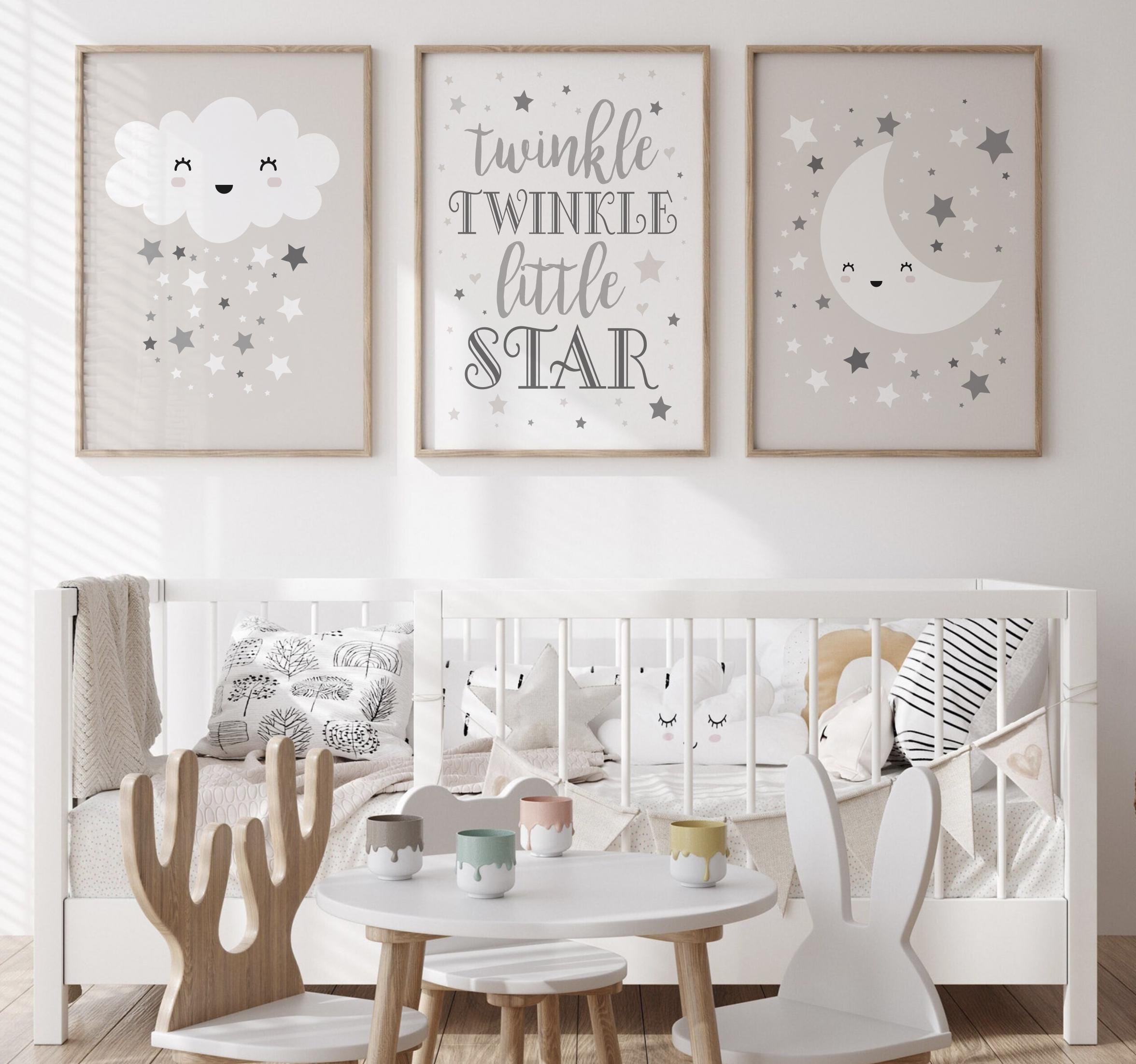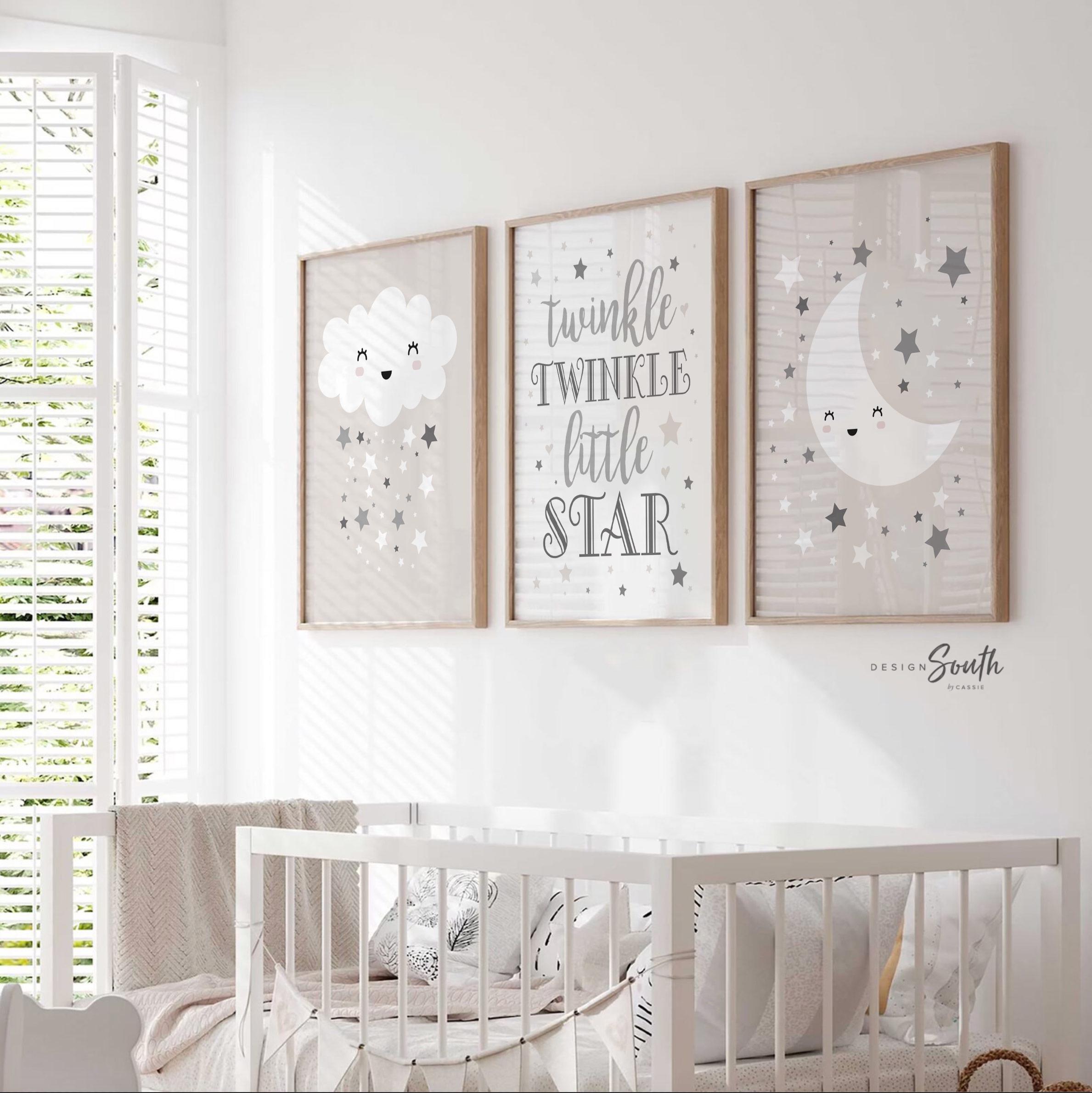 Product description: Celestial design art prints with center print reading, "Twinkle Twinkle Little Star" in shades of warm gray with matching moon and cloud prints. Other options are also available in my shop.