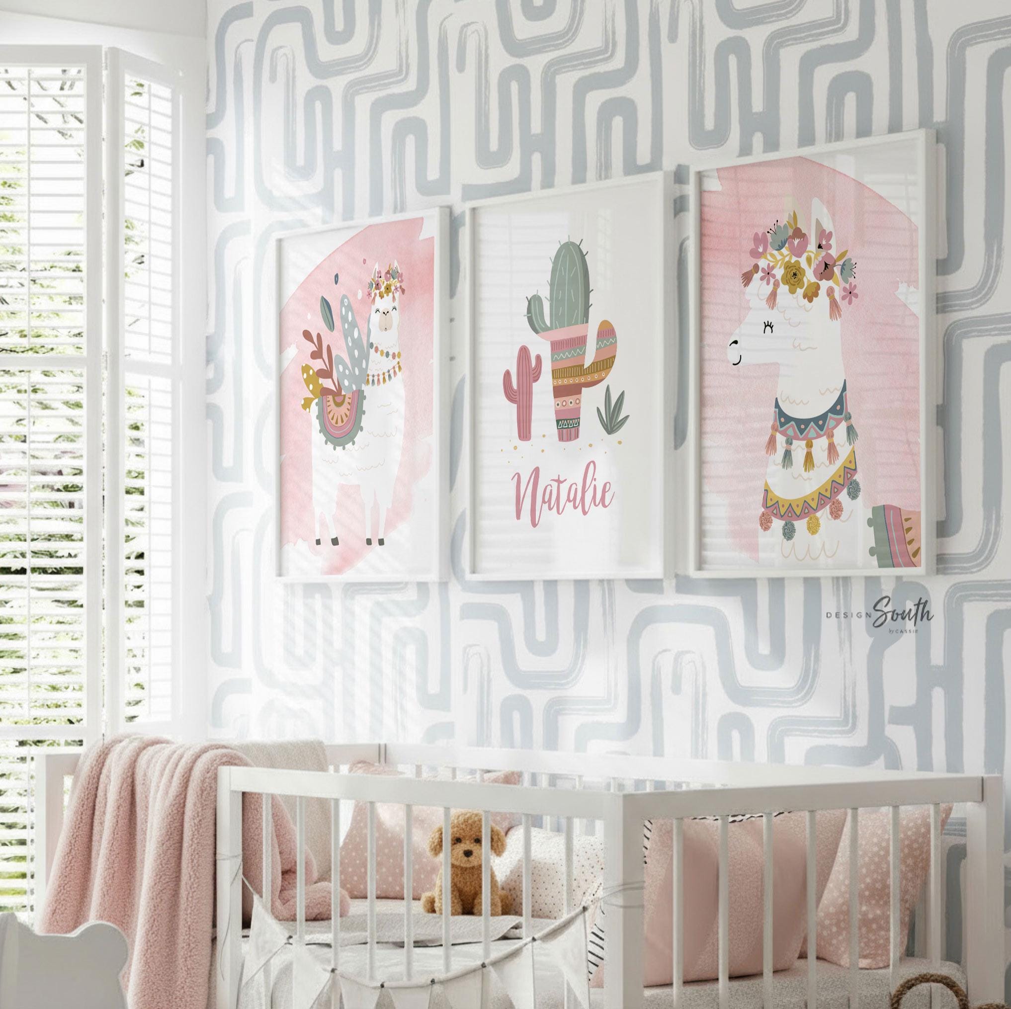Product description: Llama and cactus prints using a muted mauve pink color palette and matching cactus print to be customized with your child's name. Other options are also available in my shop.