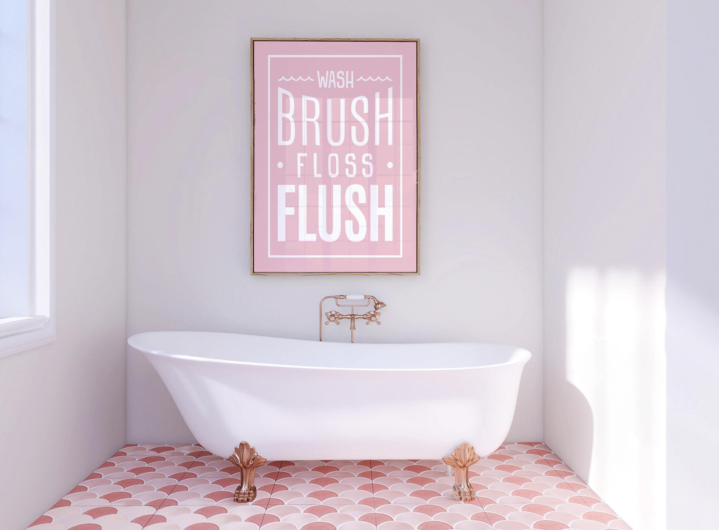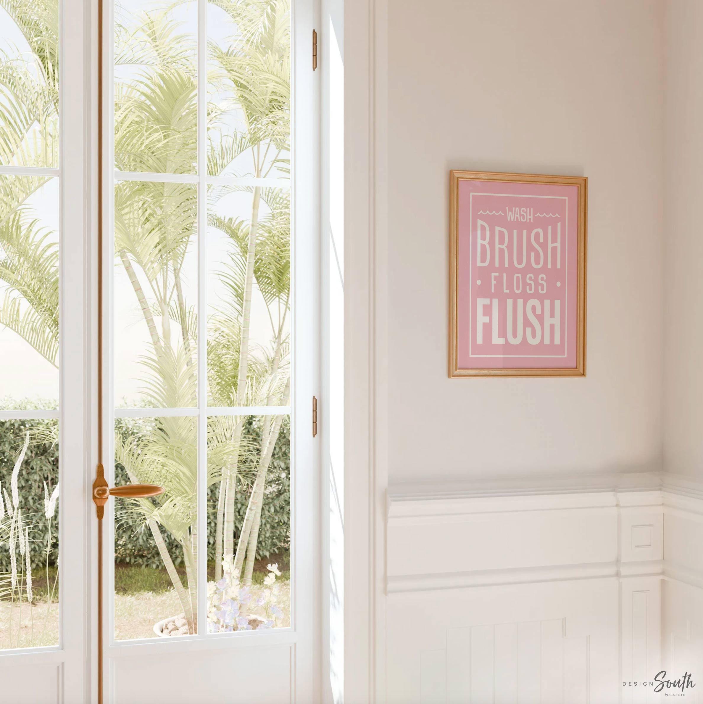 Product description: Light pink (*one shade darker than 'cupcake') bathroom print with white font. Print reads, "Wash. Brush. Floss. Flush." NOTE: This design has a worn/textured look. Colors can be customized to suit your needs. A color change is included in the price. The frame is for decoration purposes and is not included. The print should be framed behind glass once received. This is not a canvas print. My art is professionally printed on high-quality fine art paper. Each piece is printed as ordered.