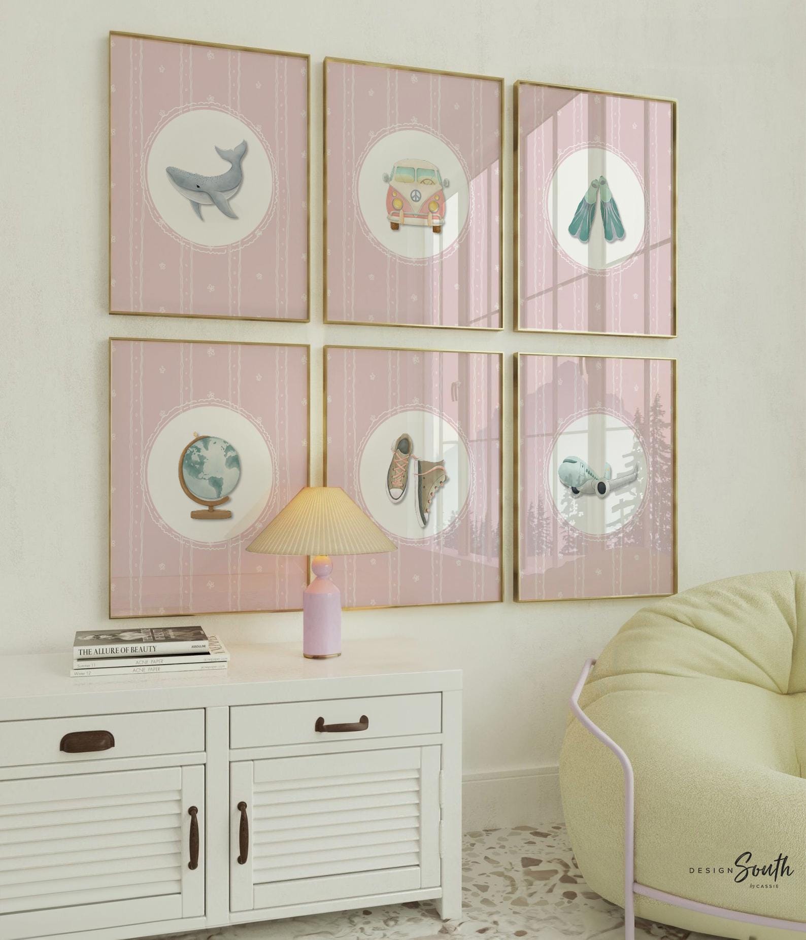 Product description: Travel themed prints with pink delicate backgrounds featuring a Volkswagen bus, converse shoes, swim fins, globe, plane and whale in pastel watercolors. You can request to swap out any of the travel artwork with a seashell, swimming goggles, surfboard, ice cream cone, map, compass, lighthouse, headphones or a pineapple. Please specify in the 'notes to seller' section during checkout. Other options are also available in my shop.