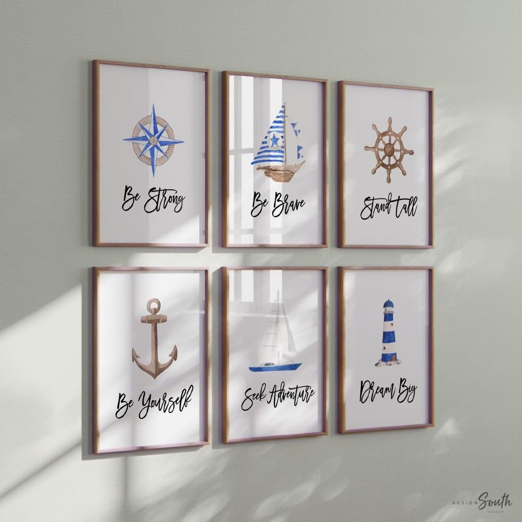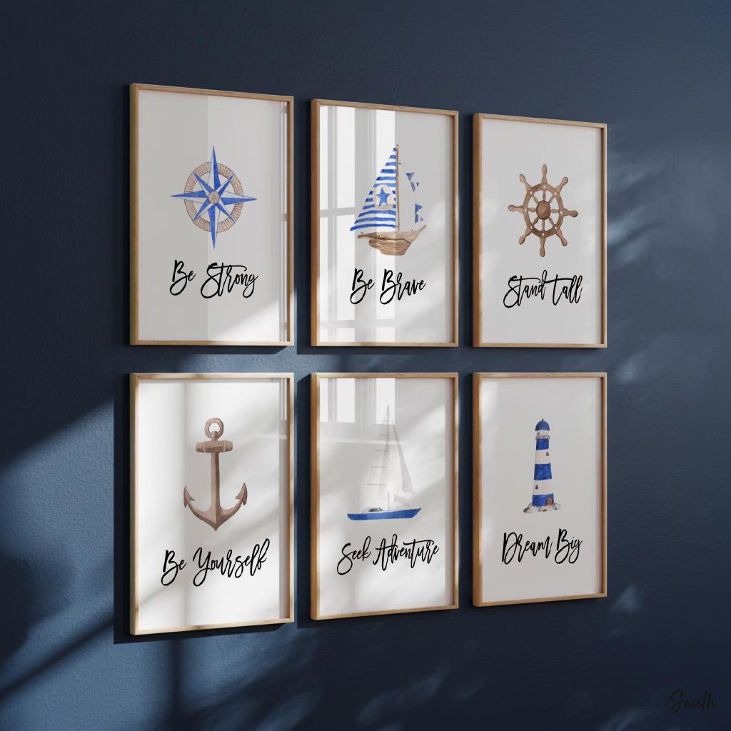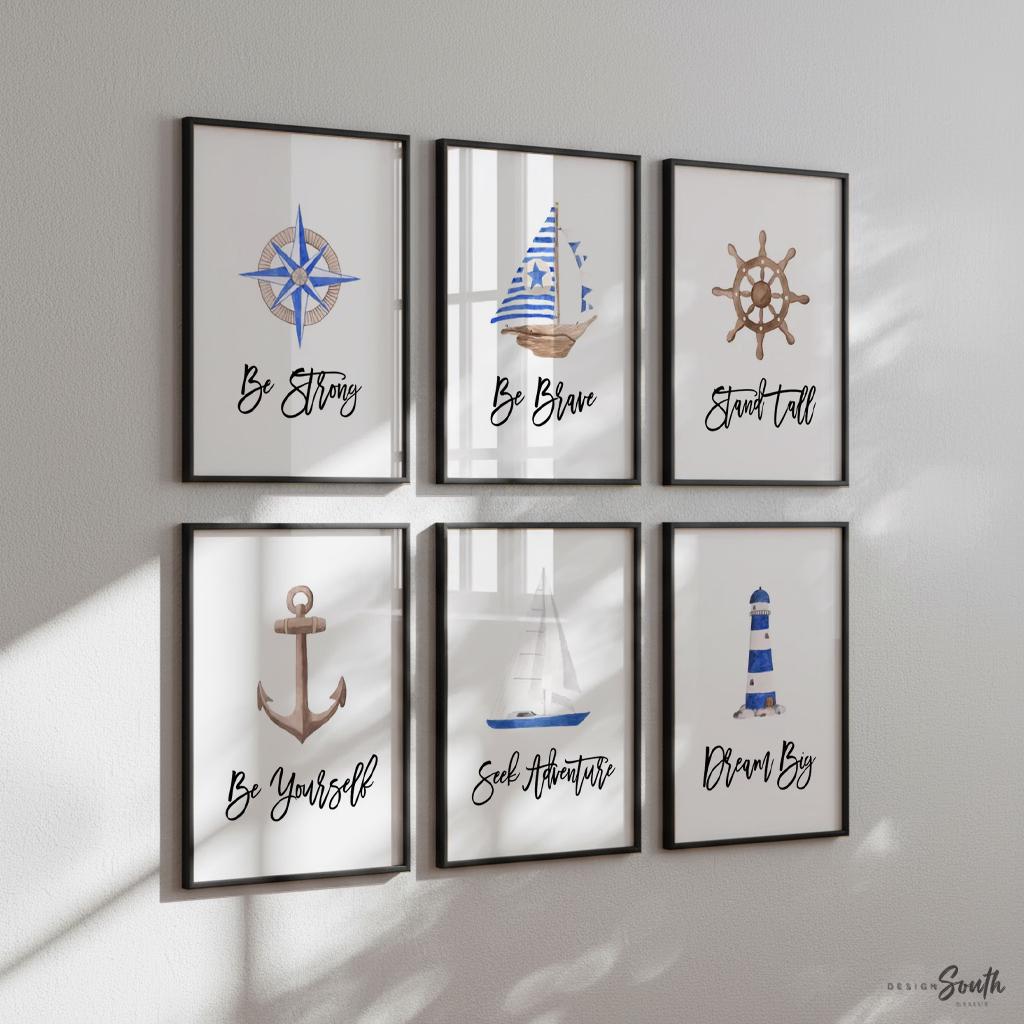 Product description: Nautical themed wall art prints with white backgrounds and inspirational sayings that read, "Be Strong. Be Brave. Dream Big. Be Yourself. Seek Adventure. Stand Tall." Other options are also available in my shop.