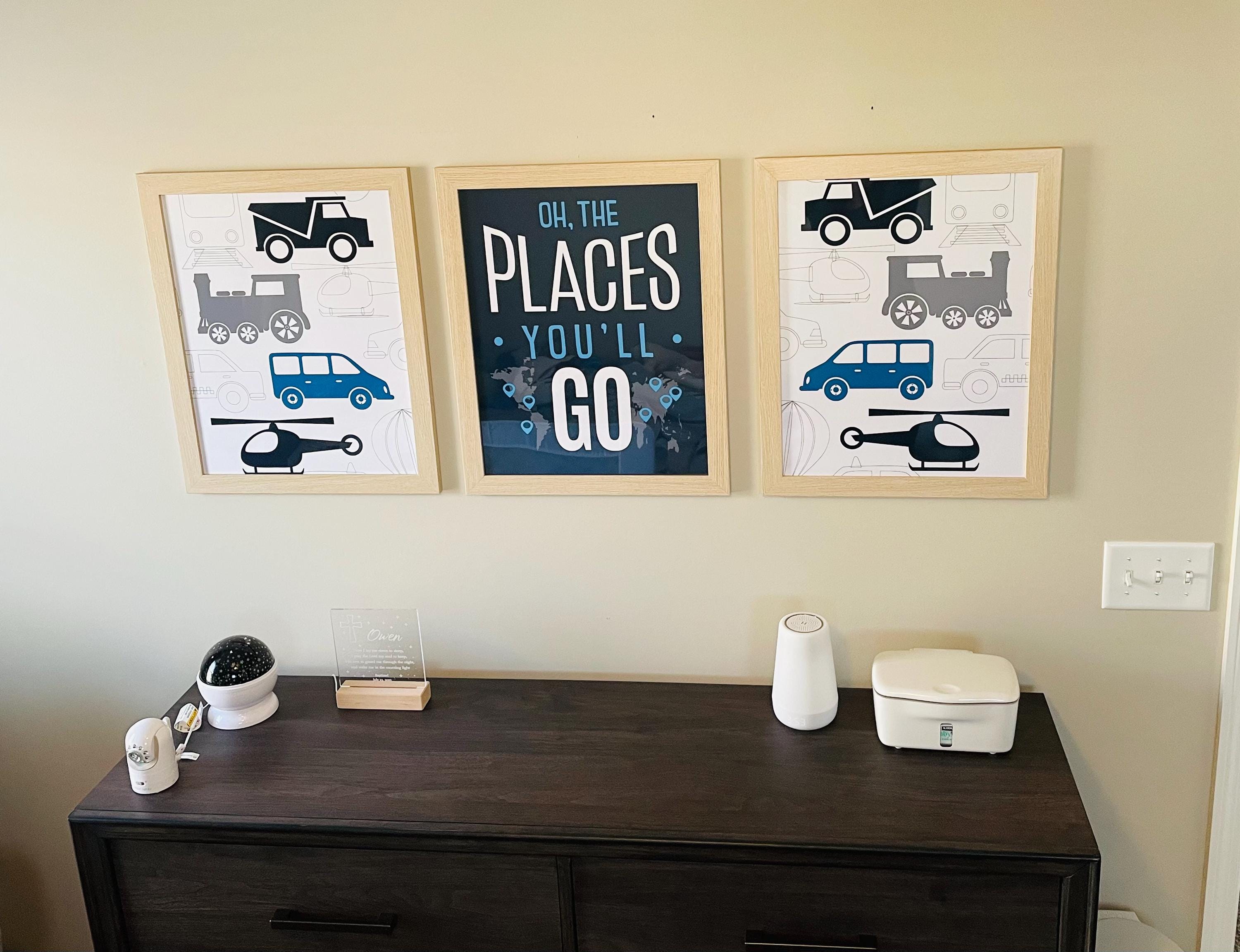 Product description: Transportation art prints in navy blue, smoke and atlantic with white backgrounds and matching quote reading, "Oh The Places You'll Go." Other options are also available in my shop.