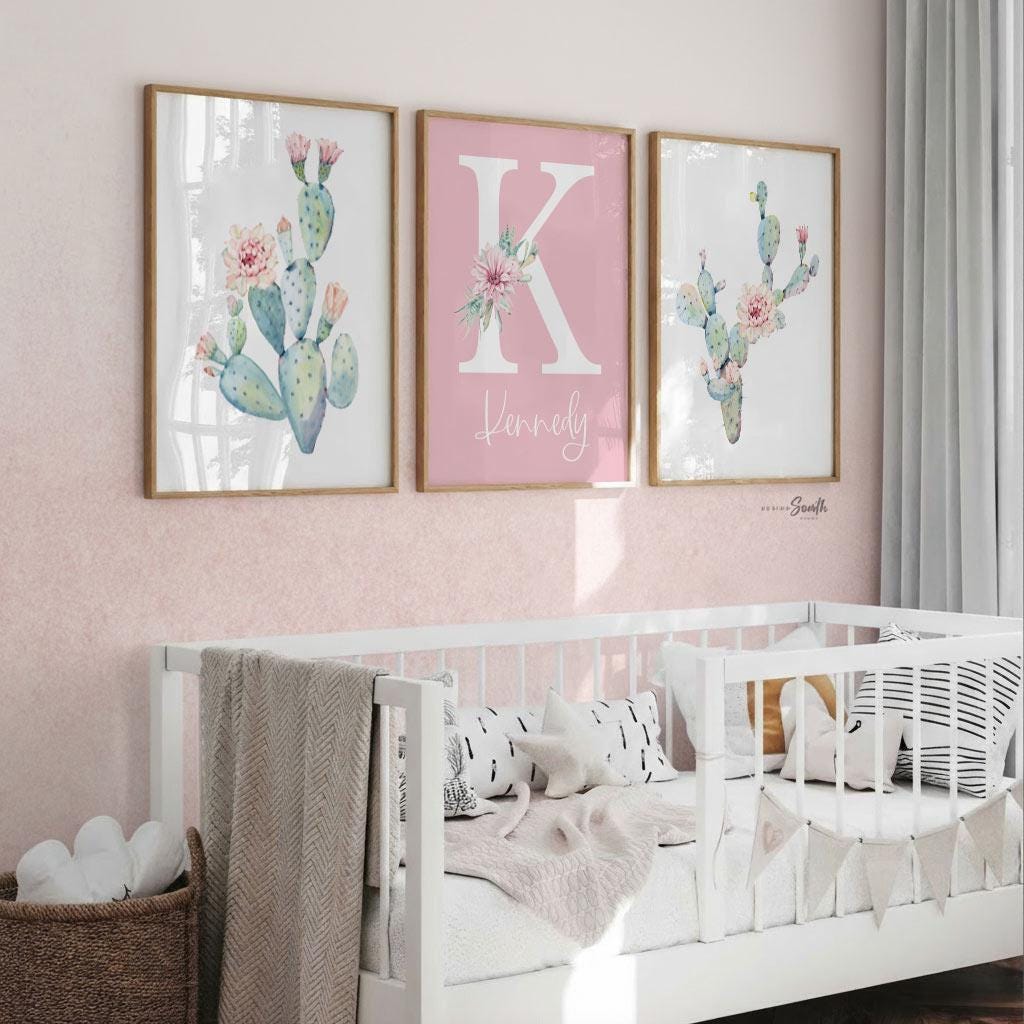 Product description: Cactus bloom themed prints with matching monogram print to be customized with your child's name and initial. Other options are also available in my shop.
