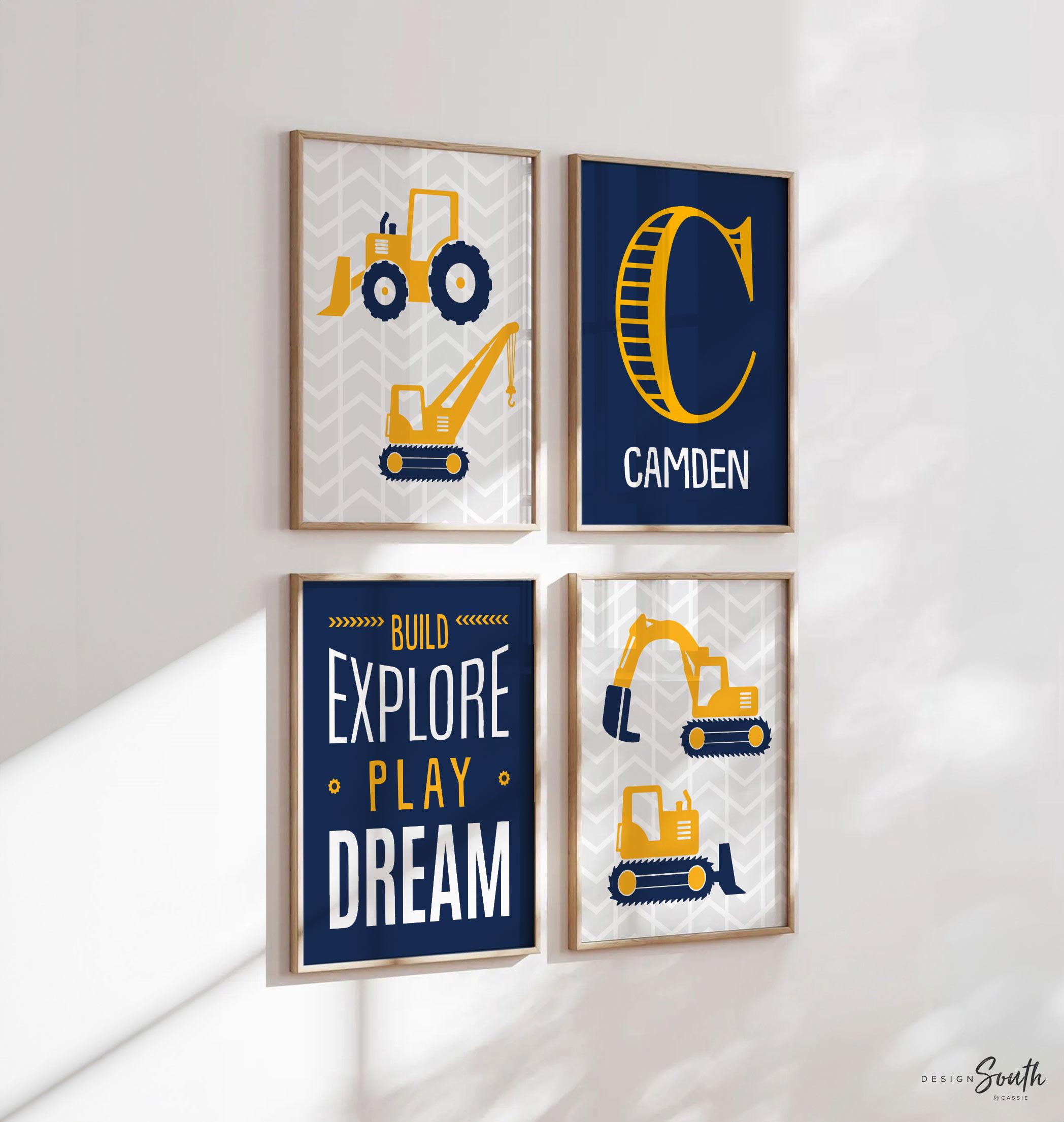 Product description: Construction truck art prints in charcoal, seagull and saffron with matching print reading, "Build. Explore. Play. Dream." Matching personalized print to be customized with your child's name. Other options are also available in my shop.