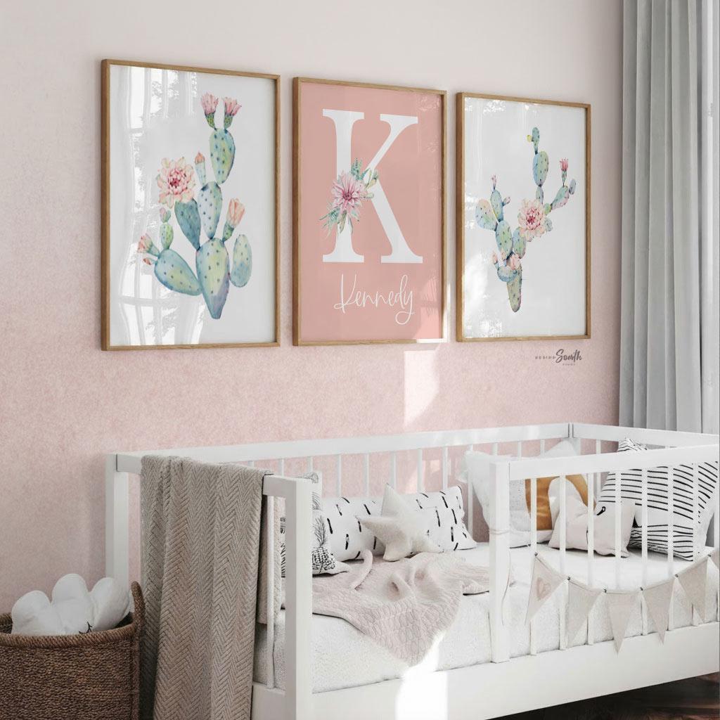 Product description: Cactus bloom themed prints with matching monogram print to be customized with your child's name and initial. Other options are also available in my shop.