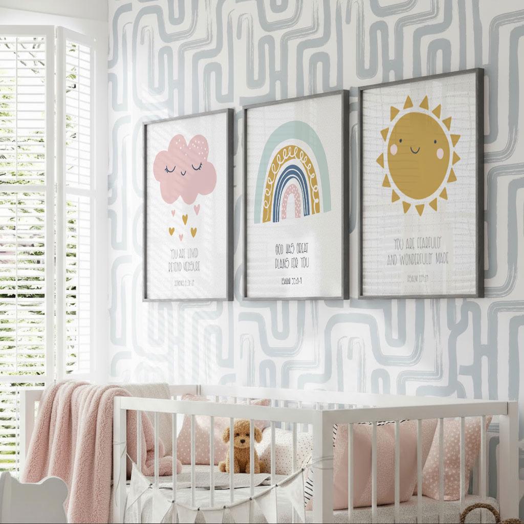 Product description: Wall art prints featuring a sleepy cloud, smiling sun, hearts, rainbow and bible verses reading, "You are loved beyond measure. ROMANS 8:38-39, You are fearfully and wonderfully made. PSALM 139:14, and God has great plans for you. ISAIAH 55:8-9." Other options are also available in my shop.