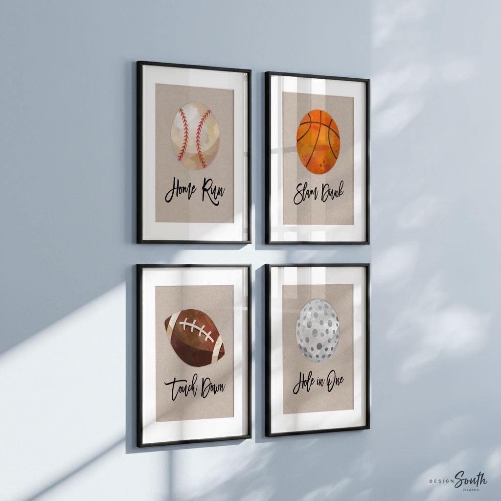 Product description: Sports theme prints including a basketball, football, golf ball and baseball with kraft 1 paper textured background colors and messages reading, "Touchdown. Home Run. Hole in One. Slam Dunk." You can request to swap out any of the sports with soccer, hockey, softball, tennis, bowling or volleyball. Please specify in the 'notes to seller' section during checkout. Other options are also available in my shop.