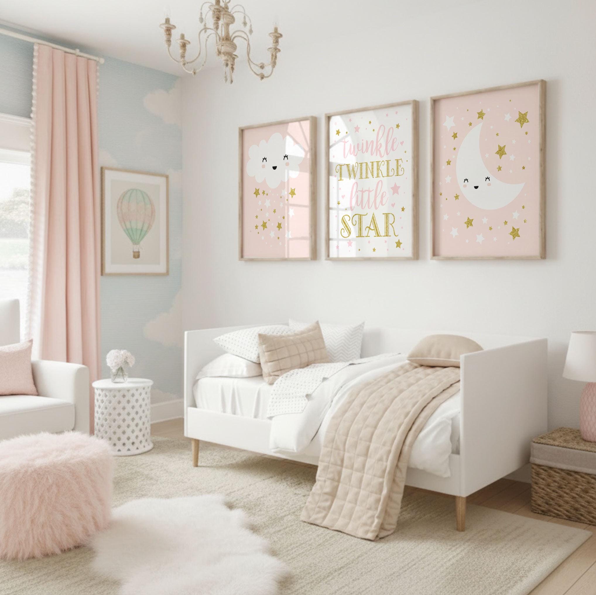 Product description: Quote reading, "Twinkle Twinkle Little Star" in peach and gold sparkles with matching moon and cloud prints. Note: The item listed is created digitally. Gold glitter nor sparkly paper was meed in creating the stars or lettering. High resolution photography of sparkles was used to create a 3D appearance of sparkles. Other options are also available in my shop.