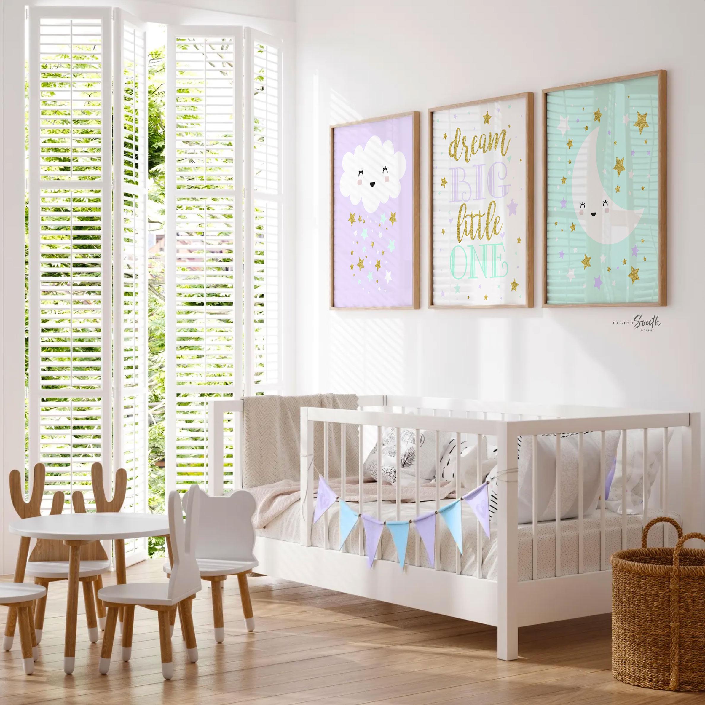 Product description: Quote reading, "Dream Big Little One" in lilac, light mint and gold sparkles with matching moon and cloud prints. Colors can be changed to suit your needs.