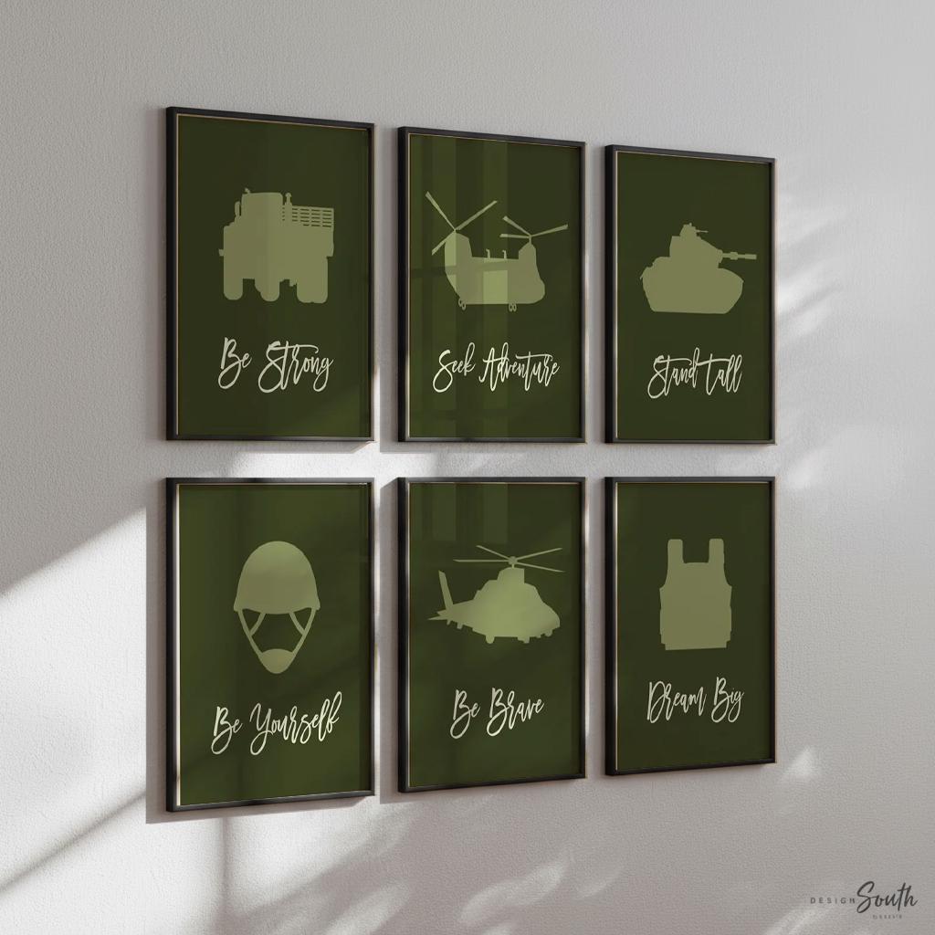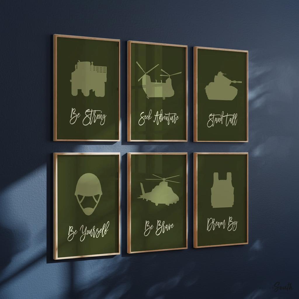 Product description: Military themed art prints with backgrounds in 'hawk' and inspirational sayings that read, "Be Strong. Be Brave. Dream Big. Be Yourself. Seek Adventure. Stand Tall." Other options are also available in my shop.