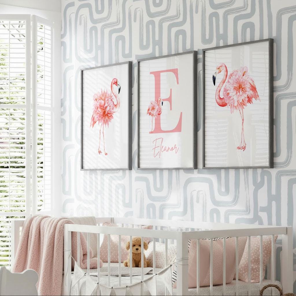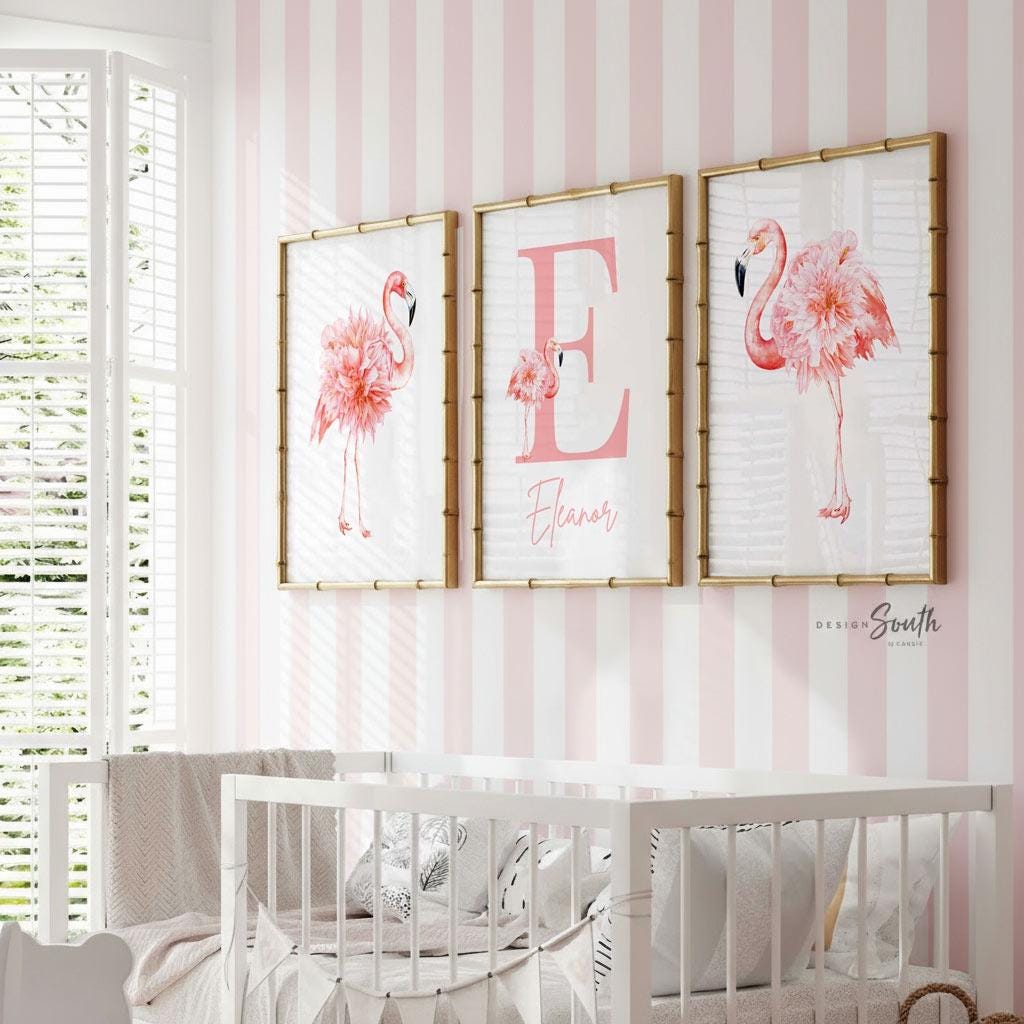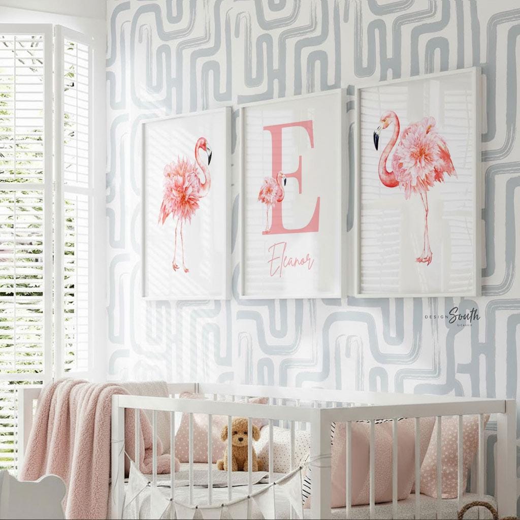 Product description: Tropical watercolor art prints featuring floral flamingos with matching monogram print to be customized with your child's name and initial. Other options are also available in my shop.