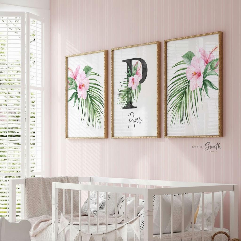 Product description: Tropical watercolor prints featuring a palm leaves with blooming flowers and a monogram print to be customized with your child's name and initial. Other options are also available in my shop.