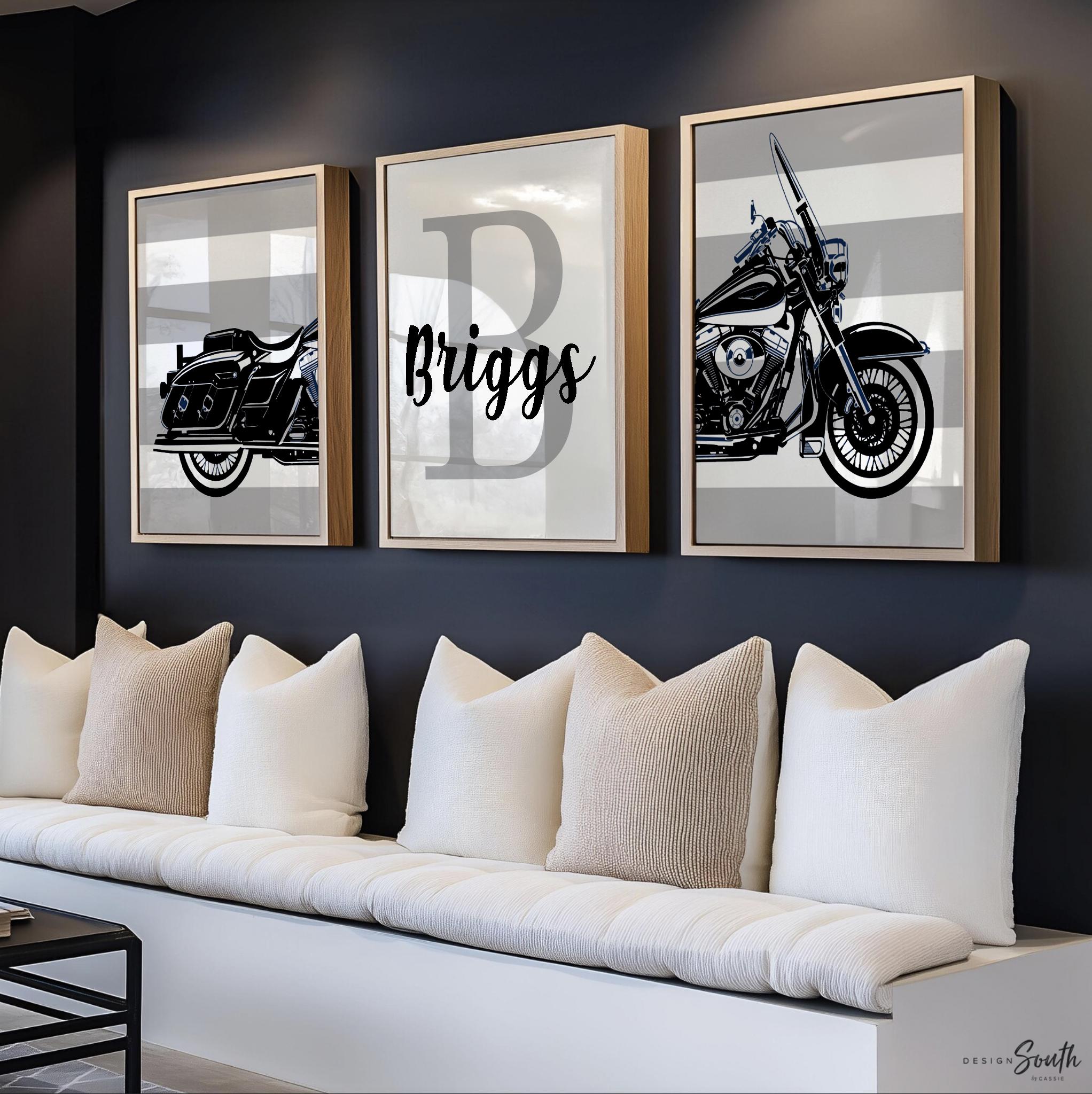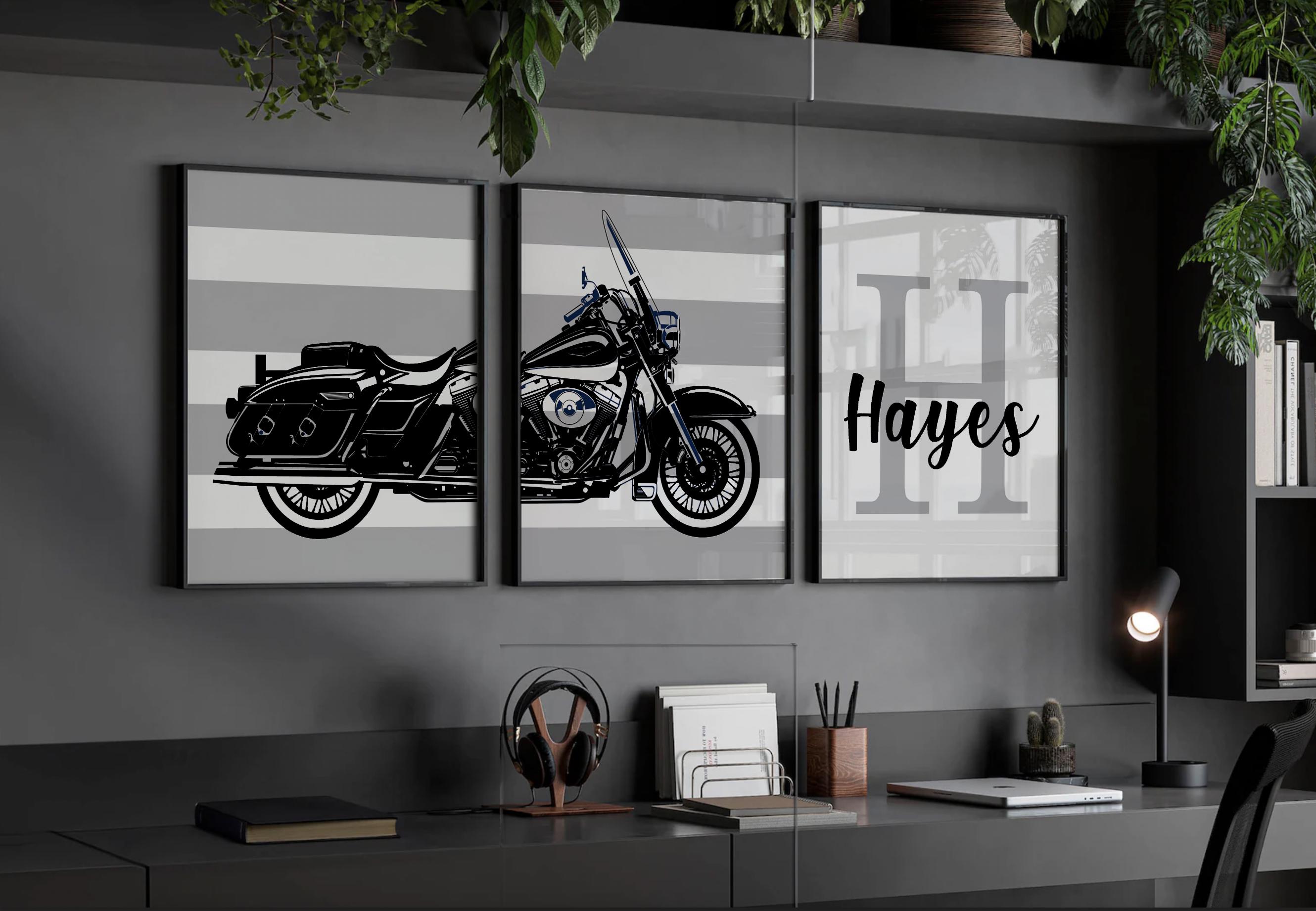 Product description: Motorcycle theme prints featuring a Road King Harley Davidson in black and smoke gray with thick striped backgrounds. Matching personalized name print to be customized with your child's name and initial. Other options are also available in my shop.
