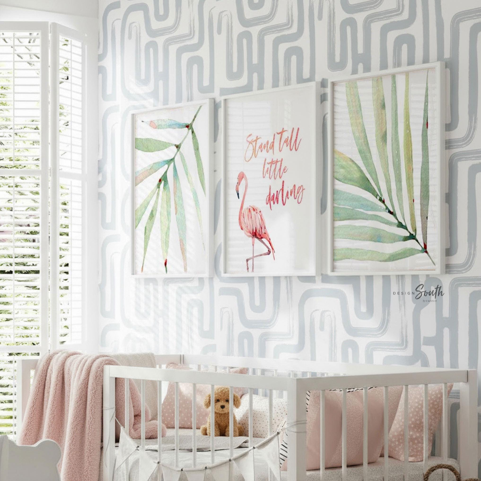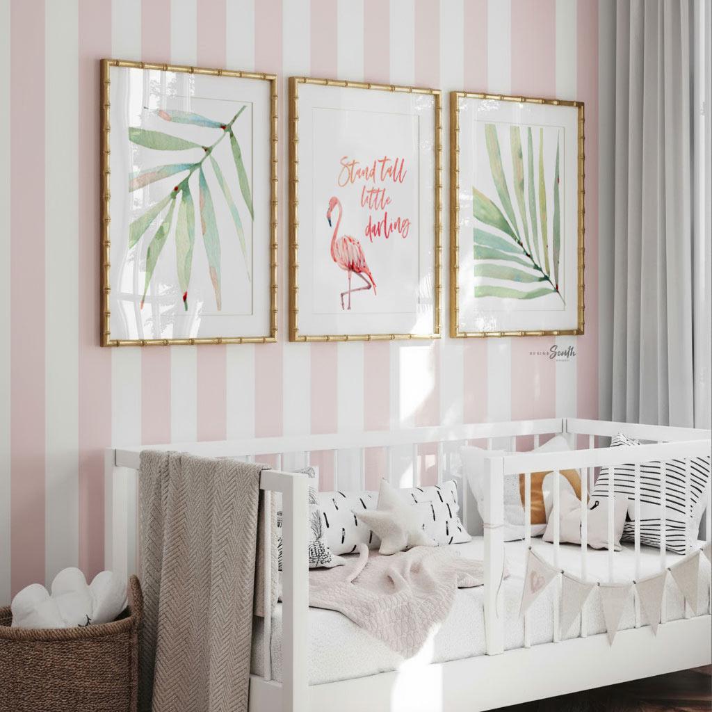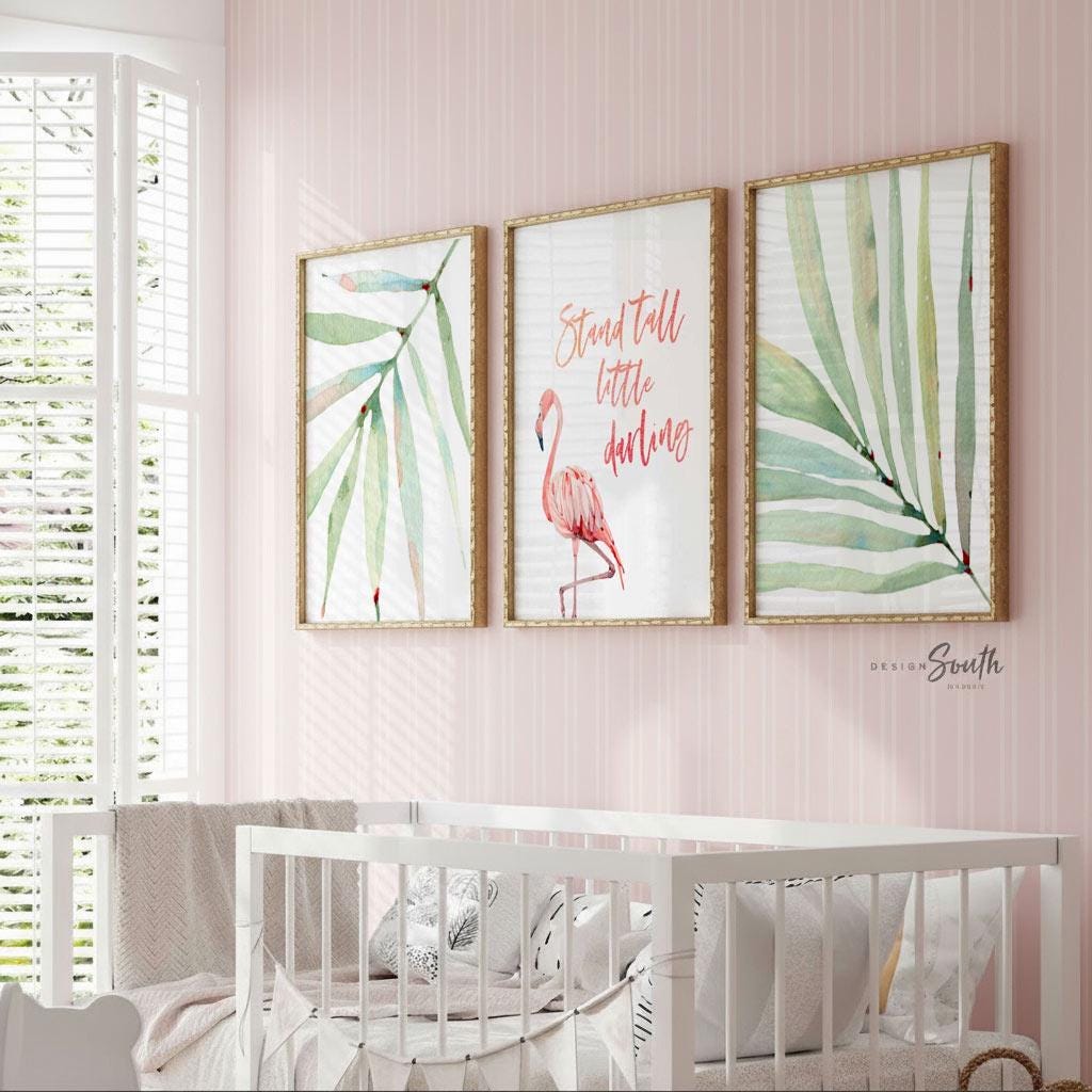 Product description: Tropical theme watercolor prints featuring a pink flamingo, palm leaves and an inspirational quote reading, "Stand Tall Little Darling." Other options are also available in my shop.