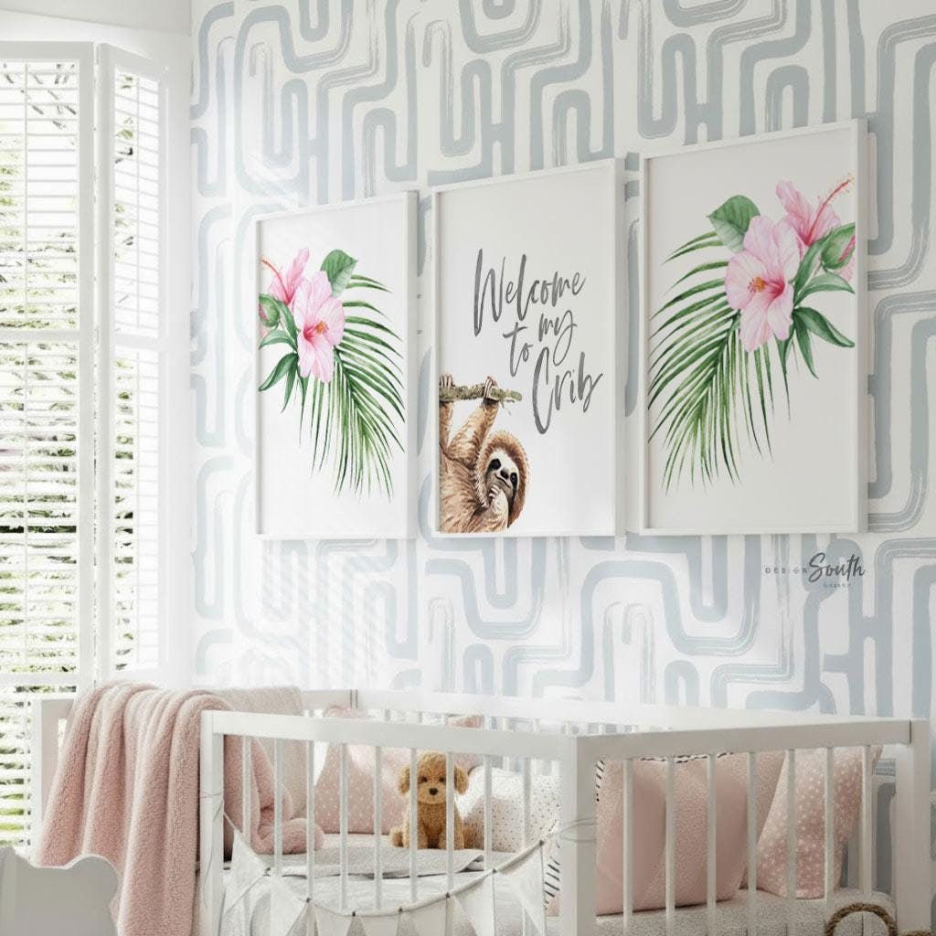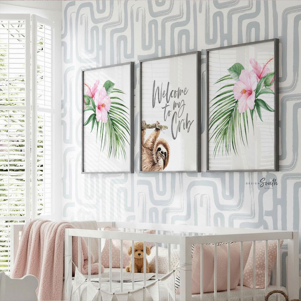 Product description: Tropical themed watercolor prints featuring palms with hibiscus flowers, a hanging sloth and matching print reading, "Welcome to my crib." Other options are also available in my shop.