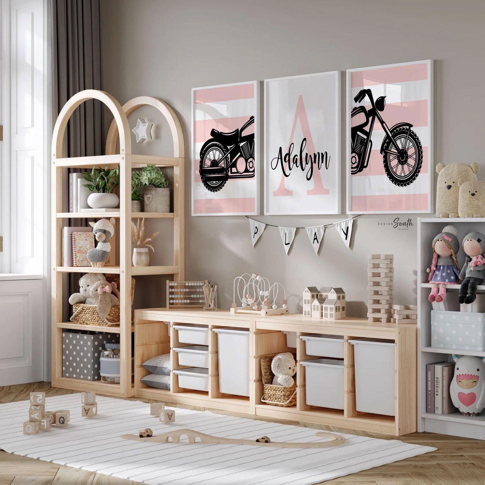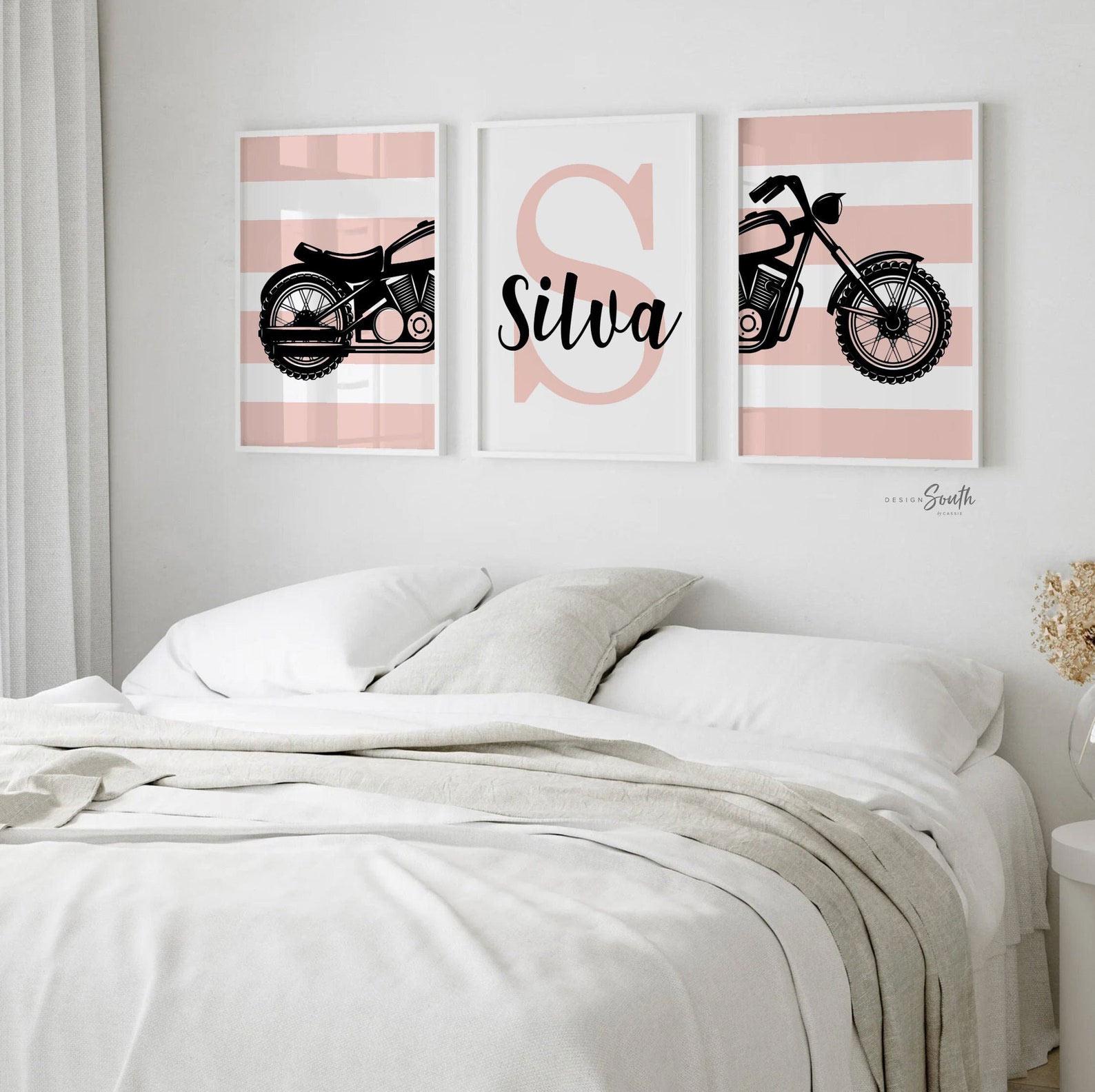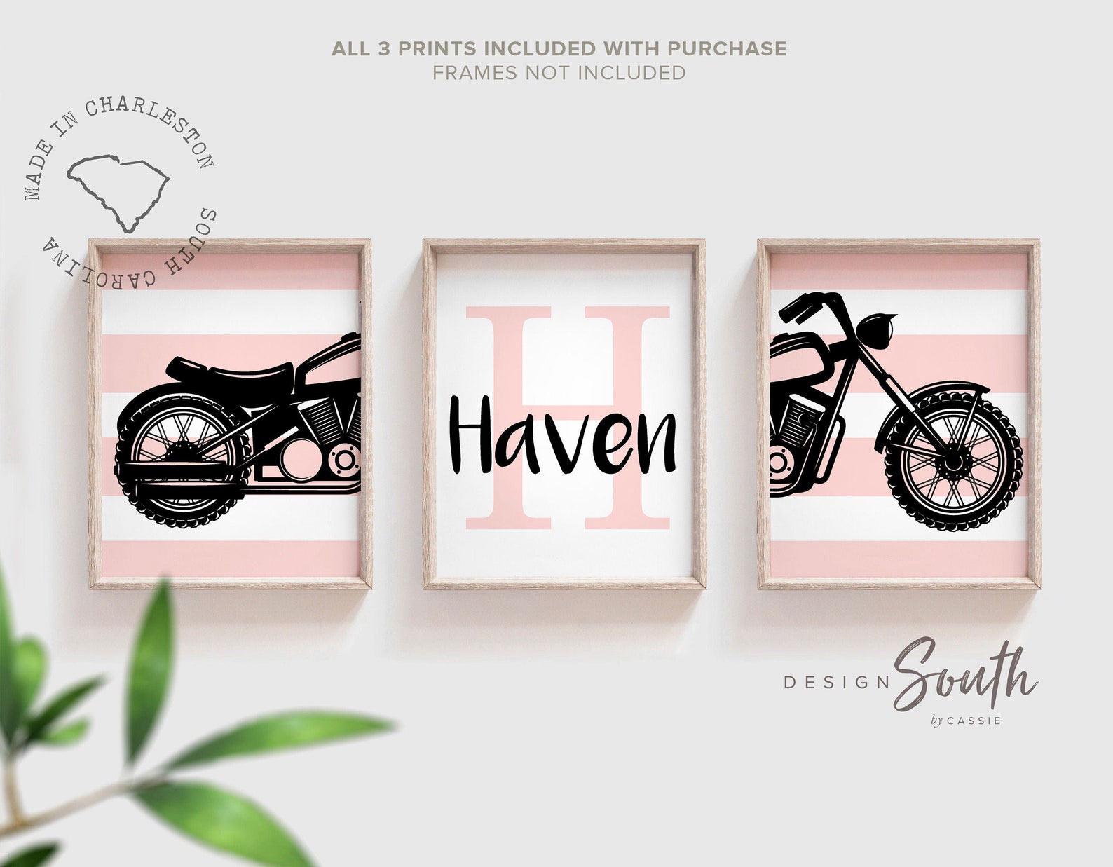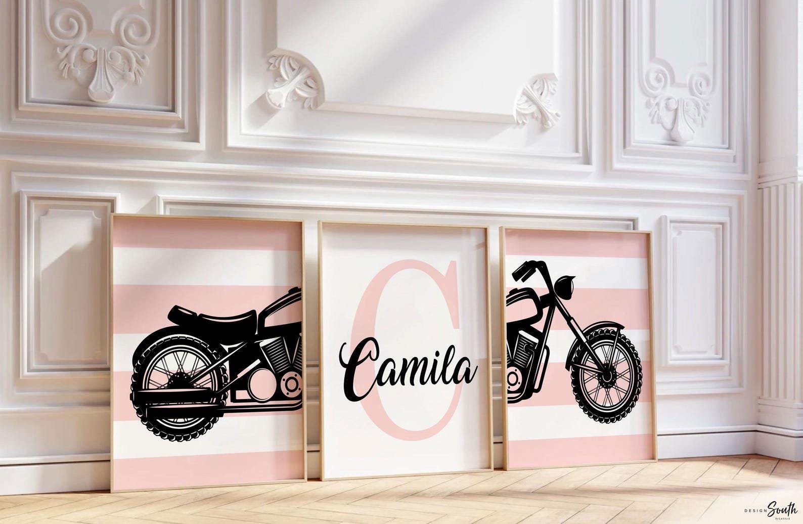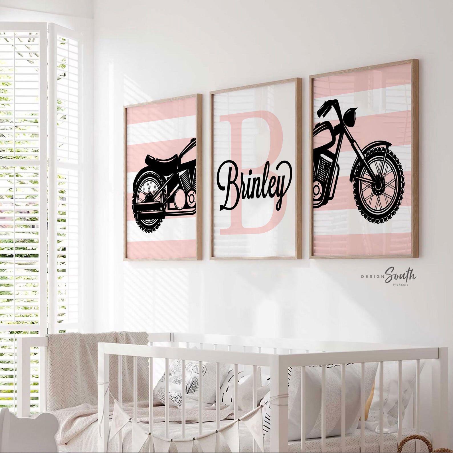 I take pride in creating all of my designs. These contemporary motorcycle themed wall art prints will redefine the walls of a girl's nursery, playroom or bedroom. Each design is curated with a passion and vision to create inspired spaces for you and your little ones.