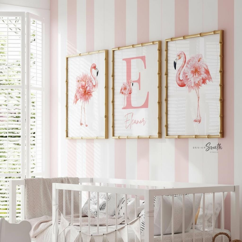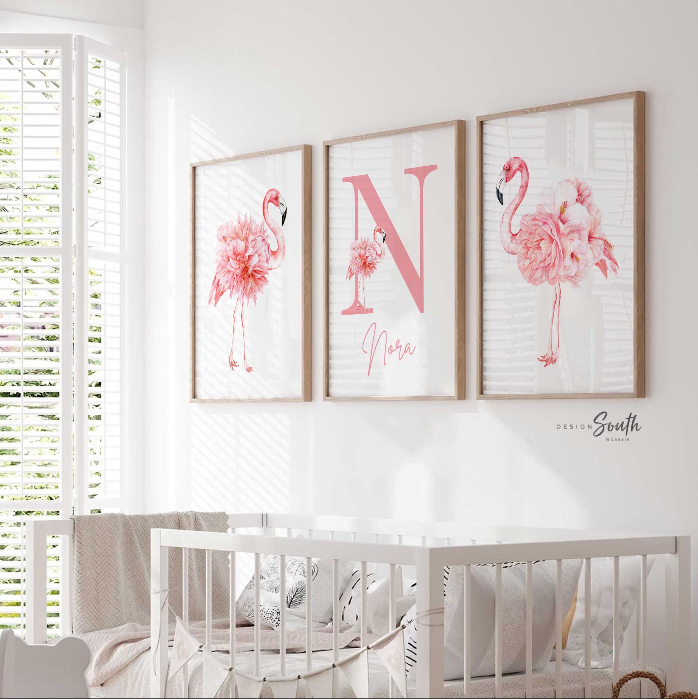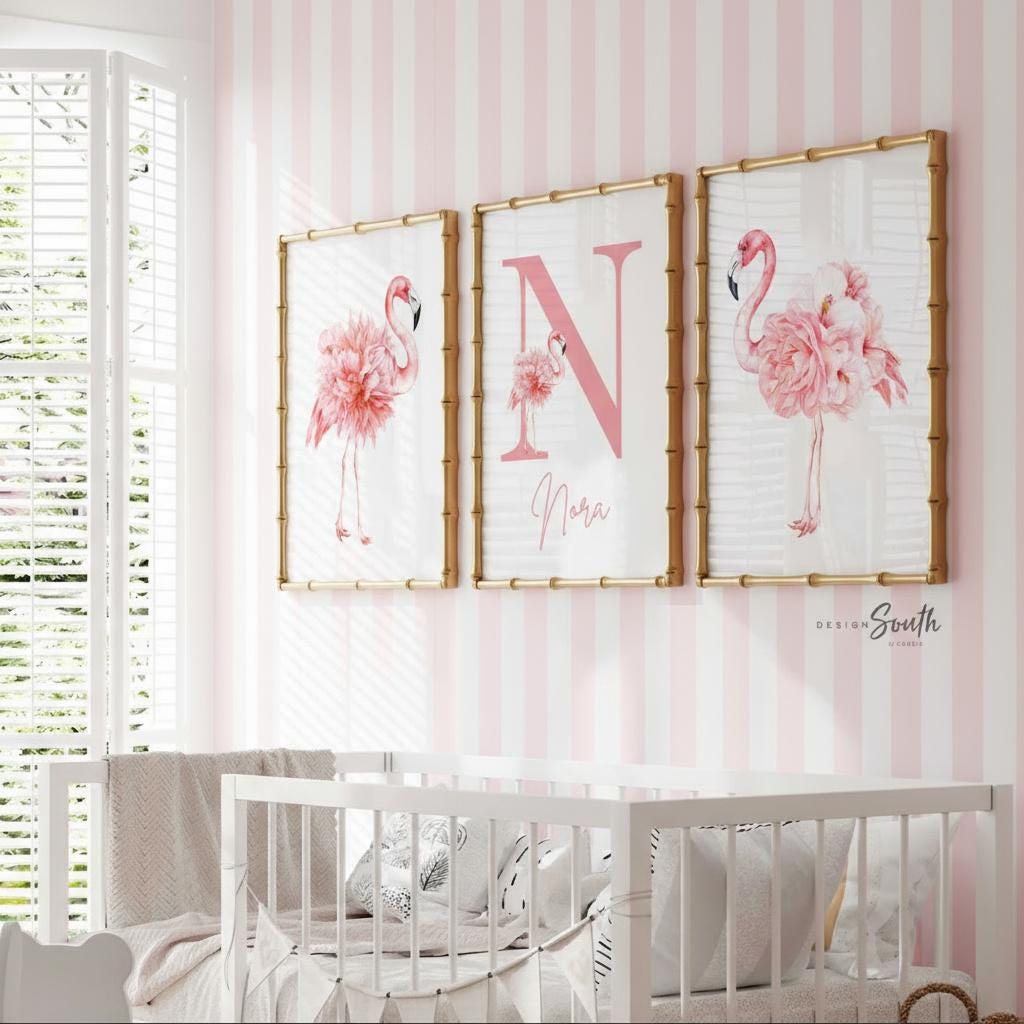 Product description: Tropical watercolor art prints featuring floral flamingos with matching monogram print to be customized with your child's name and initial. Other options are also available in my shop.