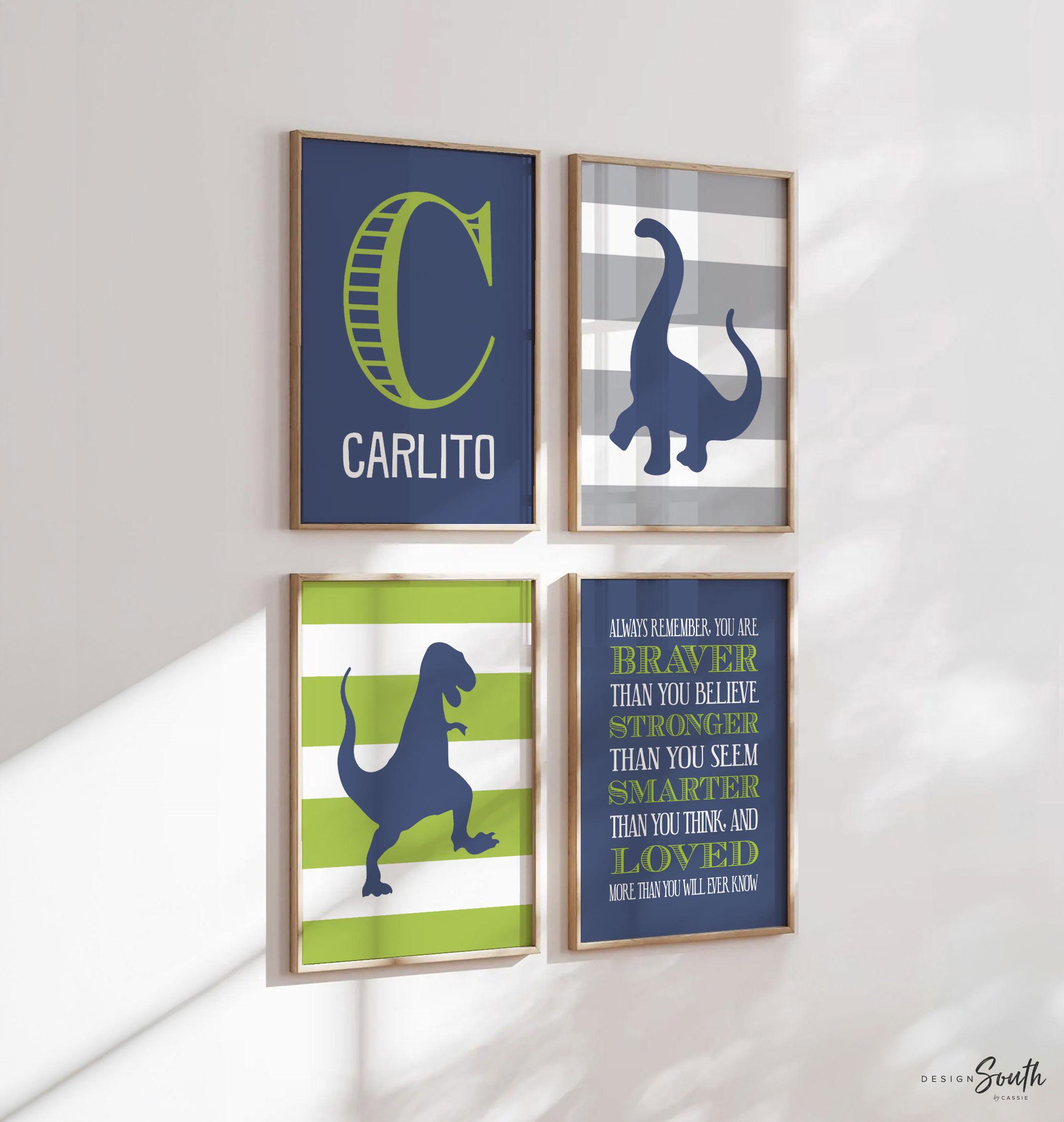 Product description: Dinosaur theme prints in soft navy blue, lime green and gray with striped backgrounds. Personalized name print and matching quote. Other color options are also available.