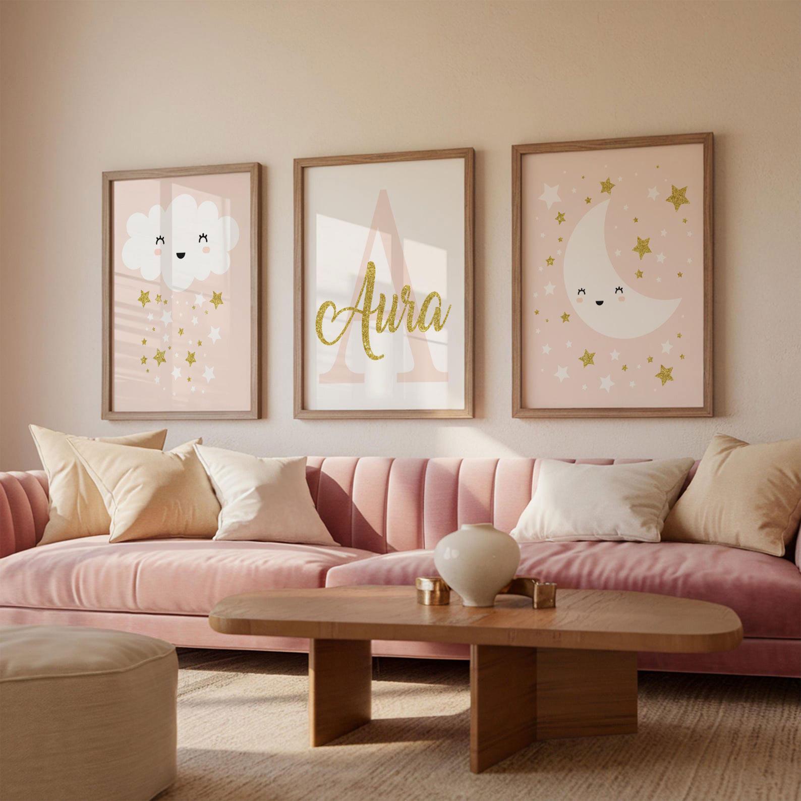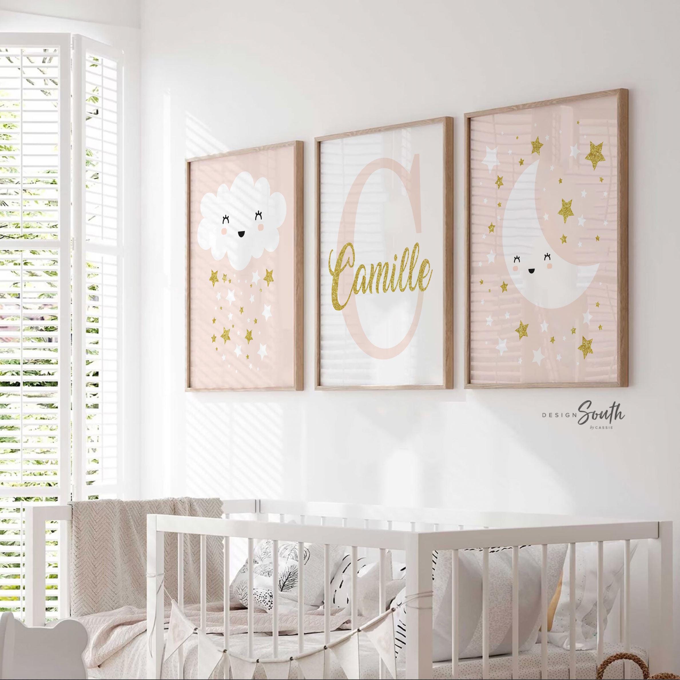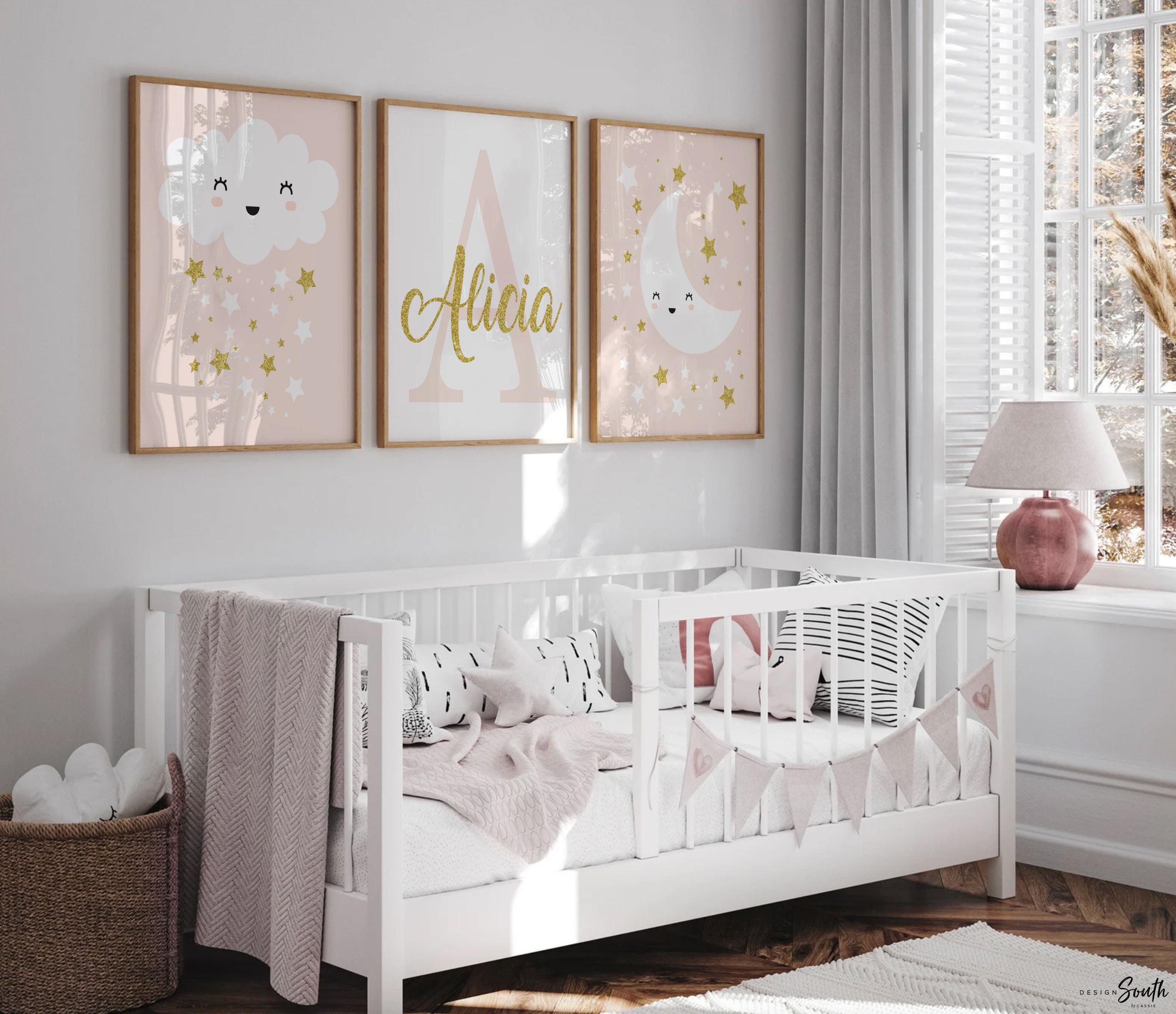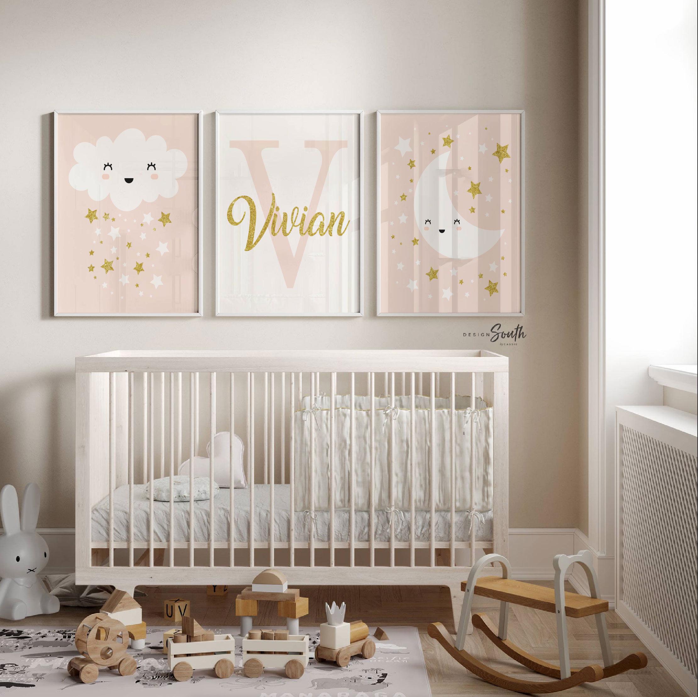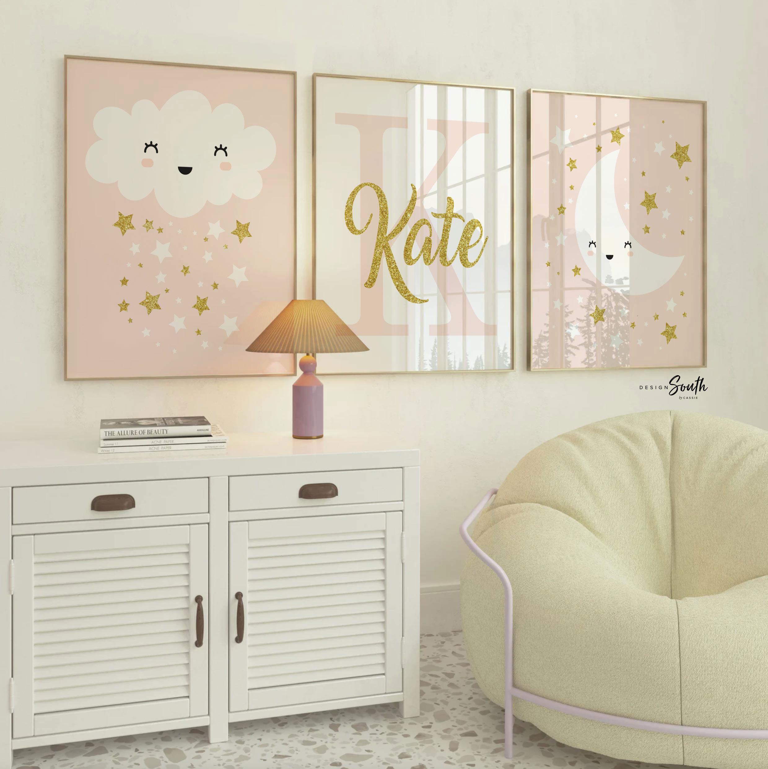 Product description: Celestial theme designs featuring stars, cloud and moon in colors pale blush and gold sparkles with matching monogram print to be customized with your child's name and initial. Note: The item listed is created digitally. Gold glitter nor sparkly paper was used in creating the design. High resolution photography of sparkles was used to create a 3D appearance of sparkles. Other options are also available in my shop.