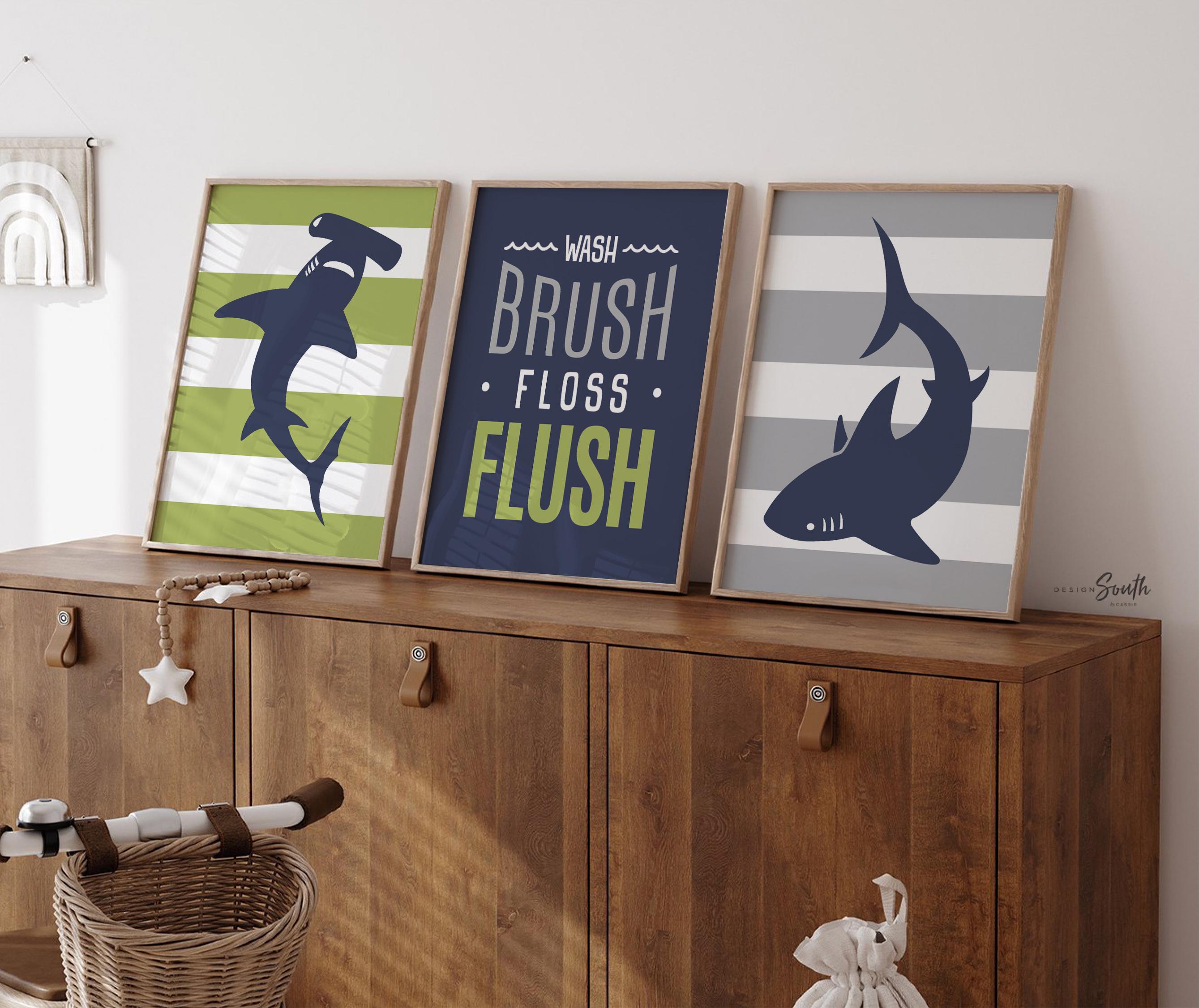 Product description: Shark designs in soft navy with pistachio and smoke striped backgrounds. Matching quote reading: "Wash, Brush, Floss, Flush." Other options are also available in my shop.