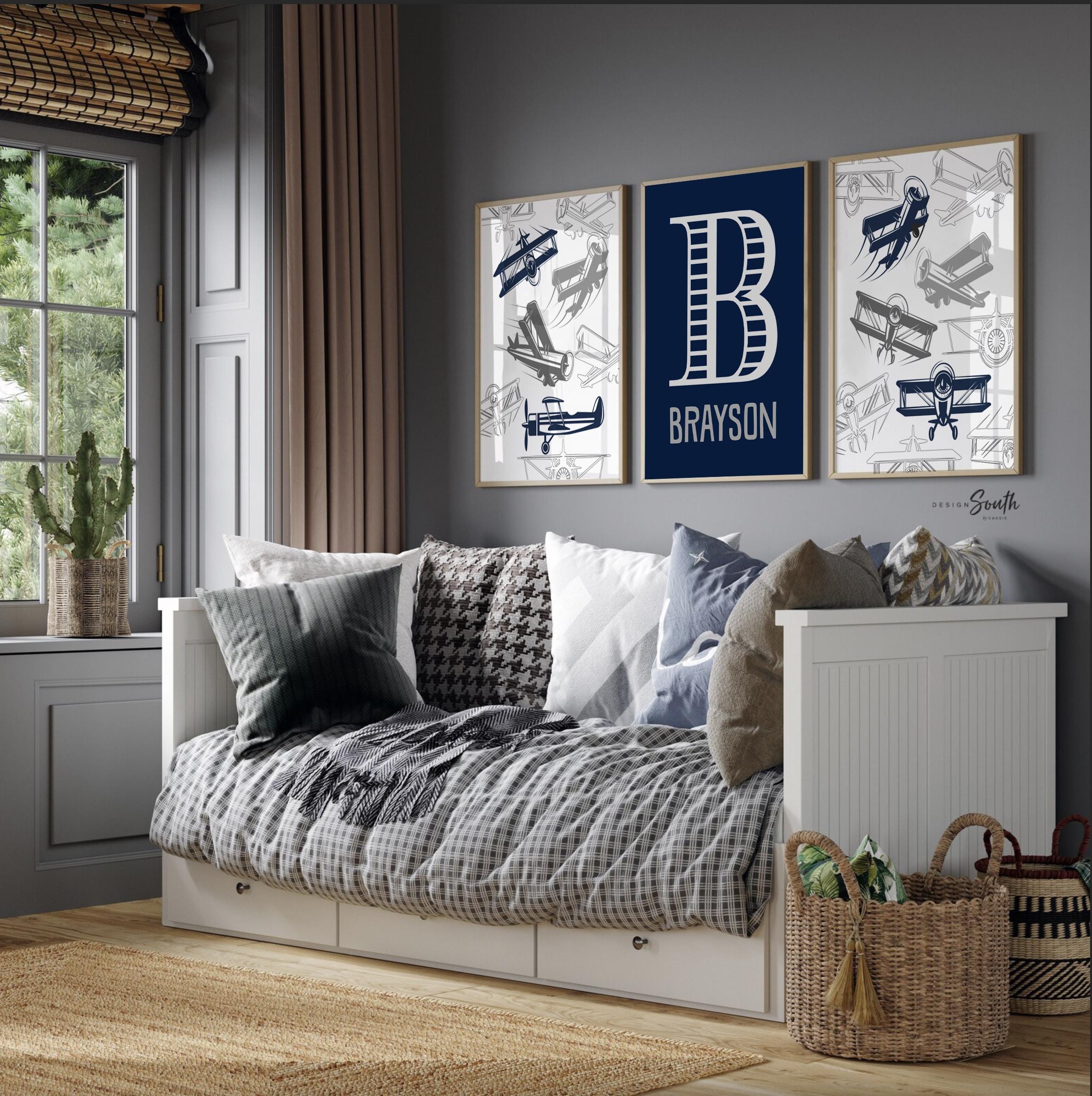 Product description: Airplane themed prints in navy blue, smoke and seagull with matching monogram print to be customized with your child's name and initial. Other options are also available in my shop.
