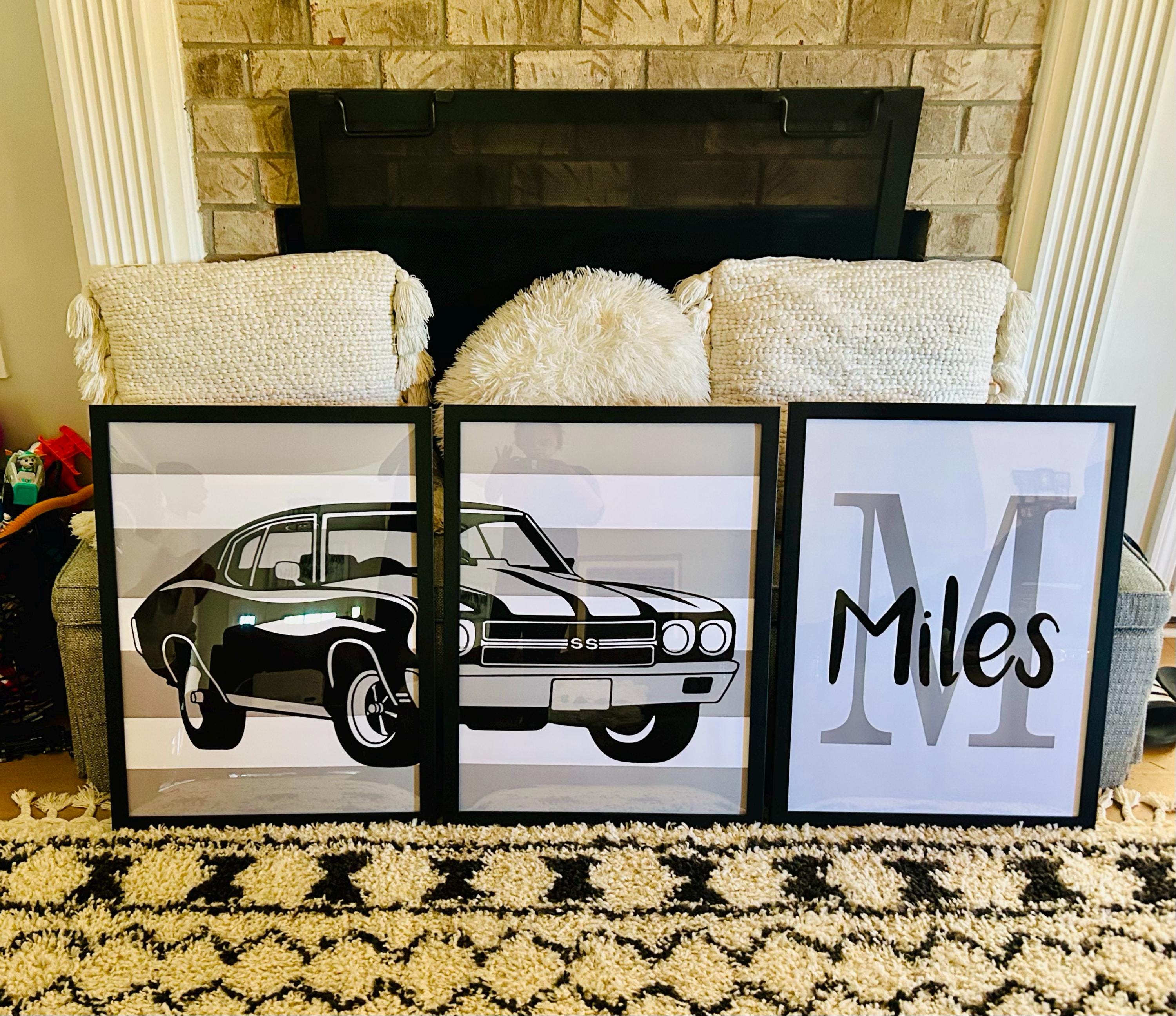 Product description: Classic car themed art prints featuring a Classic Chevrolet Chevelle SS in black and smoke gray with matching personalized name. Other options are also available in my shop.