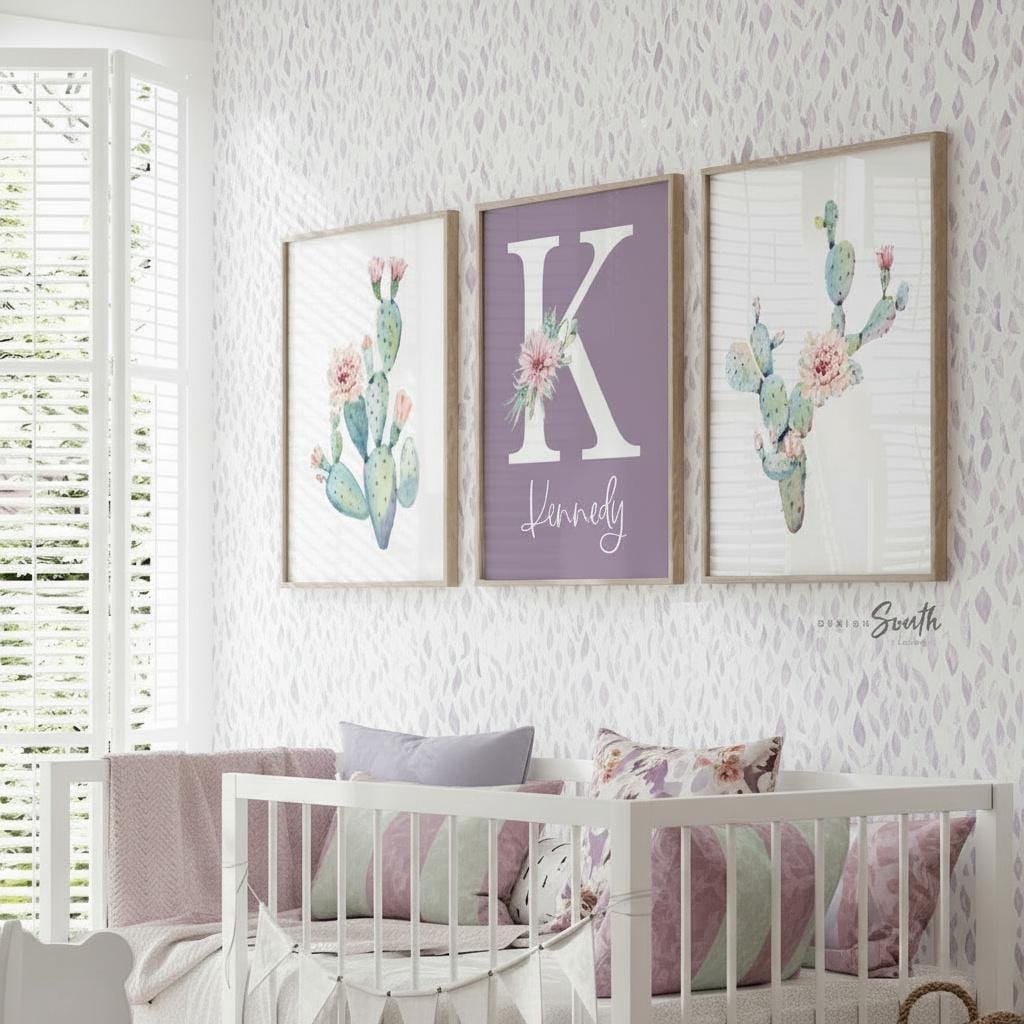 Product description: Cactus bloom themed prints with matching monogram print in the color 'syrian' to be customized with your child's name and initial. Other options are also available in my shop.