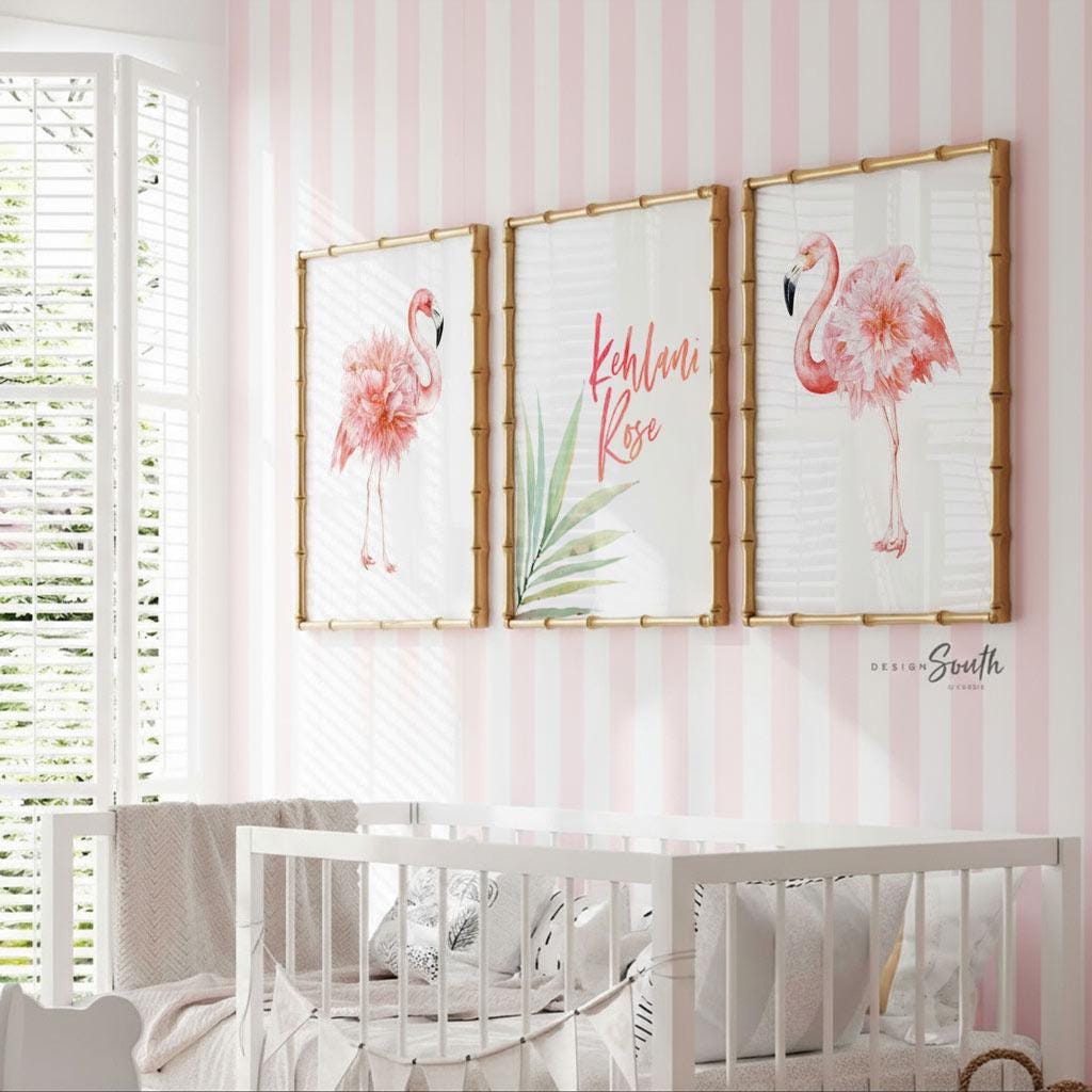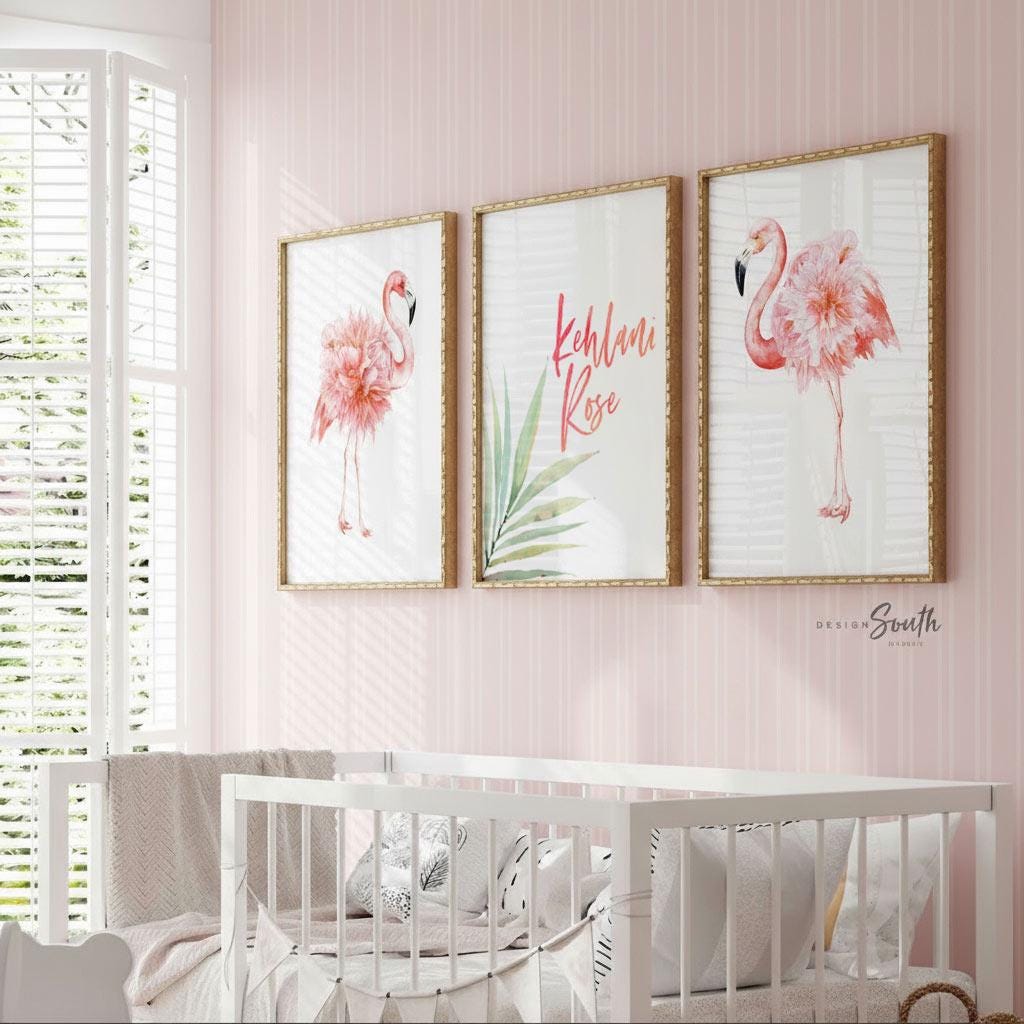 Product description: Tropical theme watercolor prints featuring floral decorated pink flamingos and a personalized name accented with a palm leaf. Other options are also available in my shop.