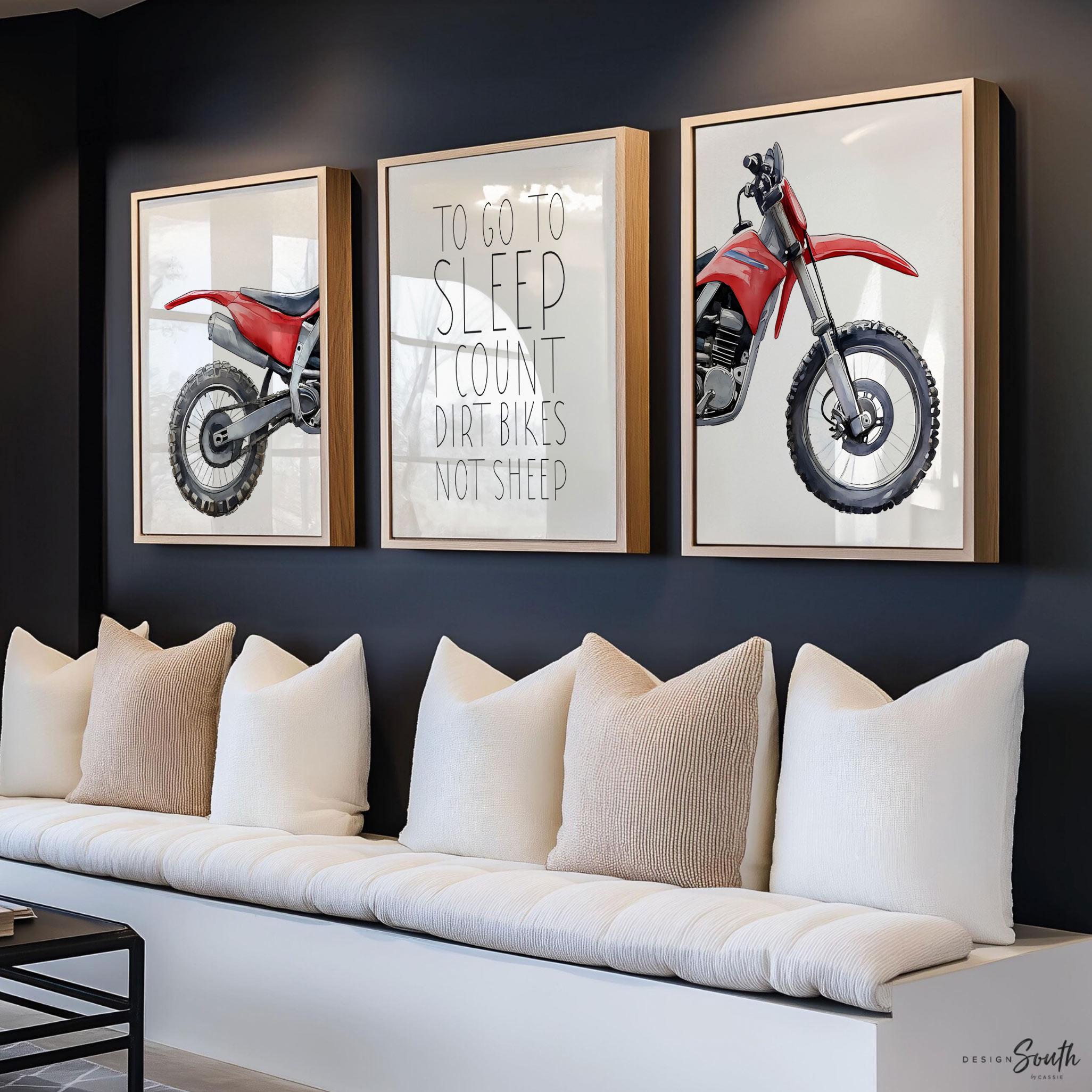 Product description: Dirt bike dyptich prints in red watercolor with matching quote print reading, "To go to sleep I count dirt bikes not sheep." Other options are also available in my shop.