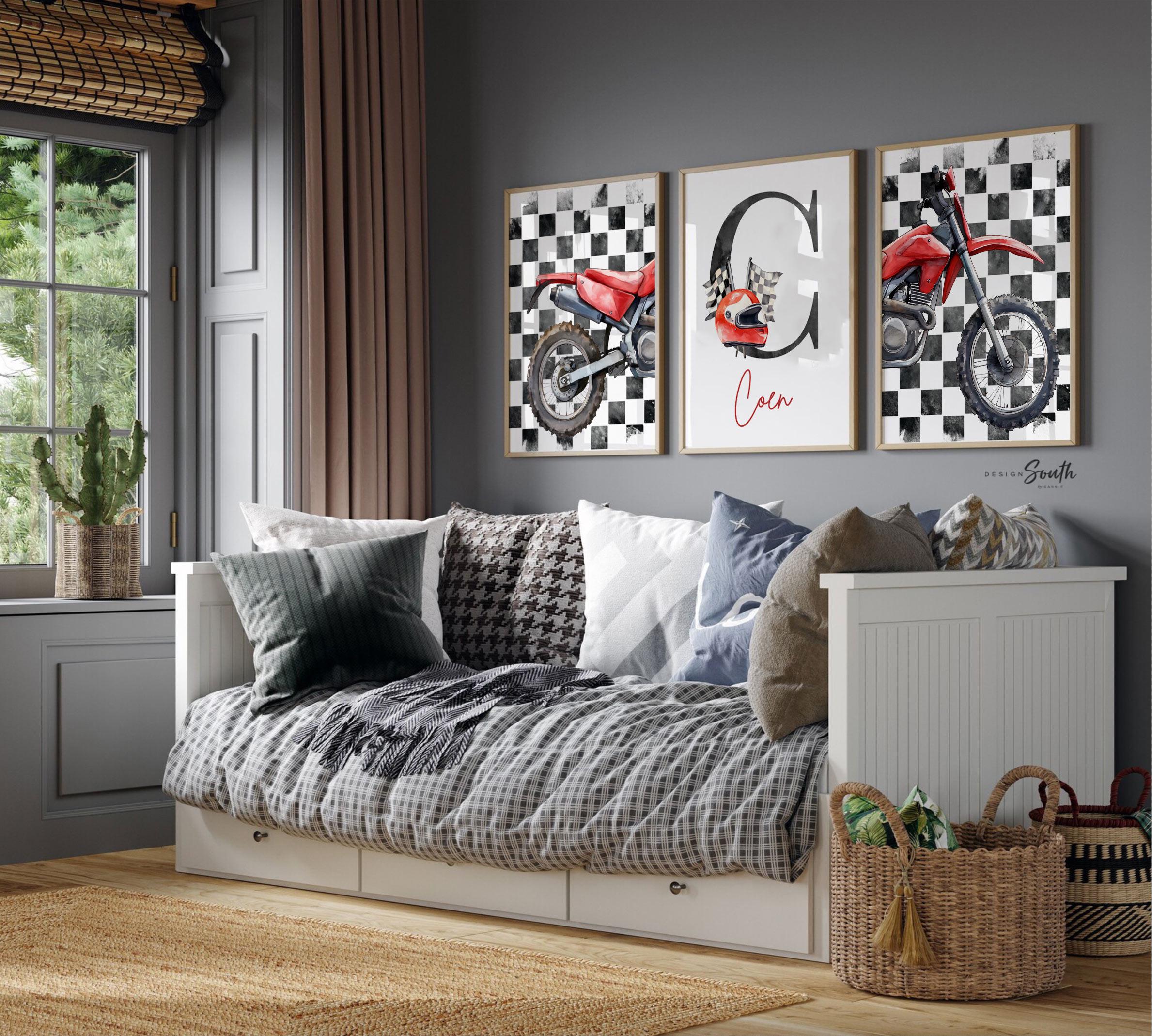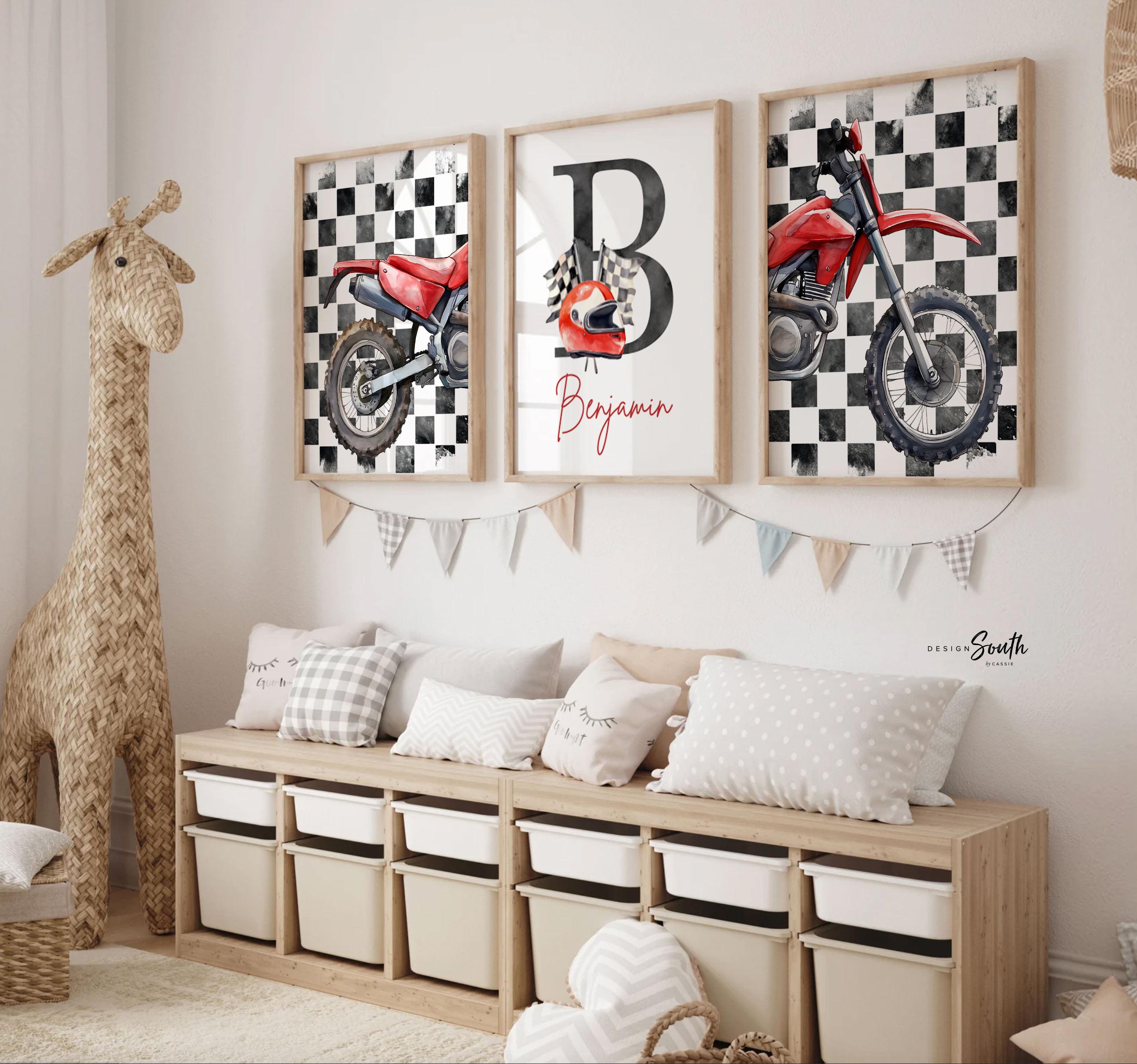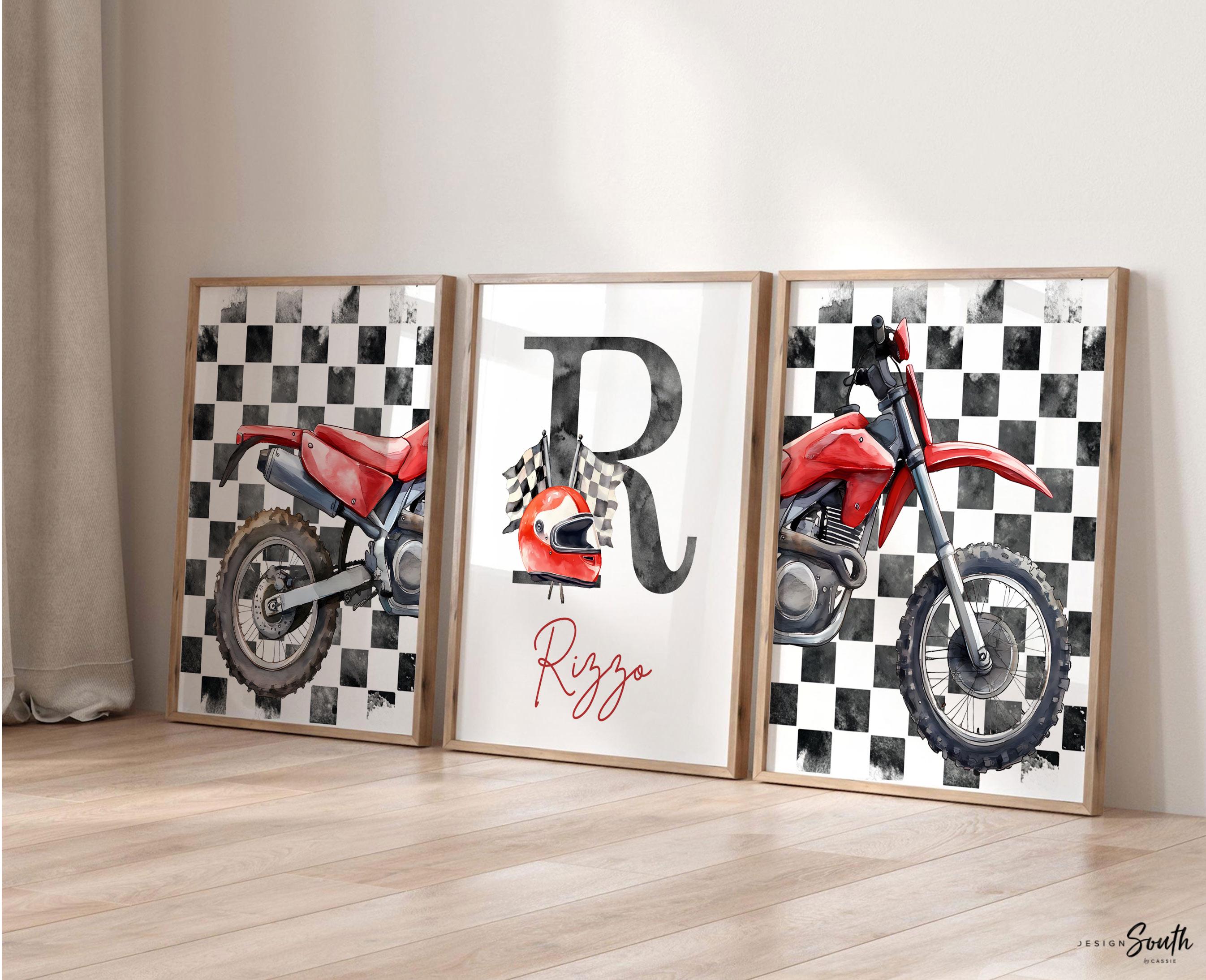 Product description: Dirt bike dyptich prints in red detailed watercolor with distressed checkerboard patterns and matching monogram print accented with a helmet and flag to be customized with your child's name and initial. Other options are also available in my shop.