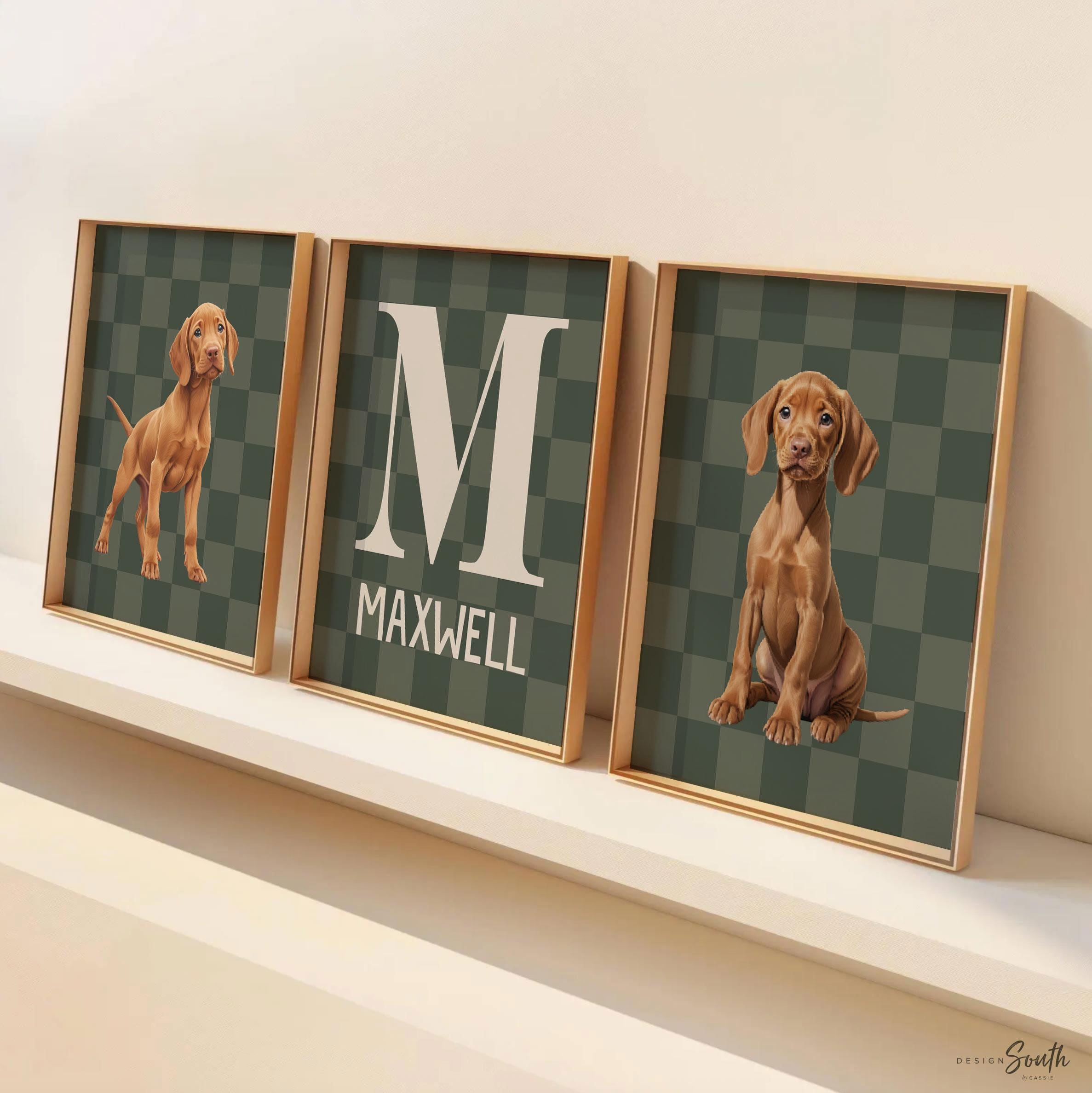 Product description: Wall art prints featuring two Hungarian Vizsla puppies with trendy green checkerboard backgrounds and a matching monogram print to be customized with your child's name and initial. Other options are also available in my shop.