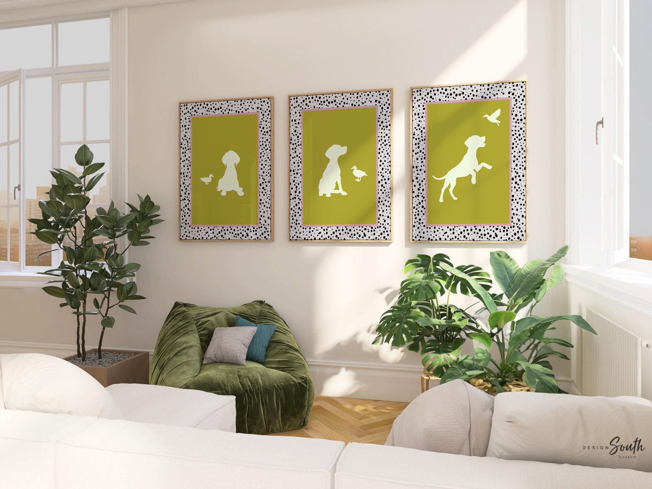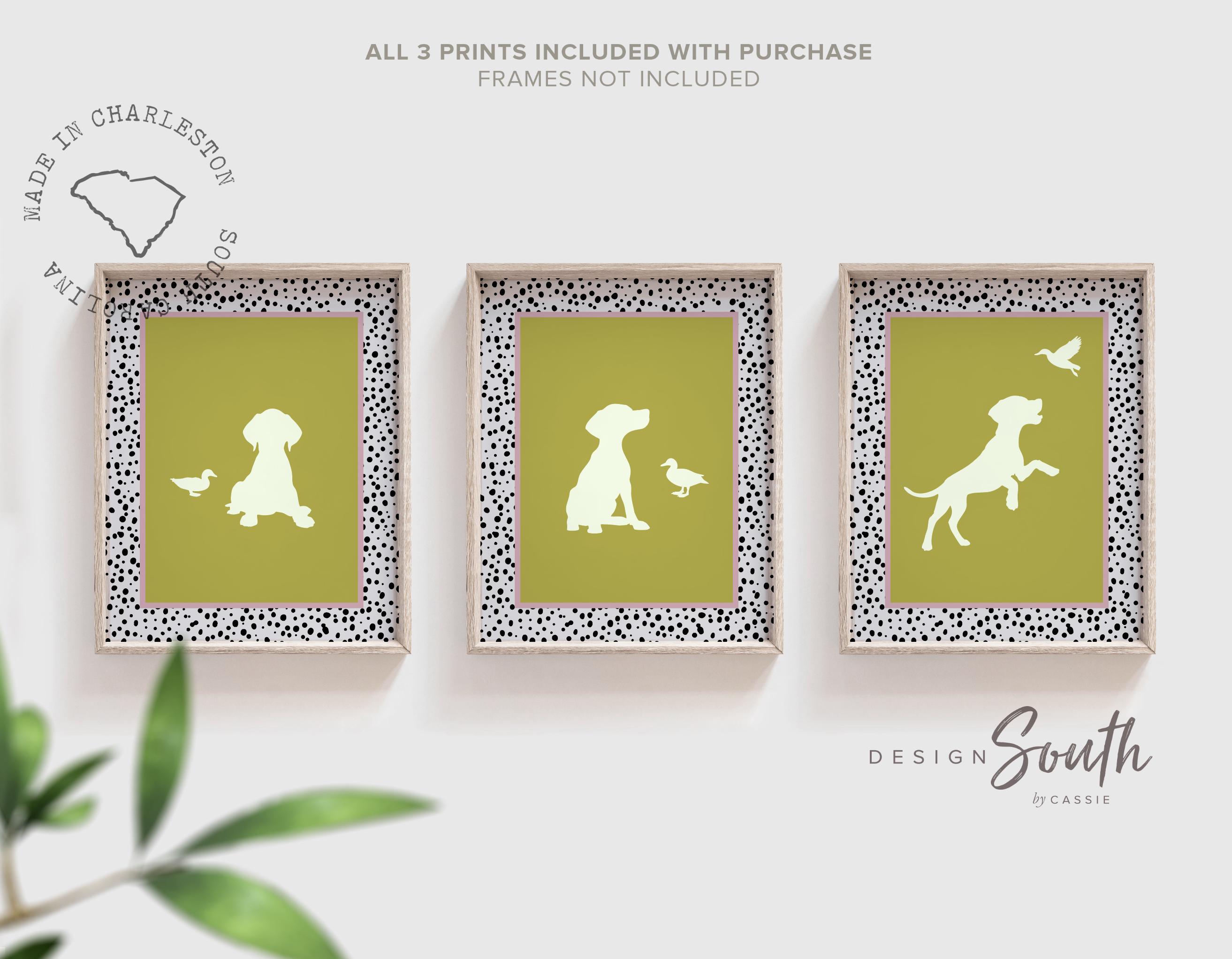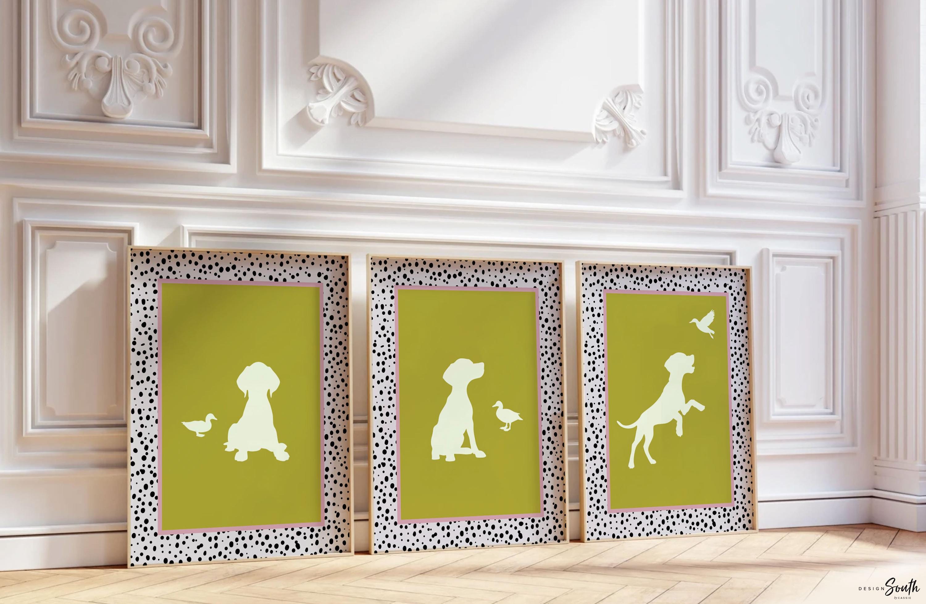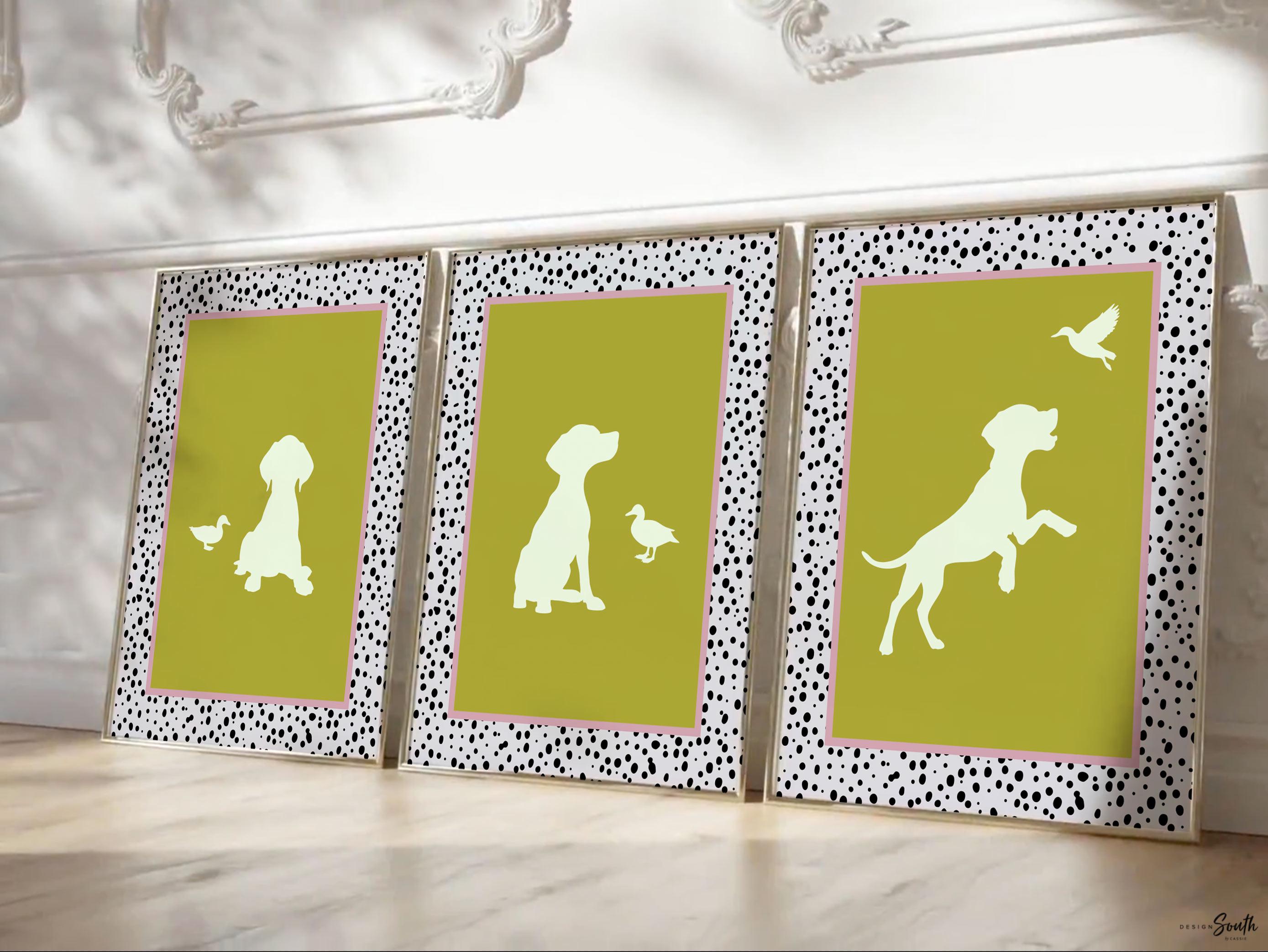 Product description: Wall art prints featuring three German shorthaired pointer puppy silhouettes accented with mallard ducks and polka dot patterns in a funky, retro color scheme. Other options are also available in my shop.