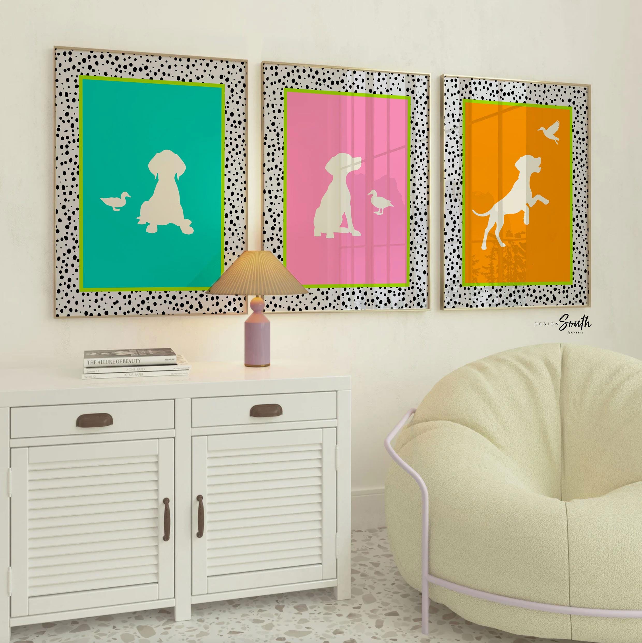 Product description: Wall art prints featuring three German shorthaired pointer puppies accented with mallard ducks in a neon color scheme with Dalmatian speckles.