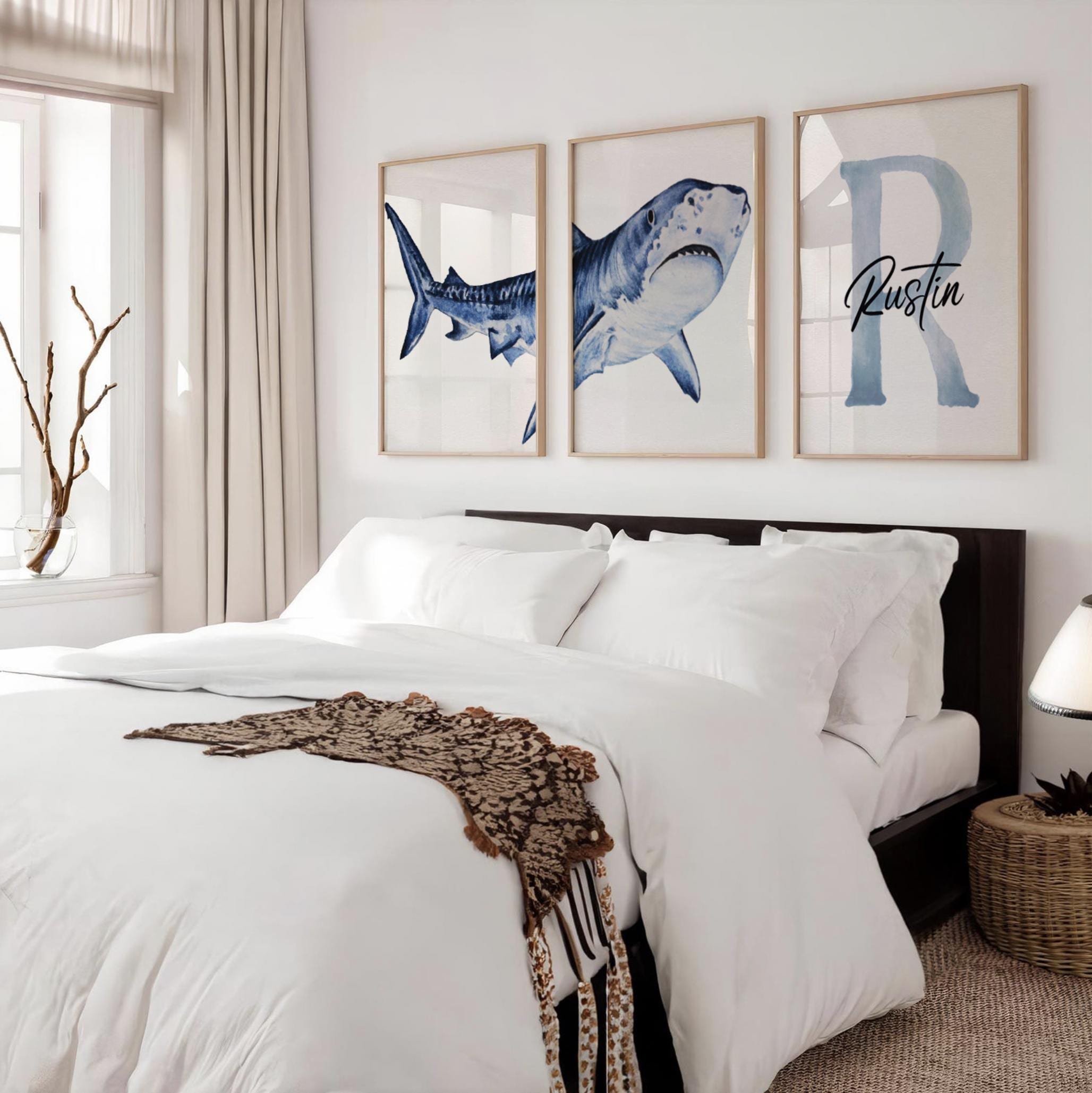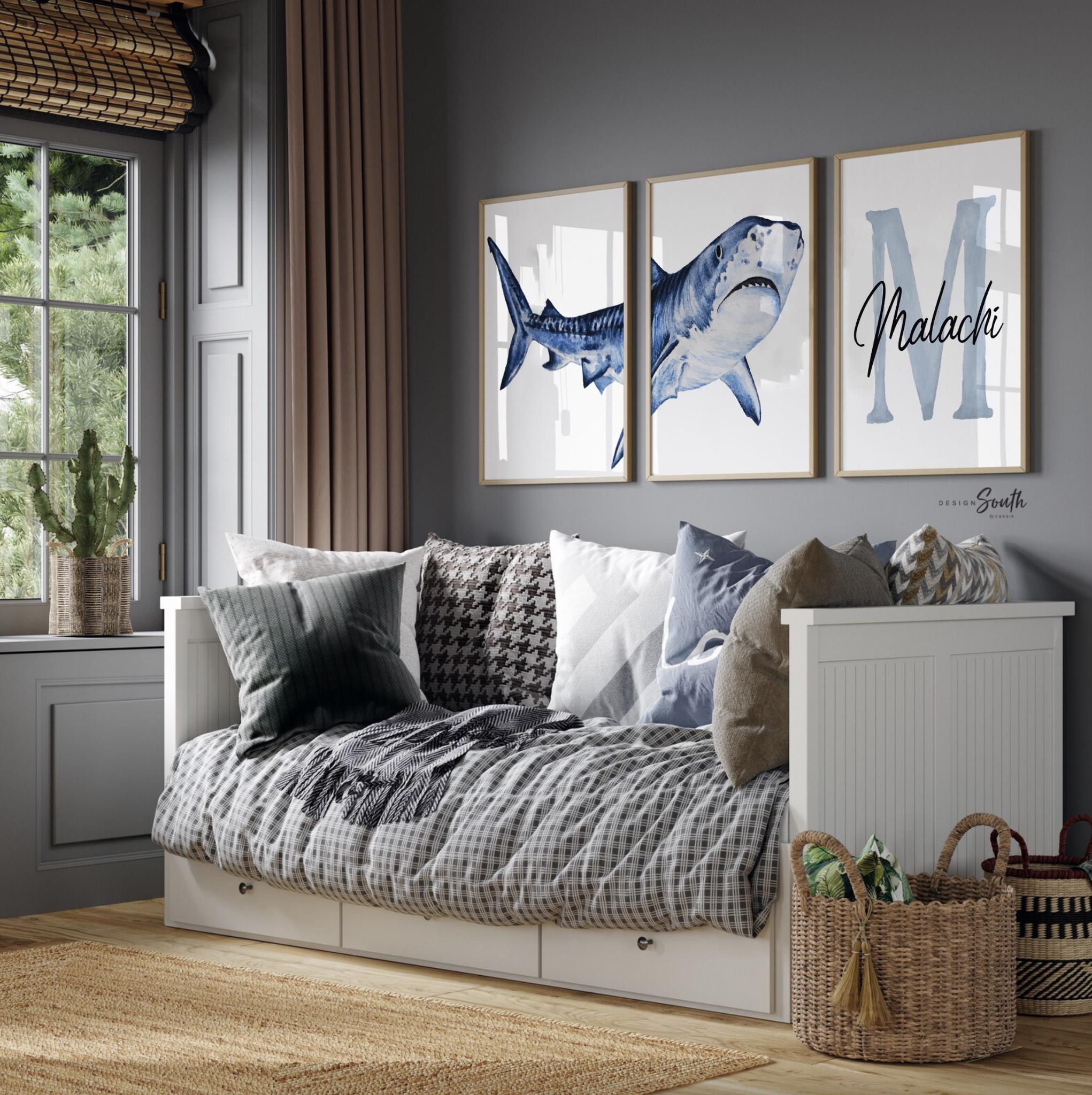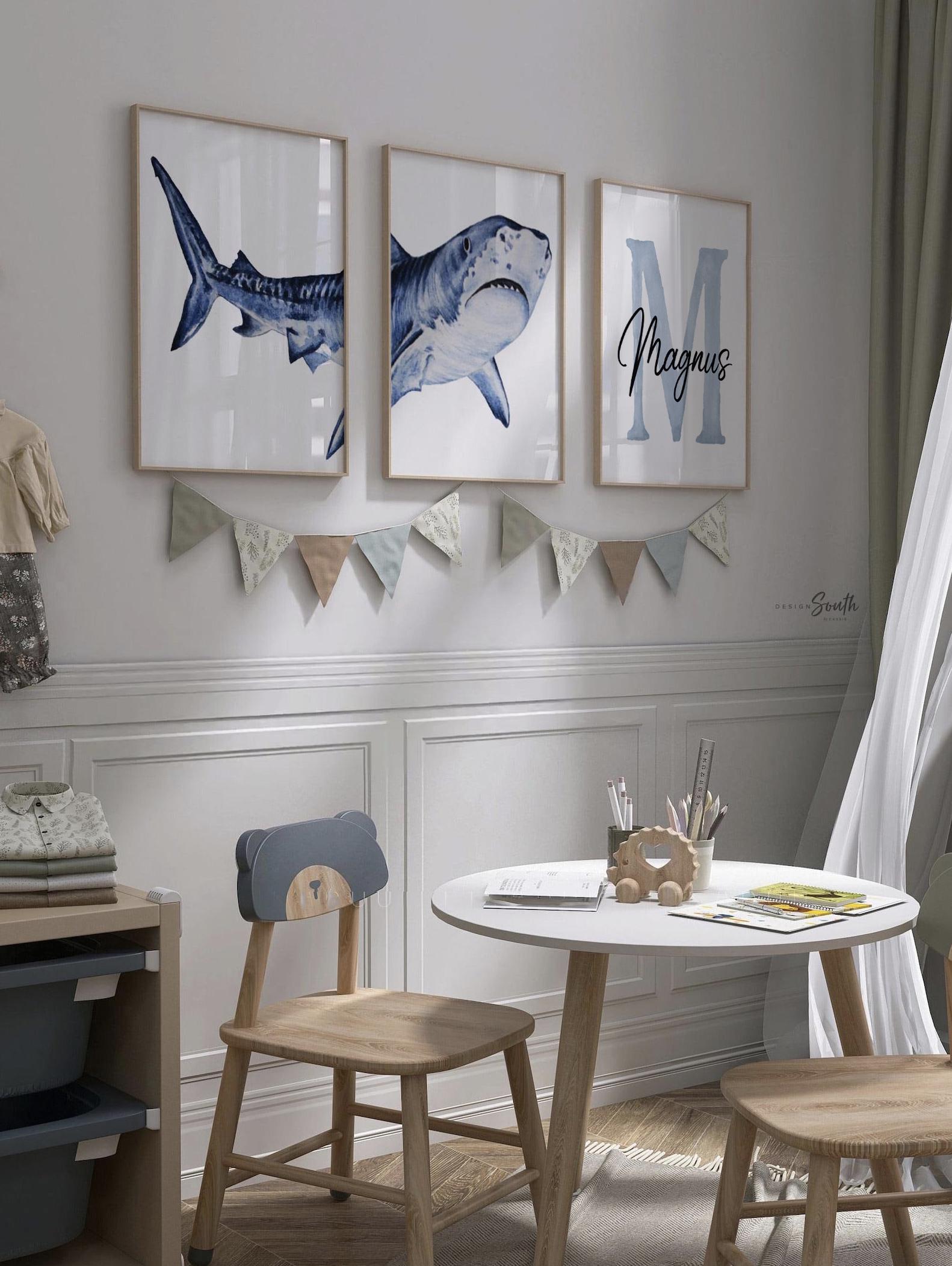 Product description: Shark themed prints featuring a watercolor shark diptych and personalized monogram to be customized with your child's name and initial. Other options are also available in my shop.