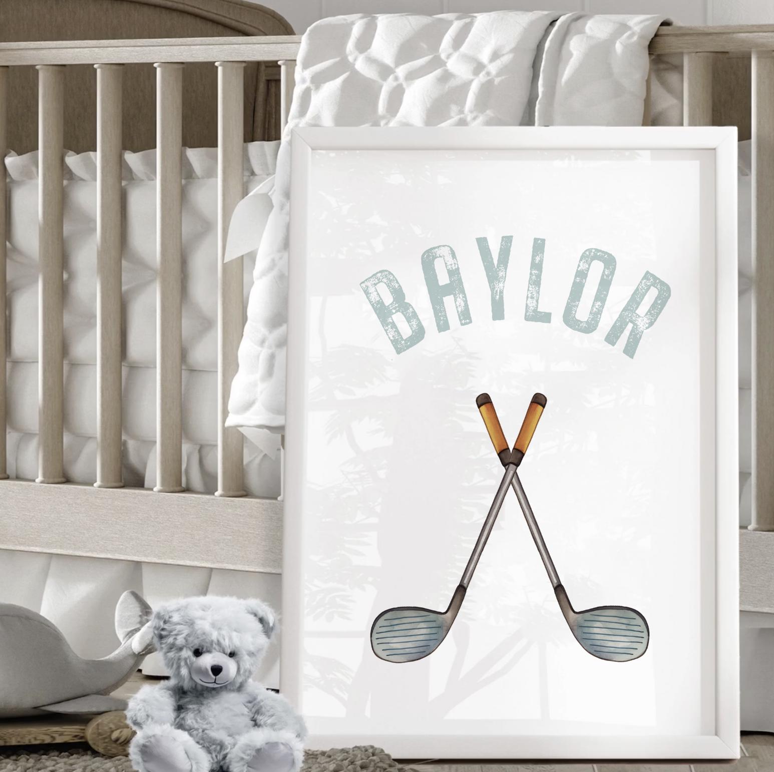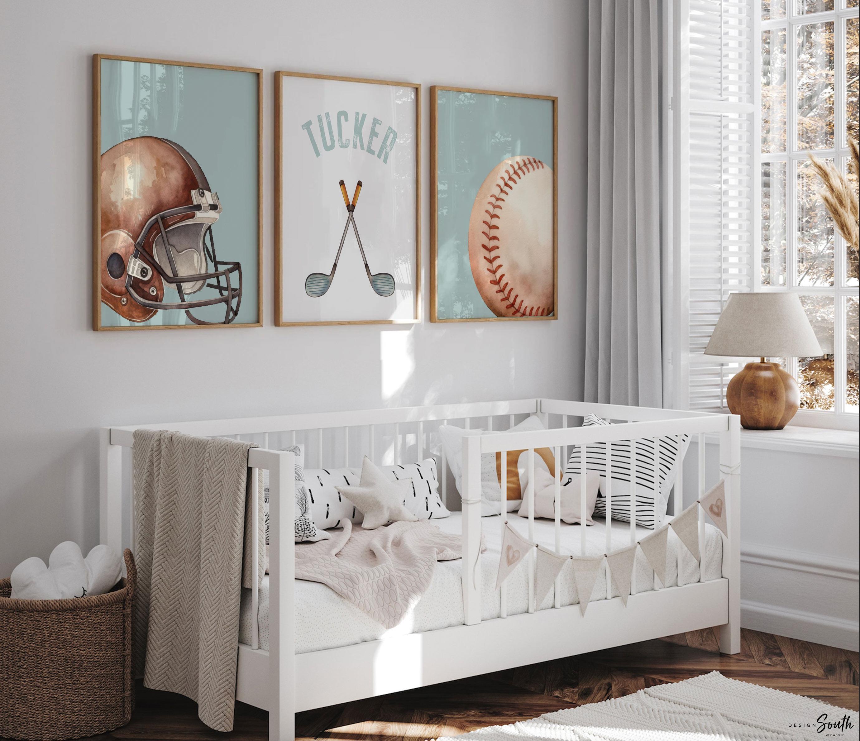 Product description: Sports theme watercolor prints including a football helmet, baseball, golf clubs and matching personalized print to be customized with your child's name. You can request to swap out any of the sports with a basketball, football, golf ball, soccer ball, or tennis ball. Other options are also available in my shop.