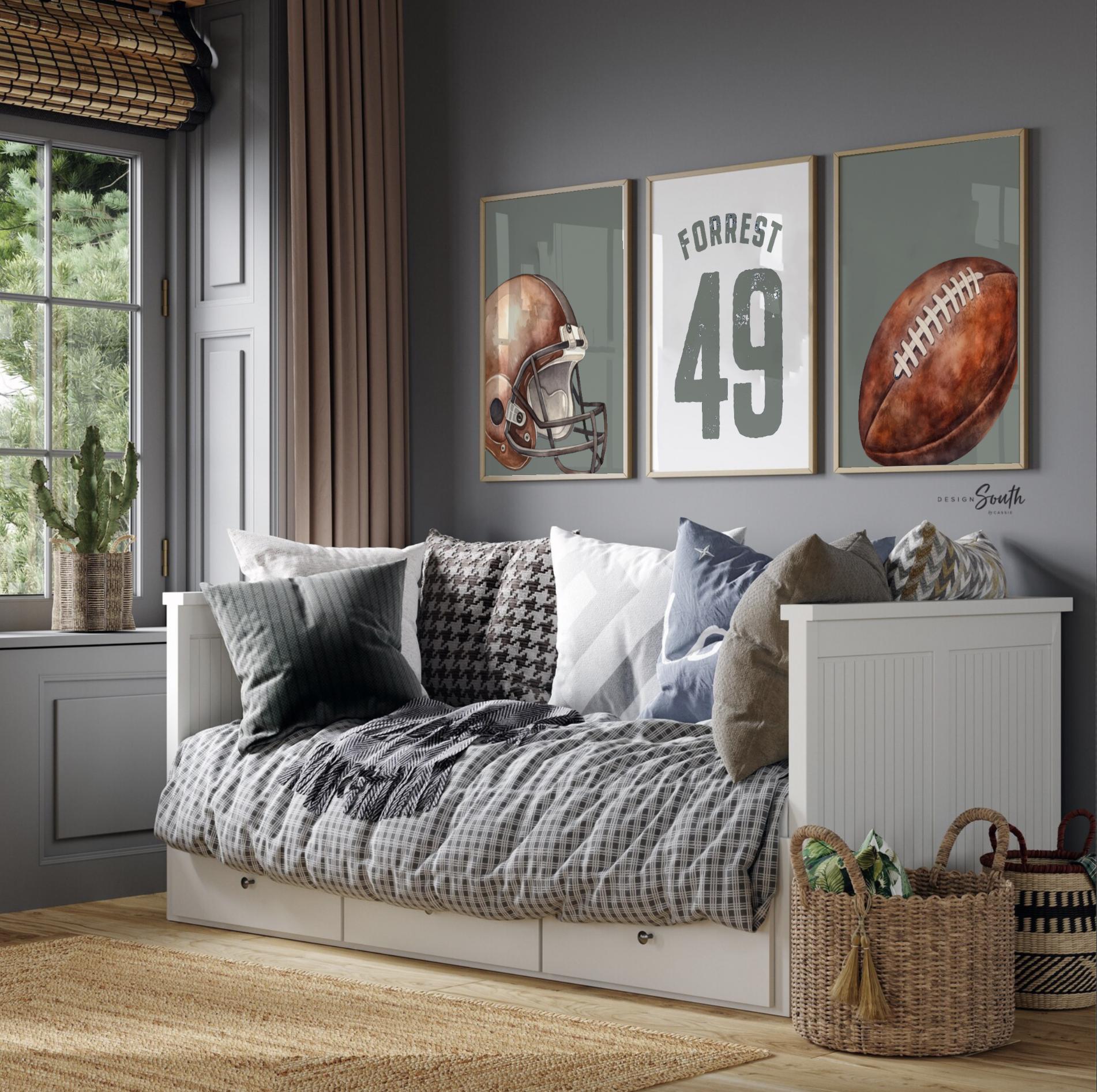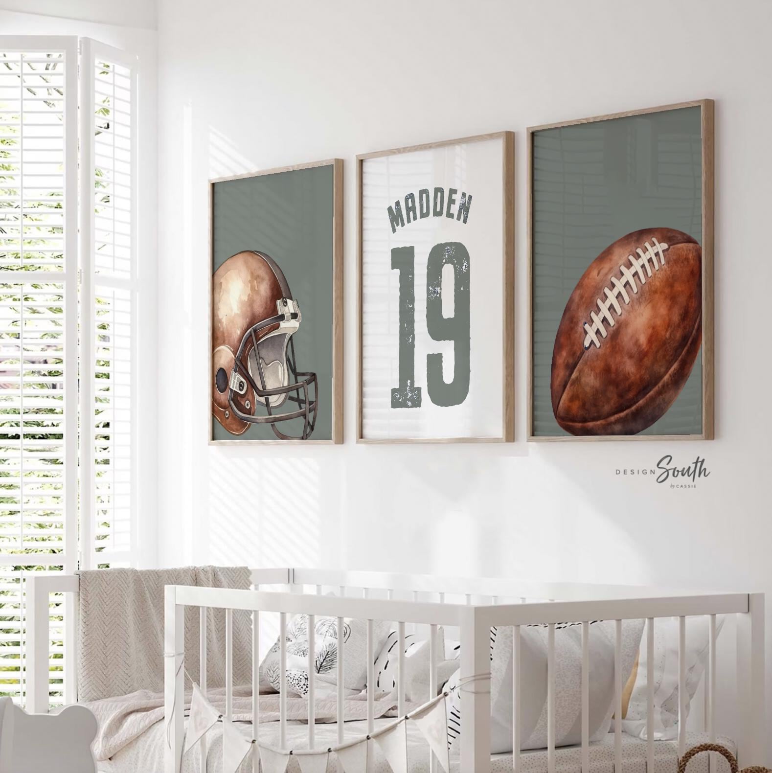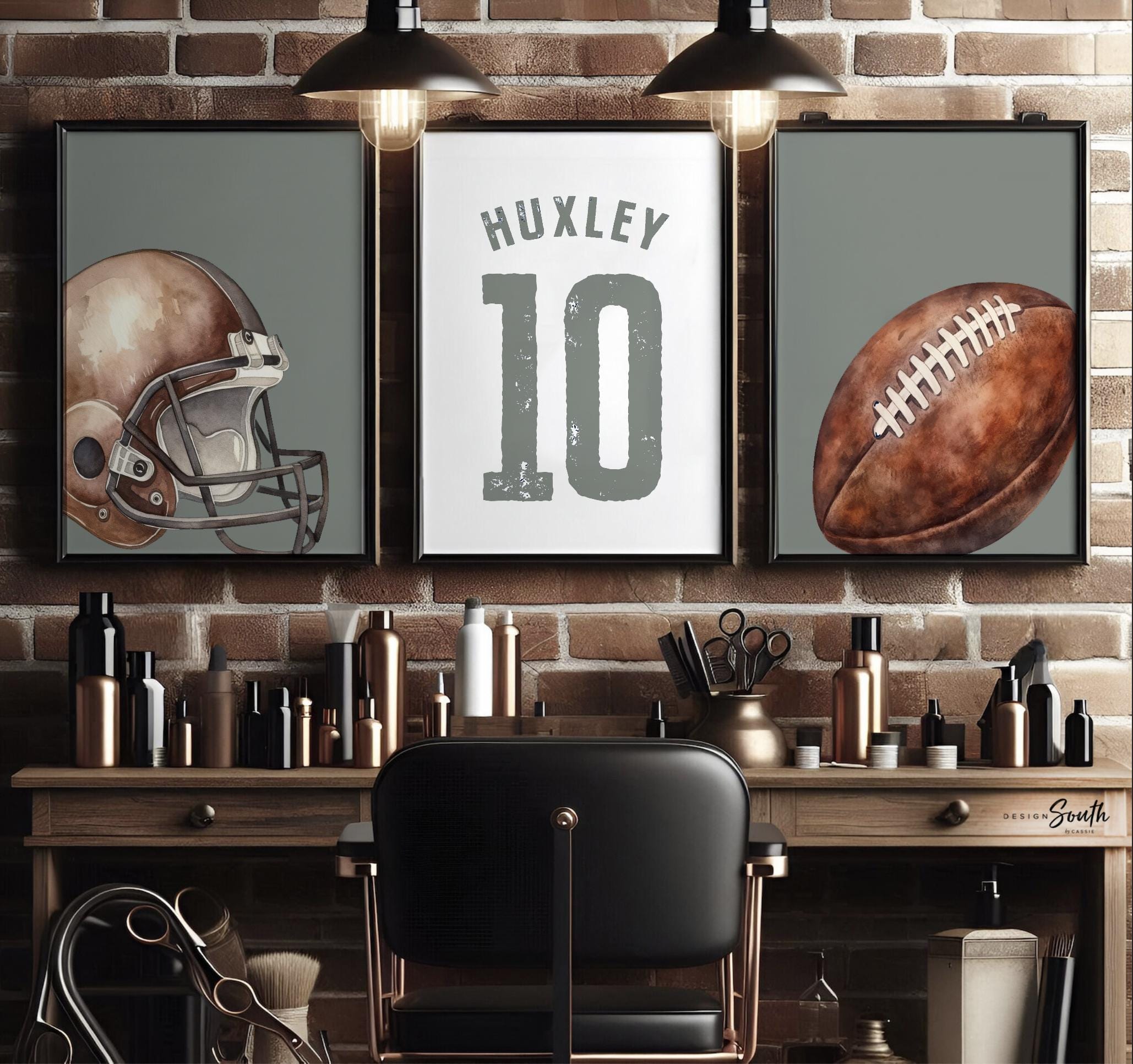 Product description: Football theme watercolor prints including a football, helmet and matching personalized print to be customized with your child's name and number. Other options are also available in my shop.