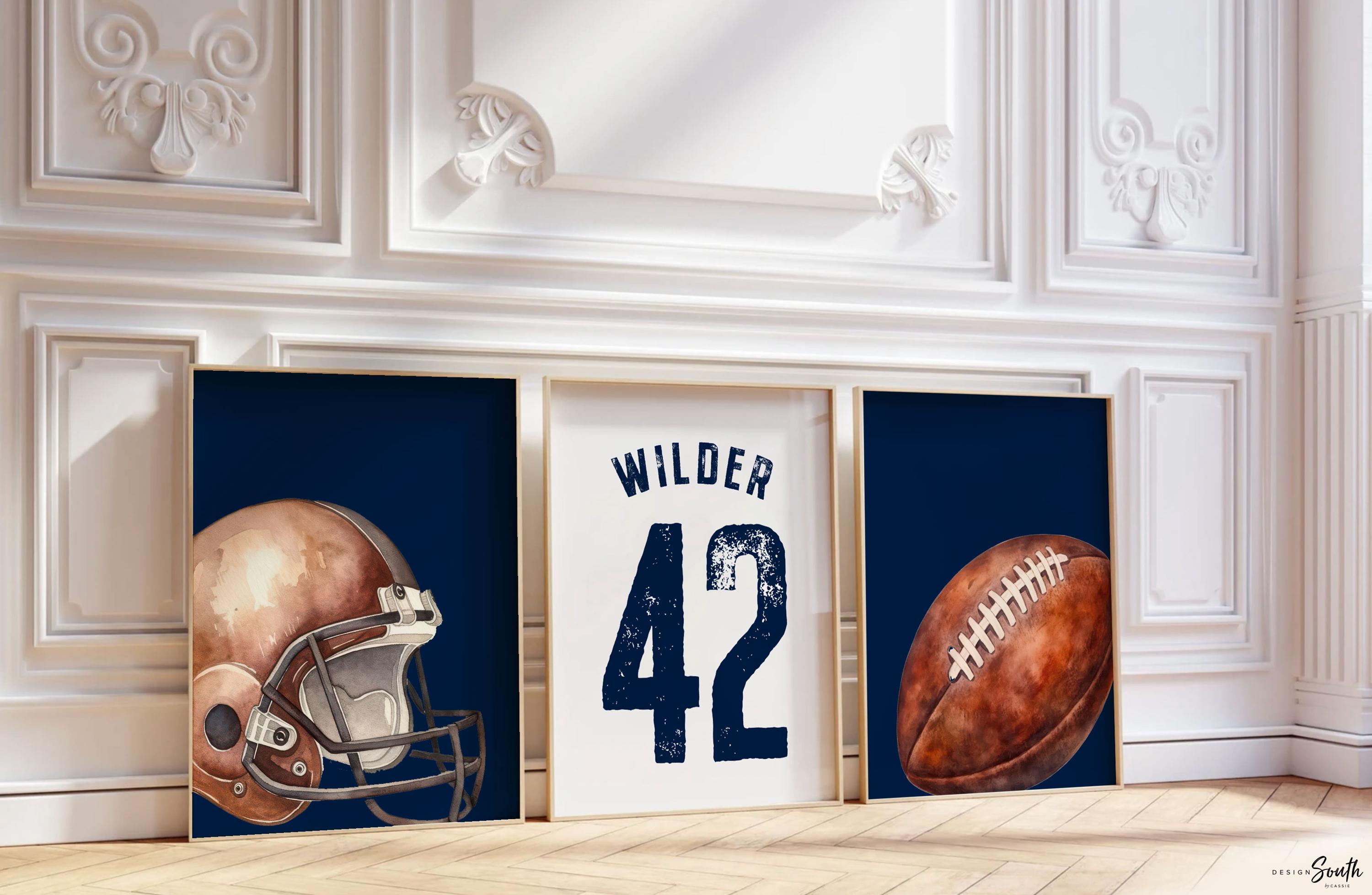 Product description: Football theme watercolor prints including a football, helmet and matching personalized print to be customized with your child's name and number. Other options are also available in my shop.