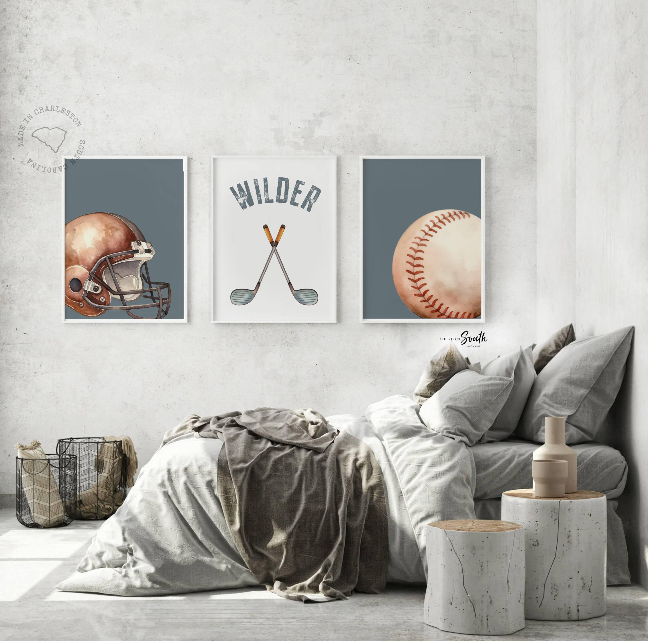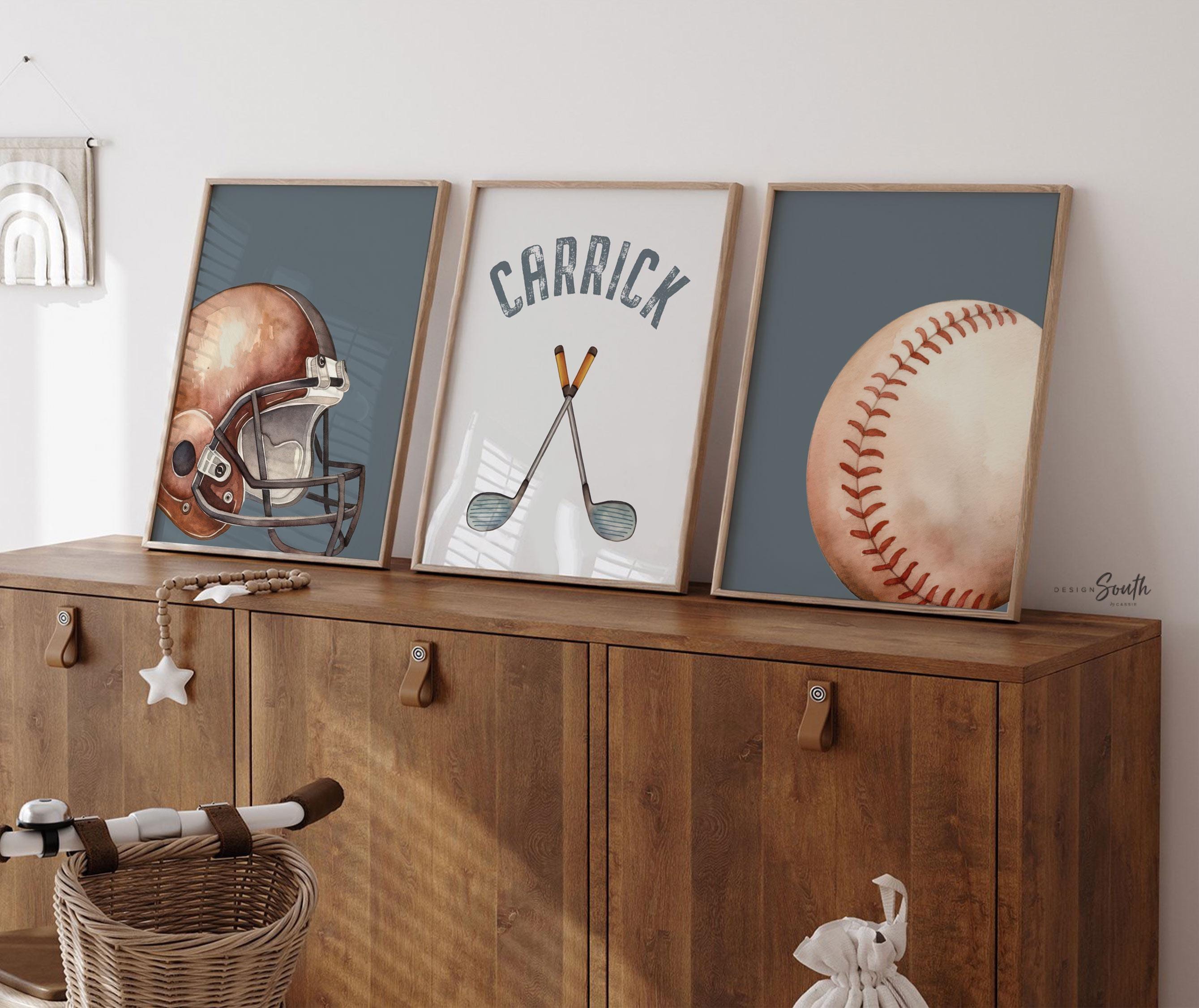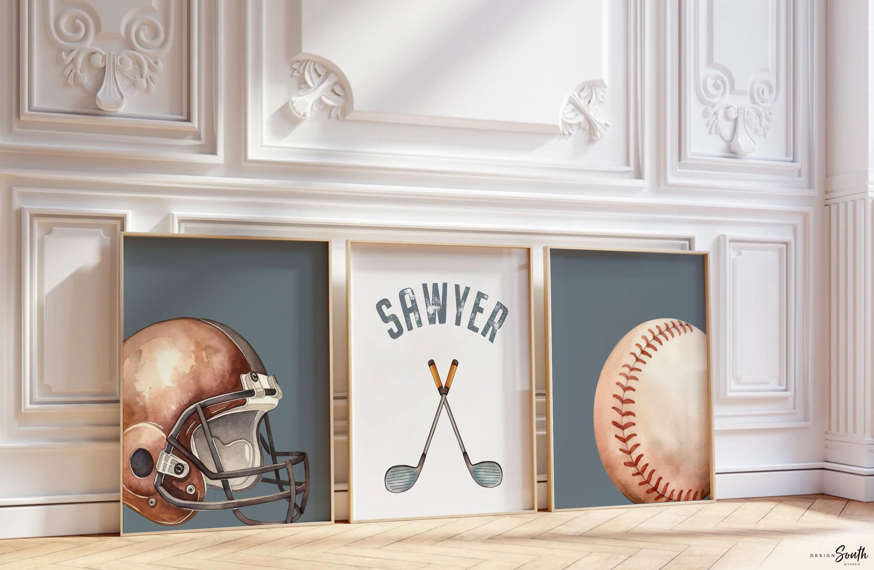 Product description: Sports theme watercolor prints including a football helmet, baseball, golf clubs and matching personalized print to be customized with your child's name. You can request to swap out any of the sports with a basketball, football, golf ball, soccer ball, or tennis ball. Other options are also available in my shop.