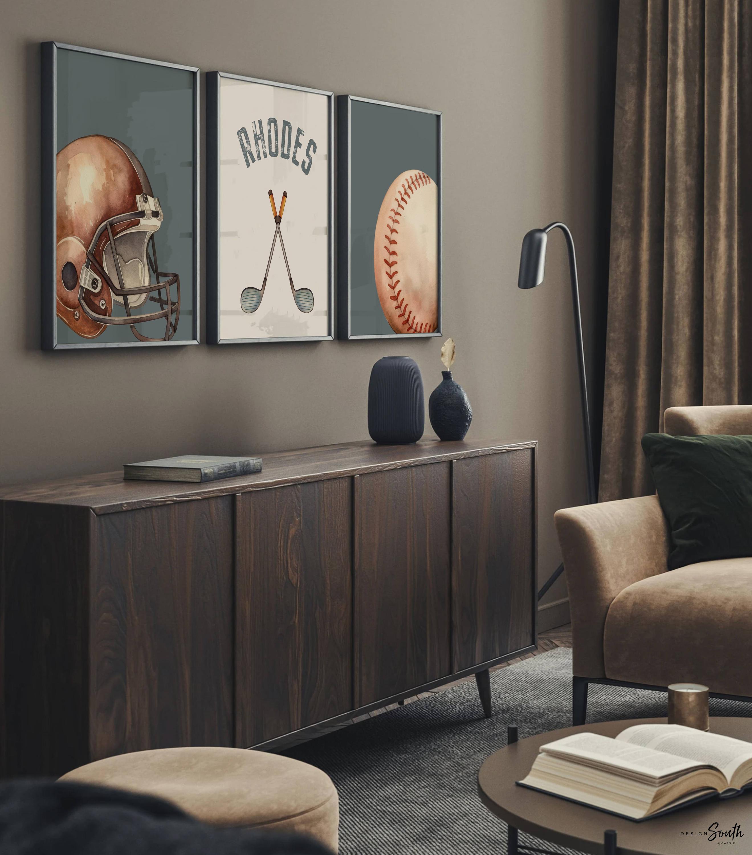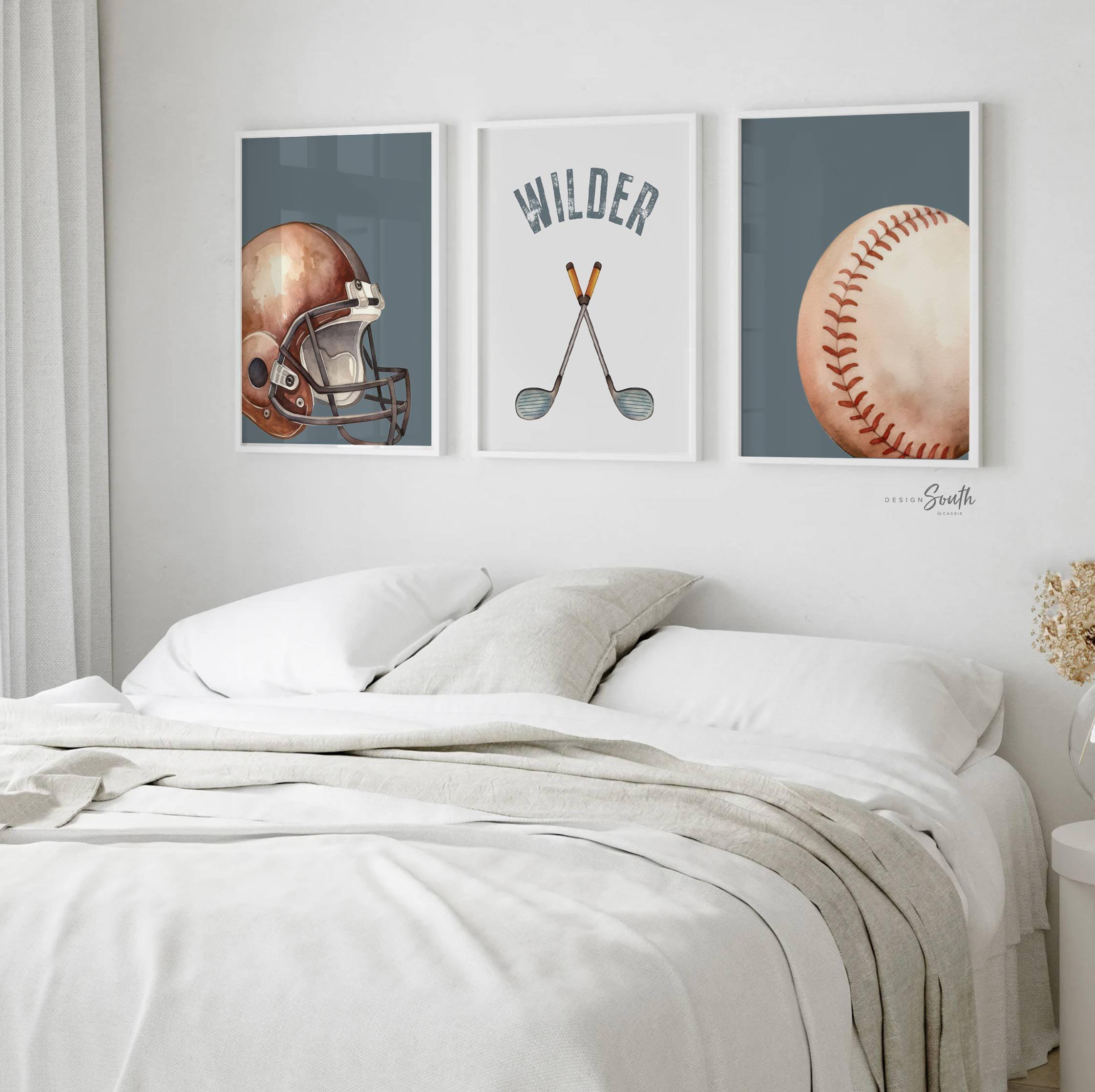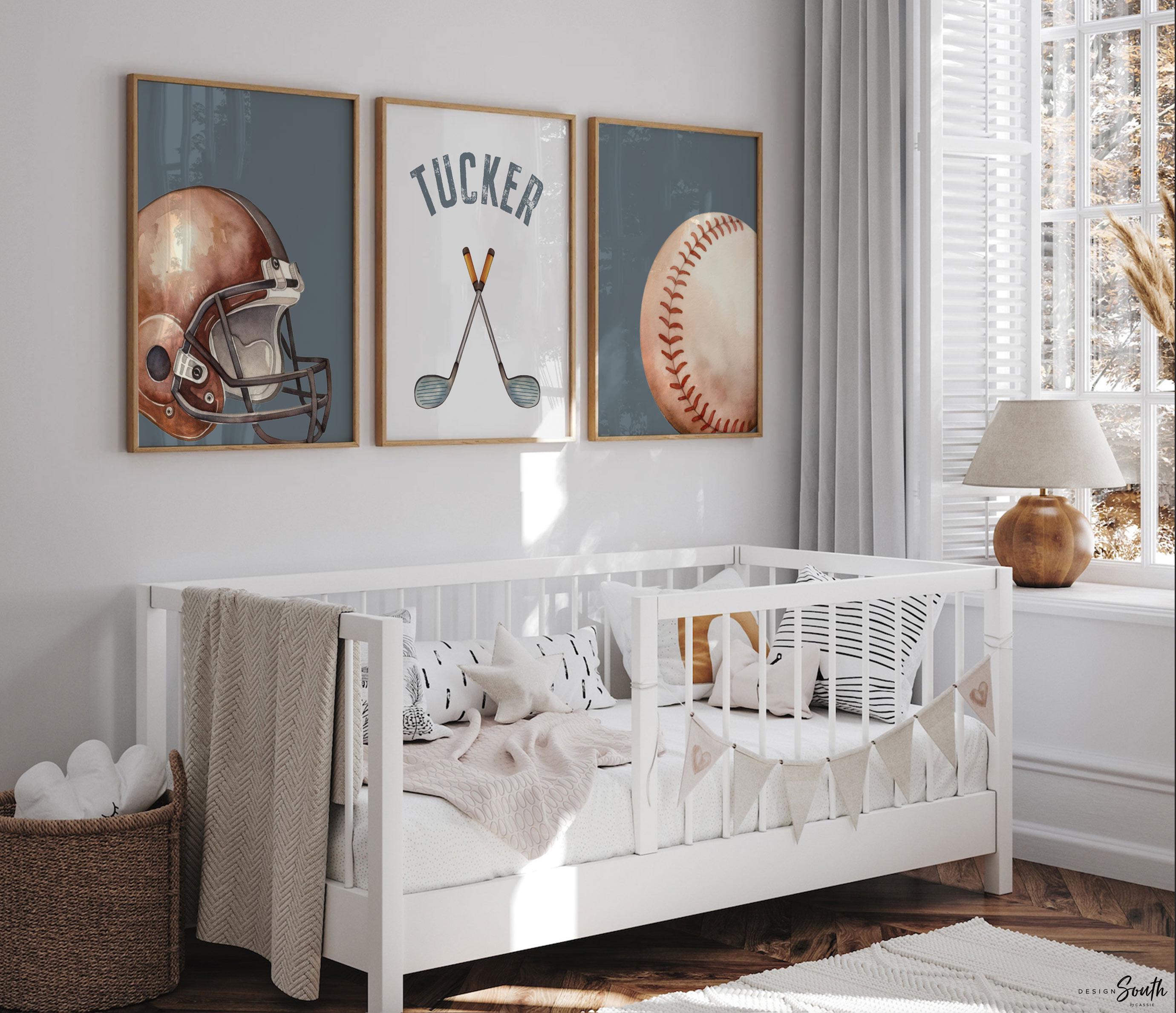 Product description: Sports theme watercolor prints including a football helmet, baseball, golf clubs and matching personalized print to be customized with your child's name. You can request to swap out any of the sports with a basketball, football, golf ball, soccer ball, or tennis ball. Other options are also available in my shop.