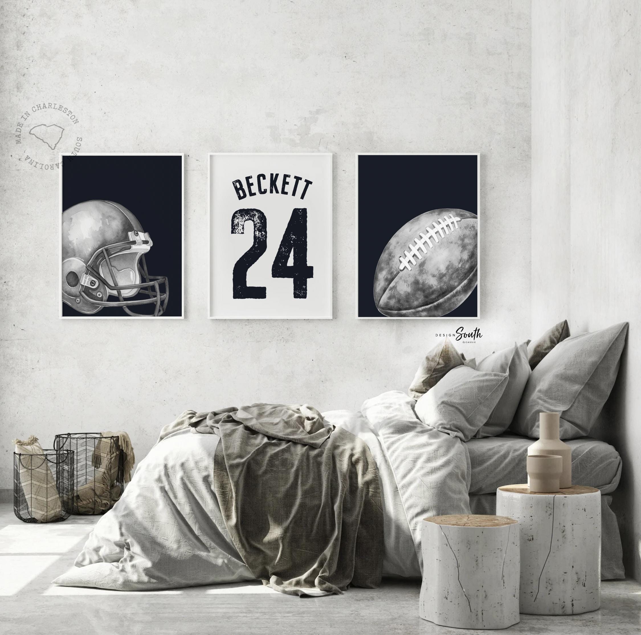 Product description: Football theme watercolor prints including a football, helmet and matching personalized print to be customized with your child's name and number. Other options are also available in my shop.