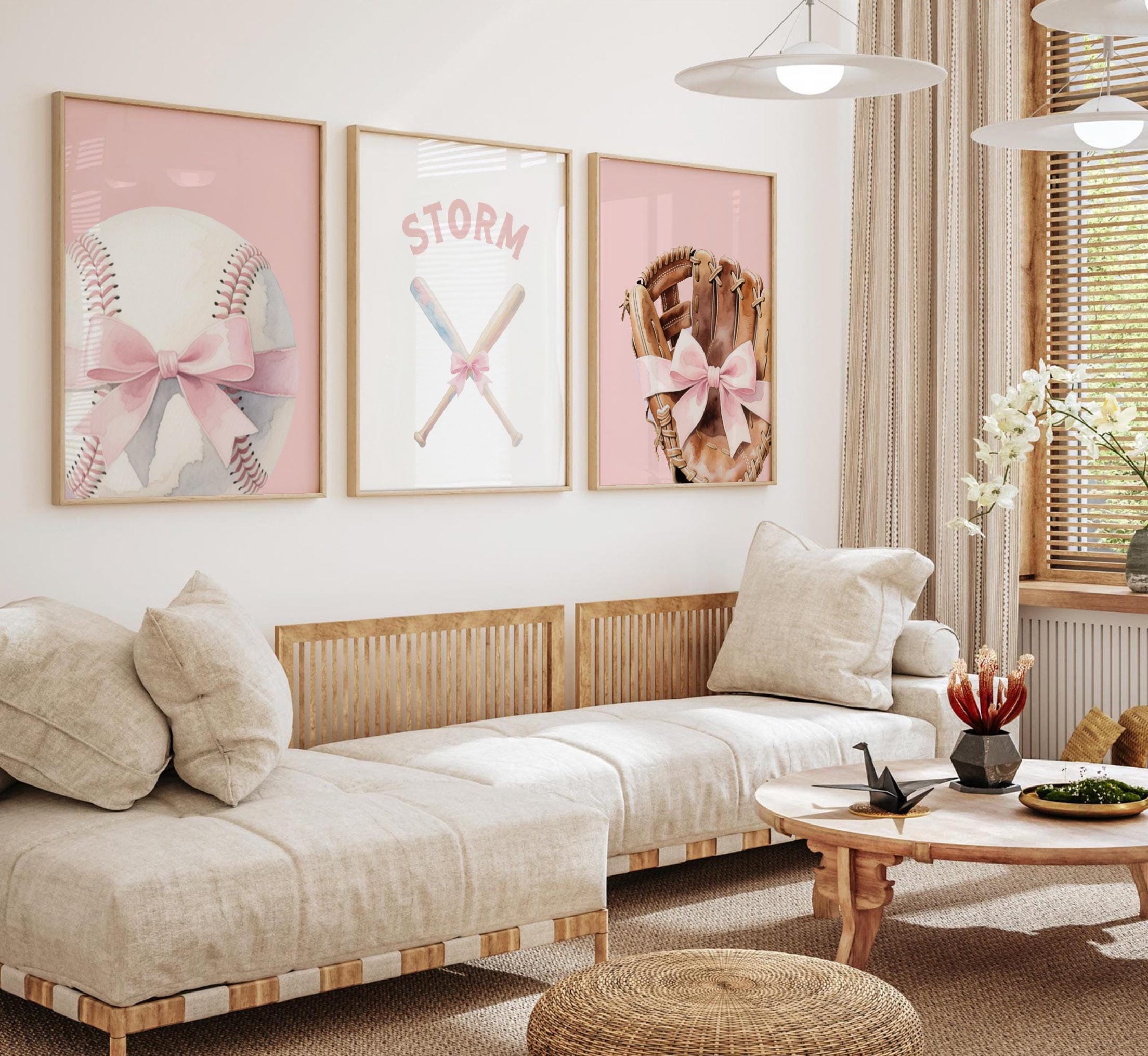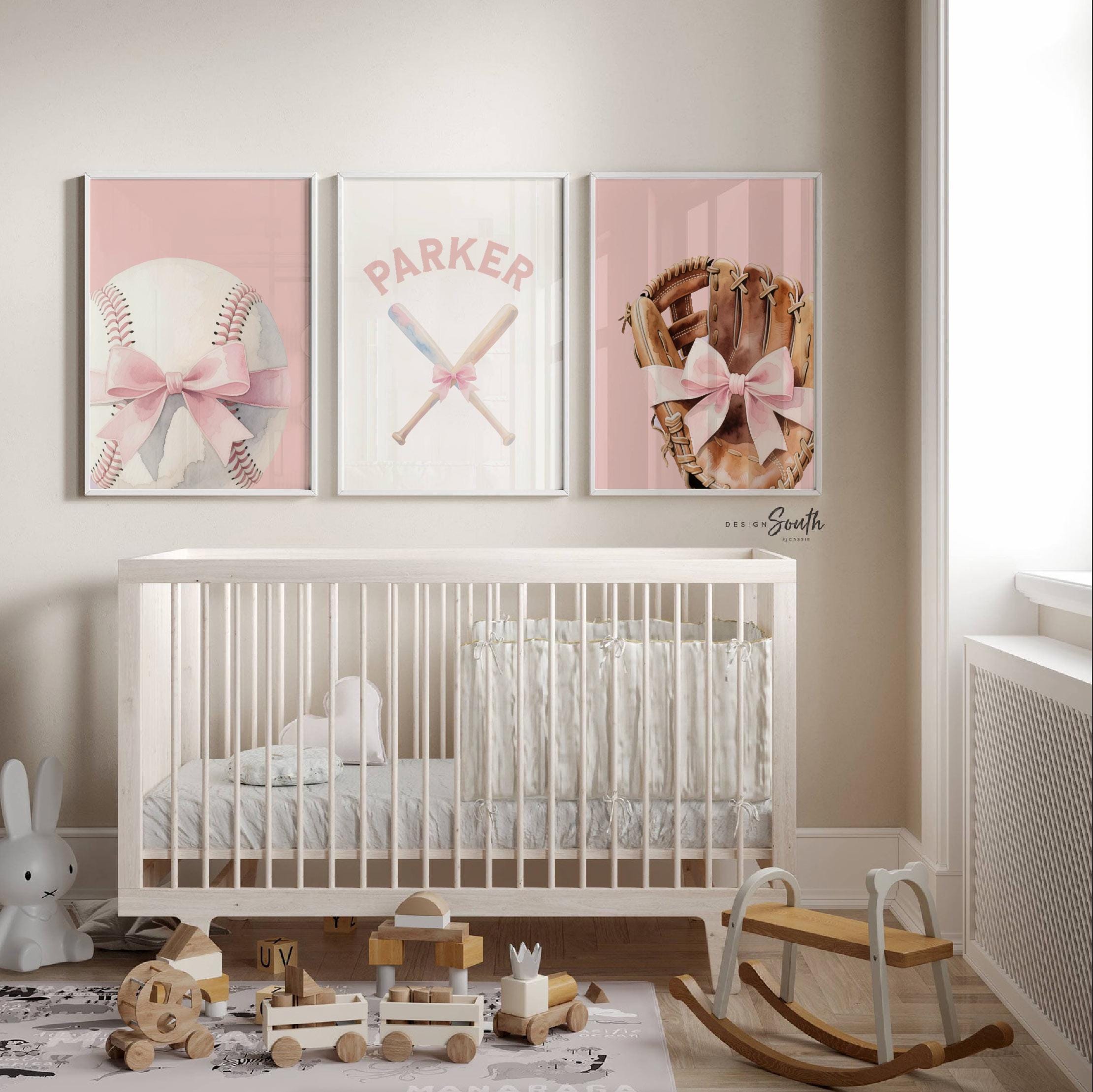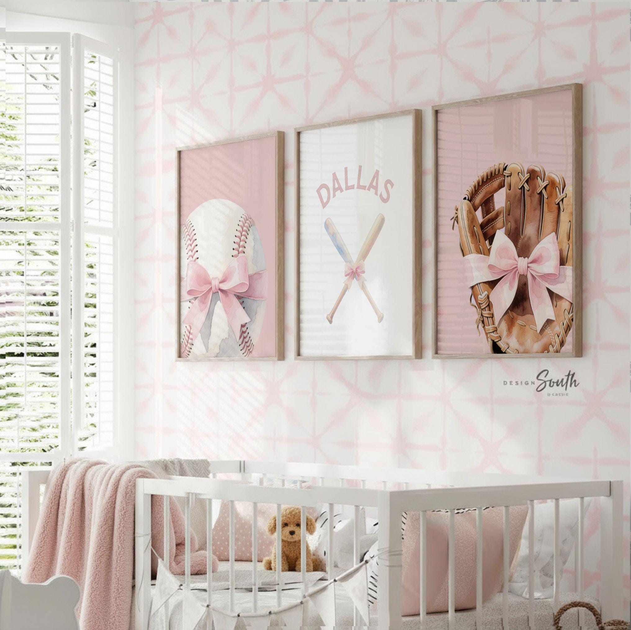 Product description: Softball theme watercolor prints in a soft pink shade including a softball, glove and bat accented with bows, and matching personalized print to be customized with your child's name. Other options are also available in my shop.